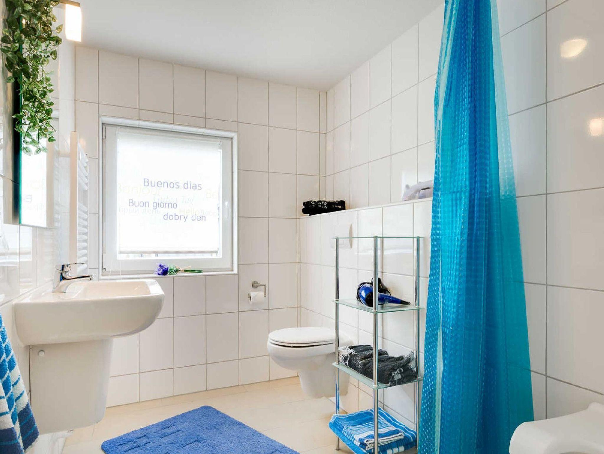- Duschbad mit Handtuchtrockner, Duschwandklappsitz, Dusche ebenerdig, Saughandgriffen, Haartrockner, erhöhtes Wand WC; Handtücher zubuchbar