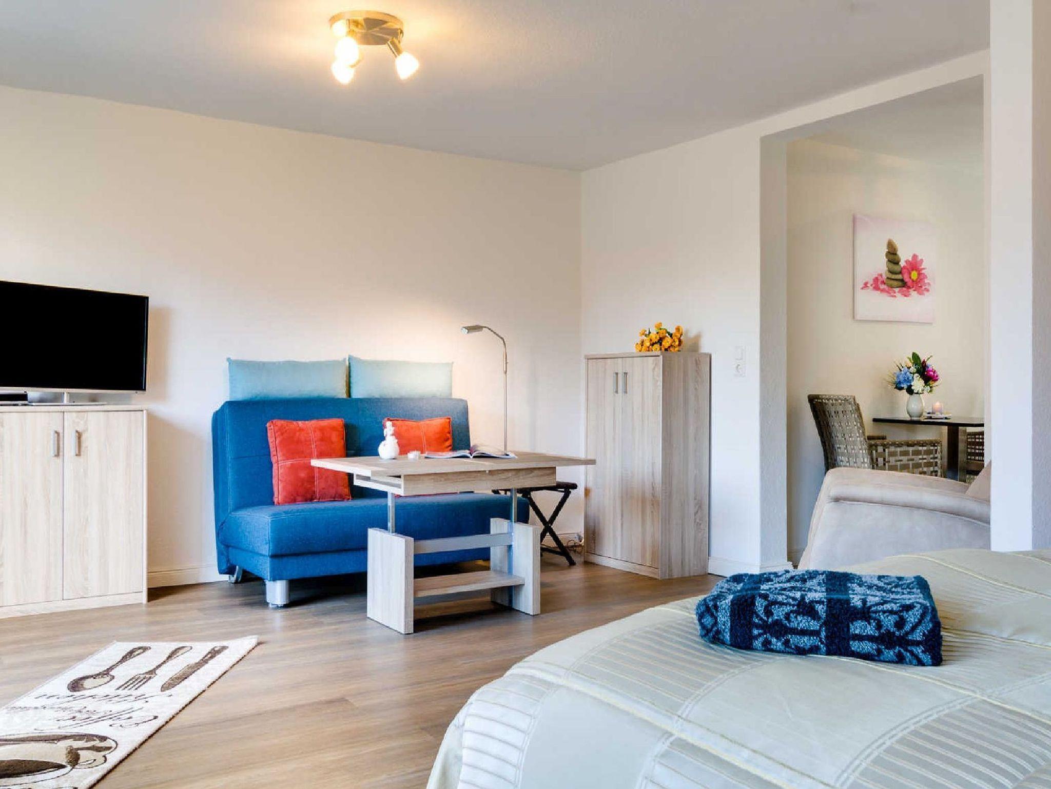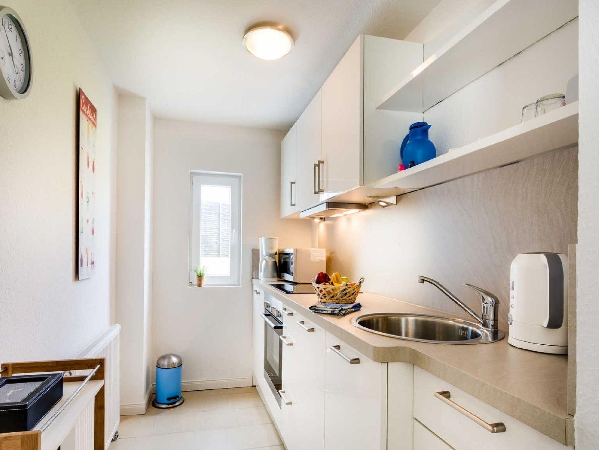 Die helle Ferienwohnung Meer (für 2 Personen) im Erdgeschoß des Ferienhauses bietet auf 45 qm einen Wohn-Schlafbereich mit Zugang zur eigenen Terrasse, eine voll ausgestate Küche, ein Duschbad und einen Flur mit Essplatz. Die Wohnung ist zudem barrierefrei gestaltet und verfügt über einen eigenen ebenerdigen Eingang.