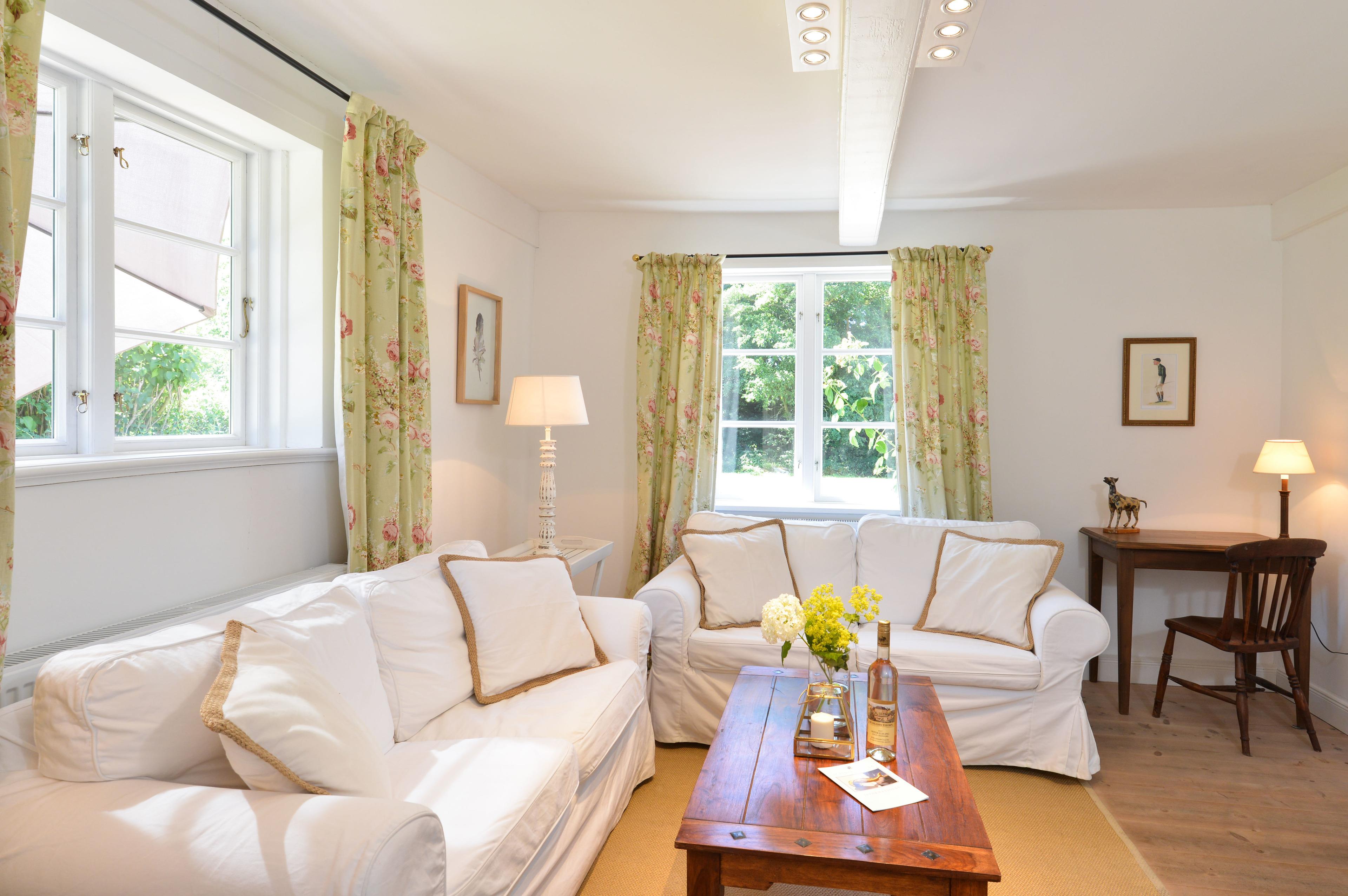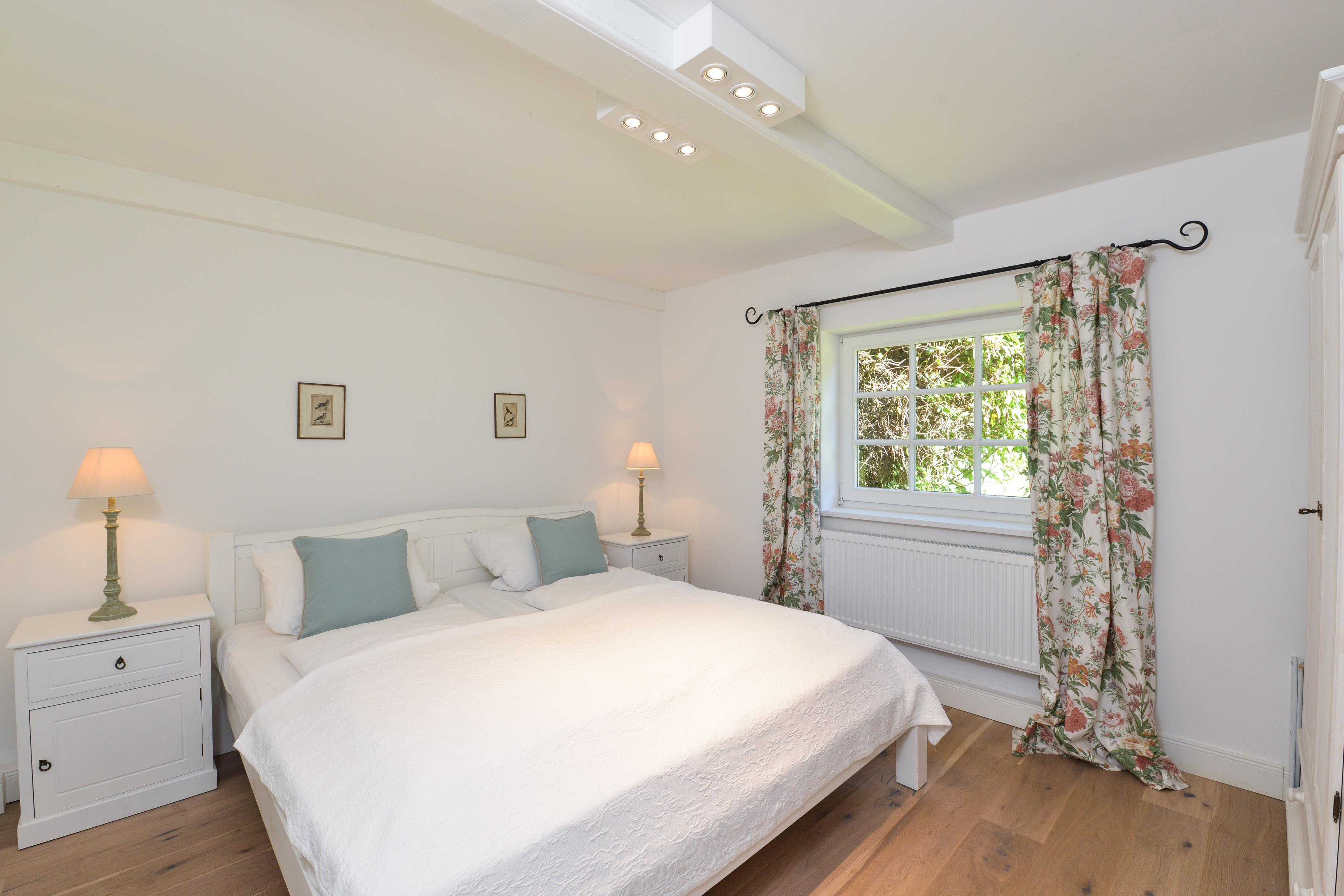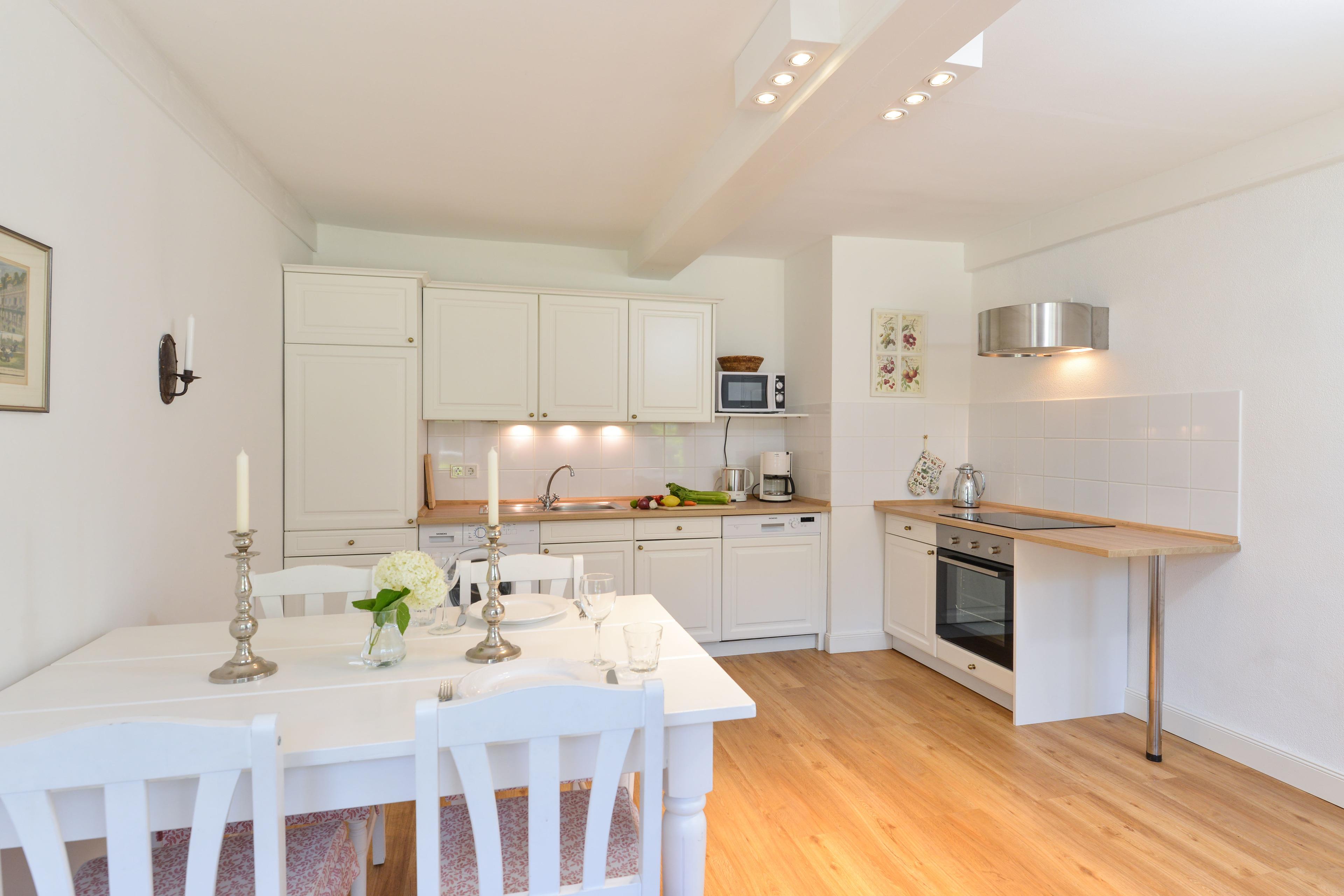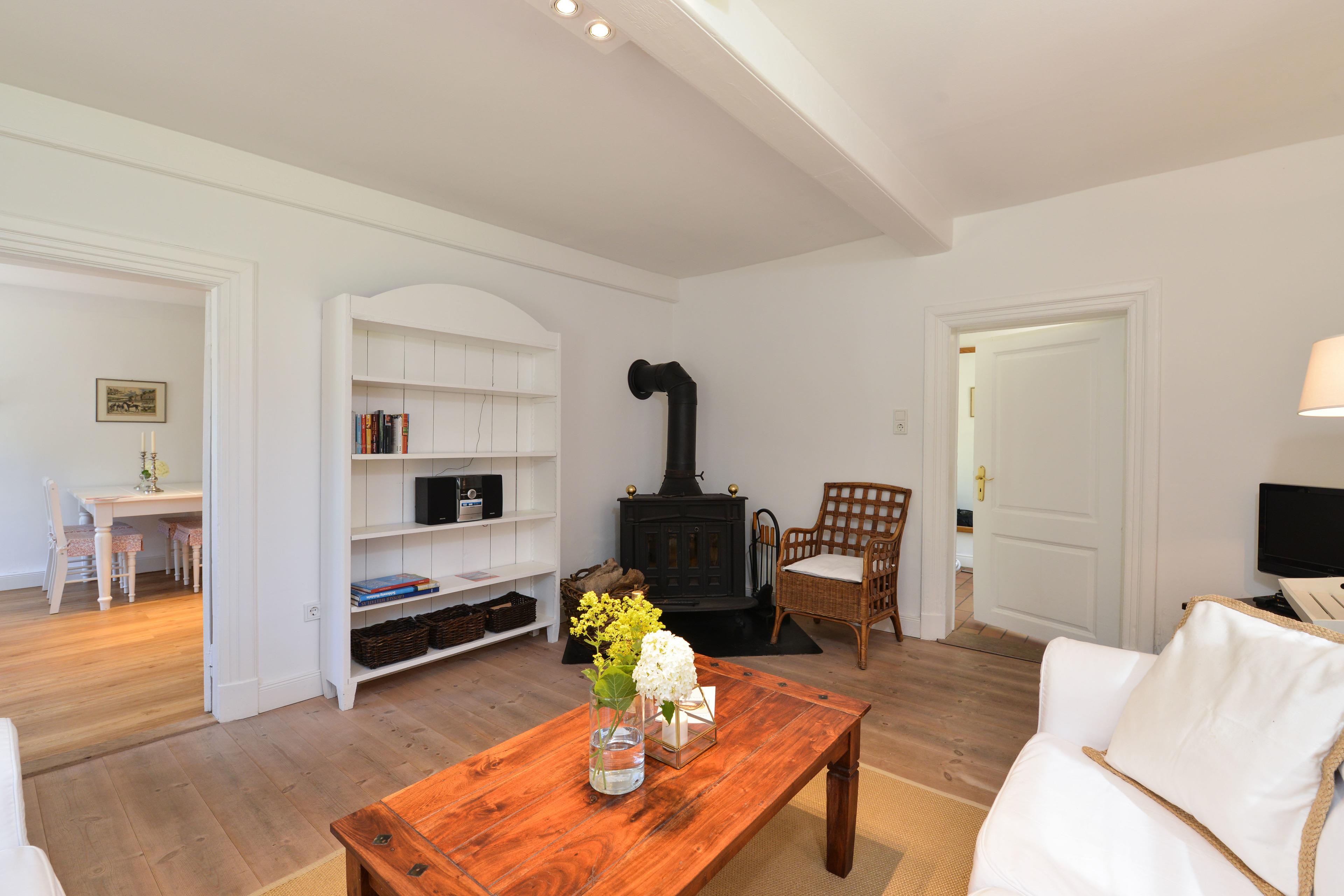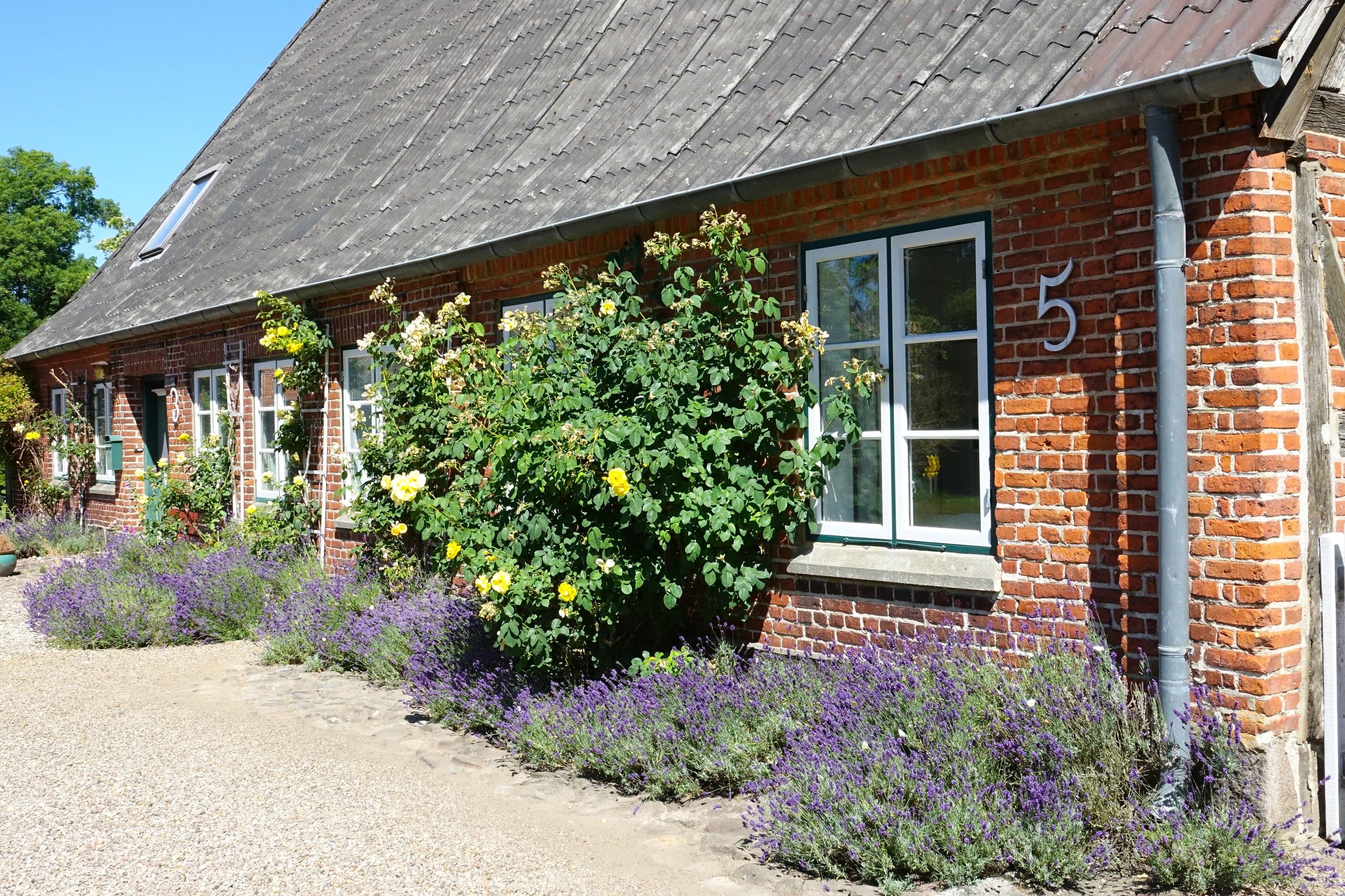 Rosen und Lavendel rahmen die Fenster dieses kleinen Häuschens im Sommer. Im Frühjahr dagegen breitet sich der Duft der Fliederhecke des Gartens über das gesamte großzügige Grundstück. Dieses kleine Fachwerkhäuschen, einst das Witwenhaus des Guts, liegt in der idyllischen Sackgasse am Schlossgraben. Nur vier Häuser mit großen, weitläufigen Gärten säumen diese Straße. So wird dieses Häuschen auch gerne als Ergänzung großen gegenübergelegenen Michels Huus hinzu gemietet um mit Freunden und Familie Zeit zu verbringen und dennoch Rückzug in diesem zauberhaften Haus zu finden. Die Lage des Schlossgraben besticht durch die ländliche Idylle, aber dennoch fußläufige Lage zum Dorf Gelting und die gute Erreichbarkeit der Strände der Geltinger Bucht in Wackerballig, Falshöft und Pottloch und des einzigartigen Naturschutzgebiets Geltinger Birk.