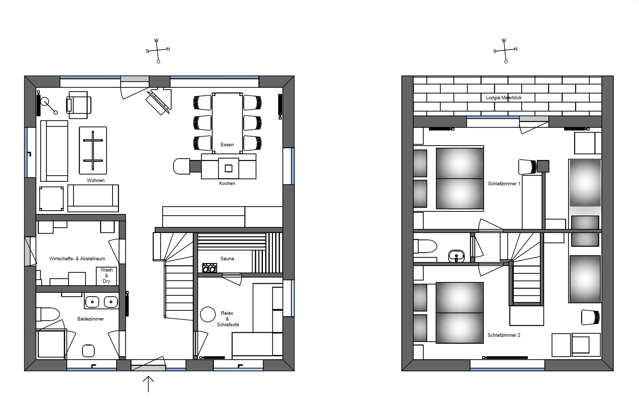 Das Erdgeschoss ist aufgeteilt in Flur, kleinen Wellnessraum mit Sauna und zusätzlichem 2er-Schlafsofa, Badezimmer mit Dusche und Doppelwaschtisch, praktischen Hauswirtschaftsraum mit Waschtrockner und das lichtdurchflutete Wohnzimmer. Dieses bietet aufgrund des leicht abfallenden Grundstücks aus jeder Perspektive -von der Sofaecke mit Kamin, der offenen Küche mit angeschlossenem Essbereich- einen wunderschönen Blick auf die Ostsee.