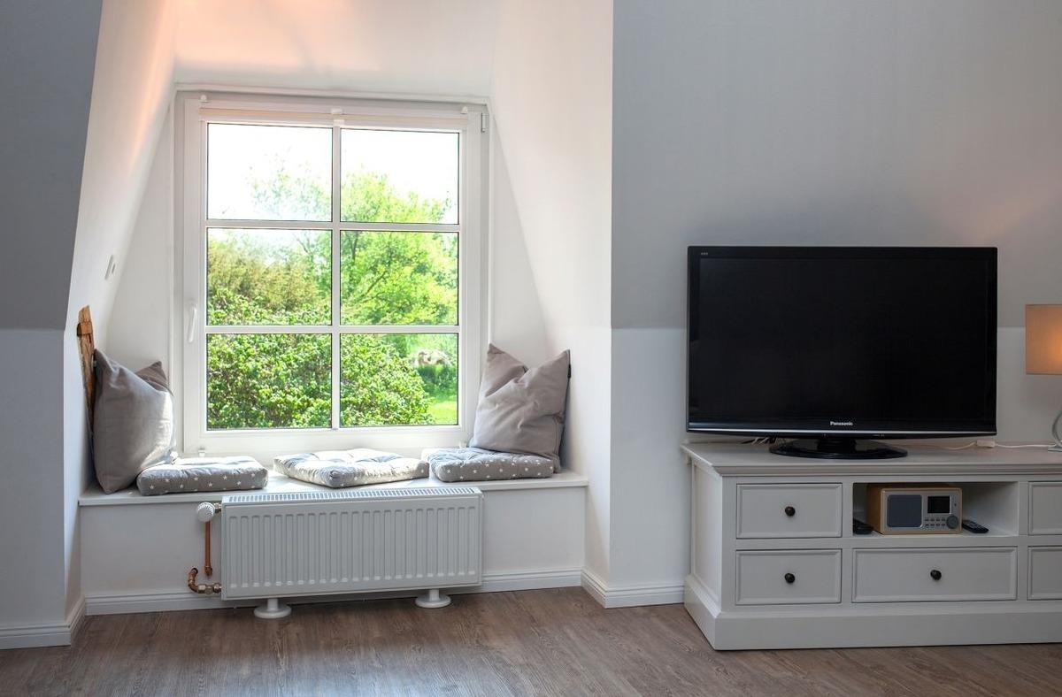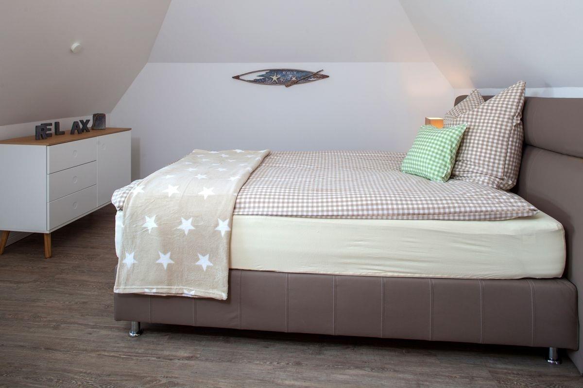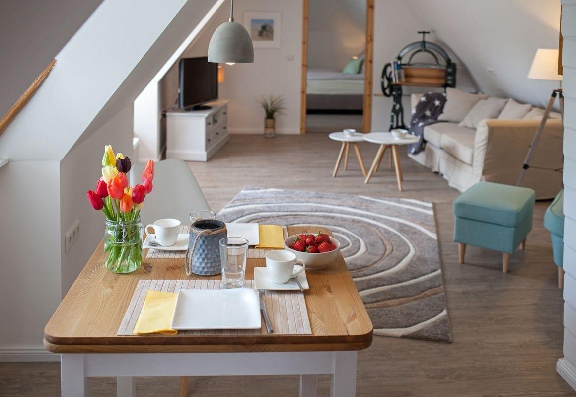 Die Ferienwohnung liegt im ersten Stock des Reetdachhauses mit idyllischem Blick über Koppeln und Wiesen. Diese ist im Mai 2018 neu entstanden und verfügt über ein Boxspring Doppelbett, WLAN, TV, Internetradio, moderne voll ausgestattete Küche mit Geschirrspüler, Bügelbrett mit Bügeleisen, neuem Badezimmer mit Regendusche.