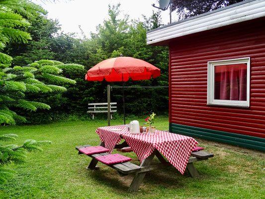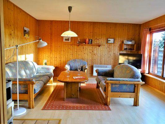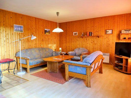 Im Wohnbereich erwarten Sie eine bequeme Couch, Sessel, Couchtisch sowie ein Fernseher (SAT) und ein Essbereich für gesellige Stunden.