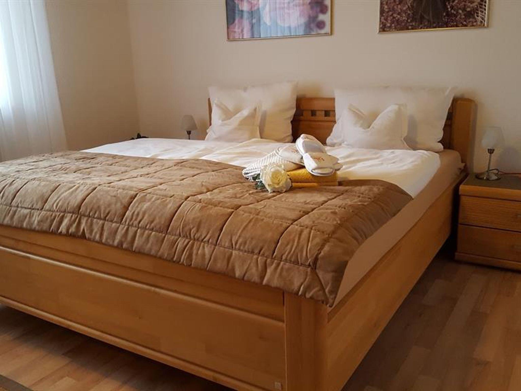 1 Schlafzimmer mit Doppelbett (180×200 cm) zwei getrennten Matratzen, 3-Türen-Kleiderschrank. Geschmeidige Einziehdecken mit kuschelweicher Füllung, auch für Hausstauballergiker geeignet. Auf Wunsch kann ein Kinder/Reisebett mit Bettwäsche zugestellt werden.