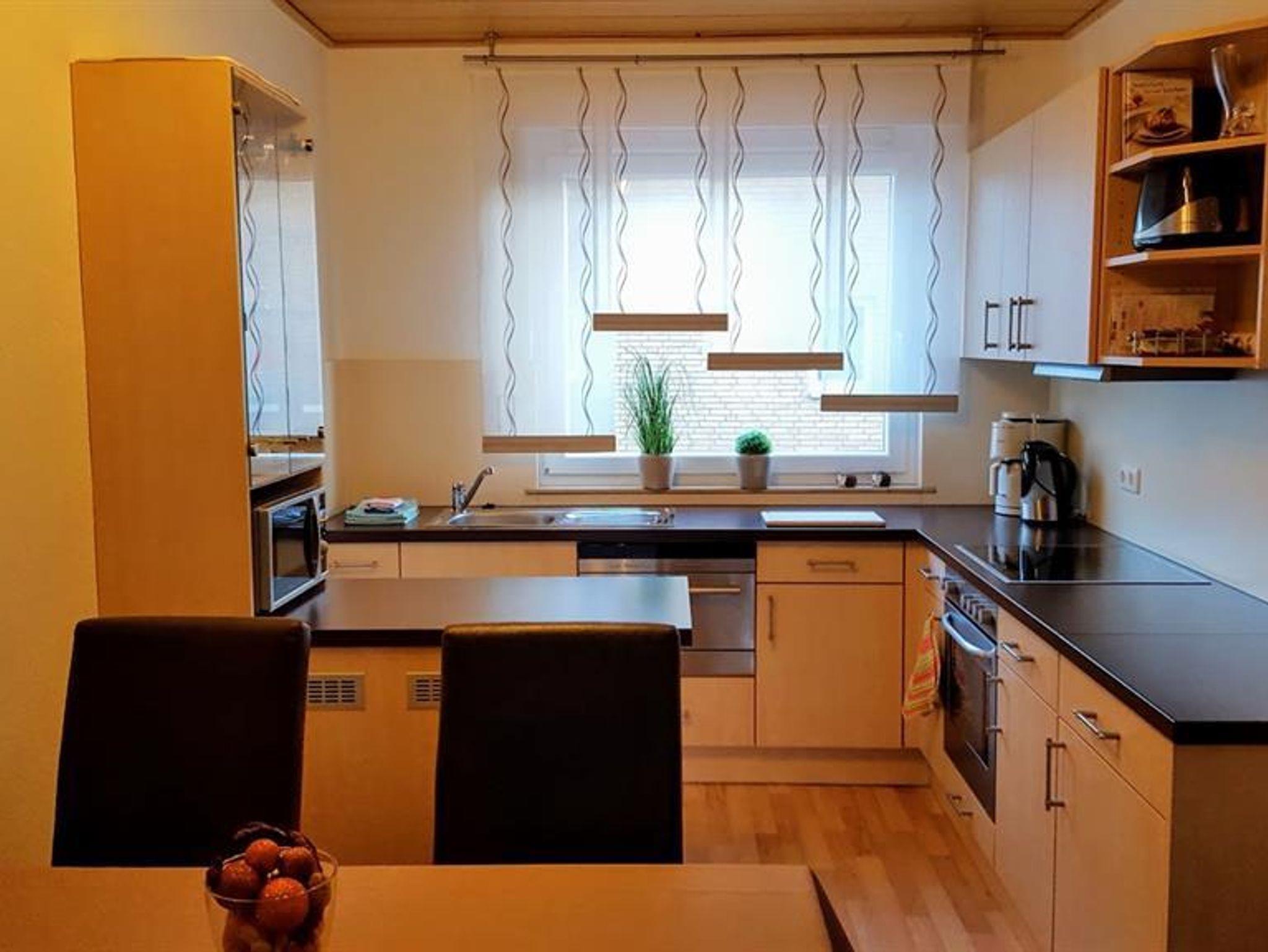Moderne Einbauküche mit Essecke für 4 Personen, Herd und Backofen mit Dunstabzugshaube, Kühl- und Gefrierschrank, Kaffeemaschine, Wasserkocher, Eierkocher, Mikrowelle, Mixer, Spülmaschine, Kleinigkeiten wie z.B. Salz, Gewürze, Spülmaschinentabs, Spül- und Küchentücher. Die Küche ist mit Kochutensilien ausgestattet, die Sie für die Zubereitung von Speisen benötigen. Ein Kinderhochstuhl ist vorhanden.