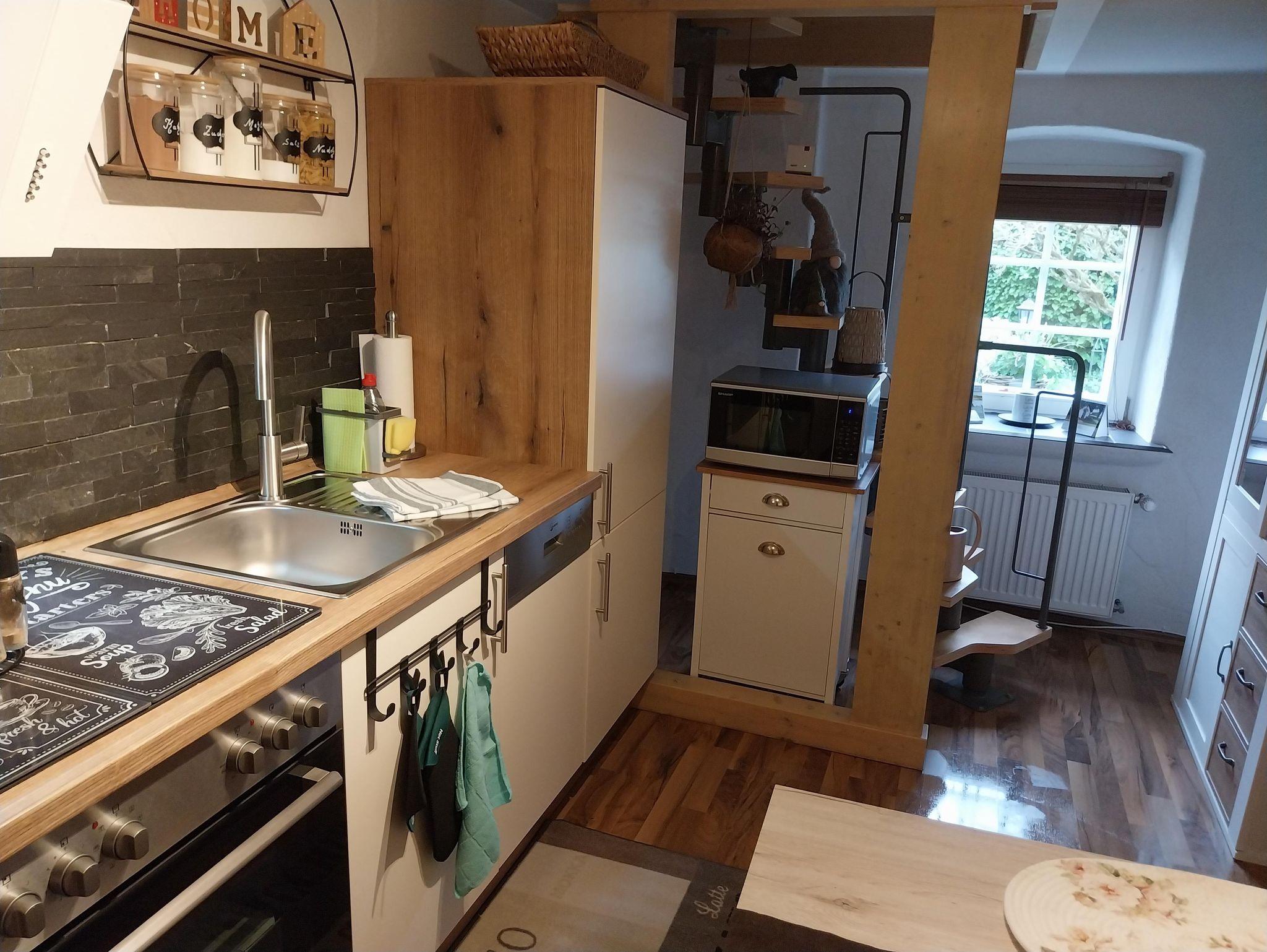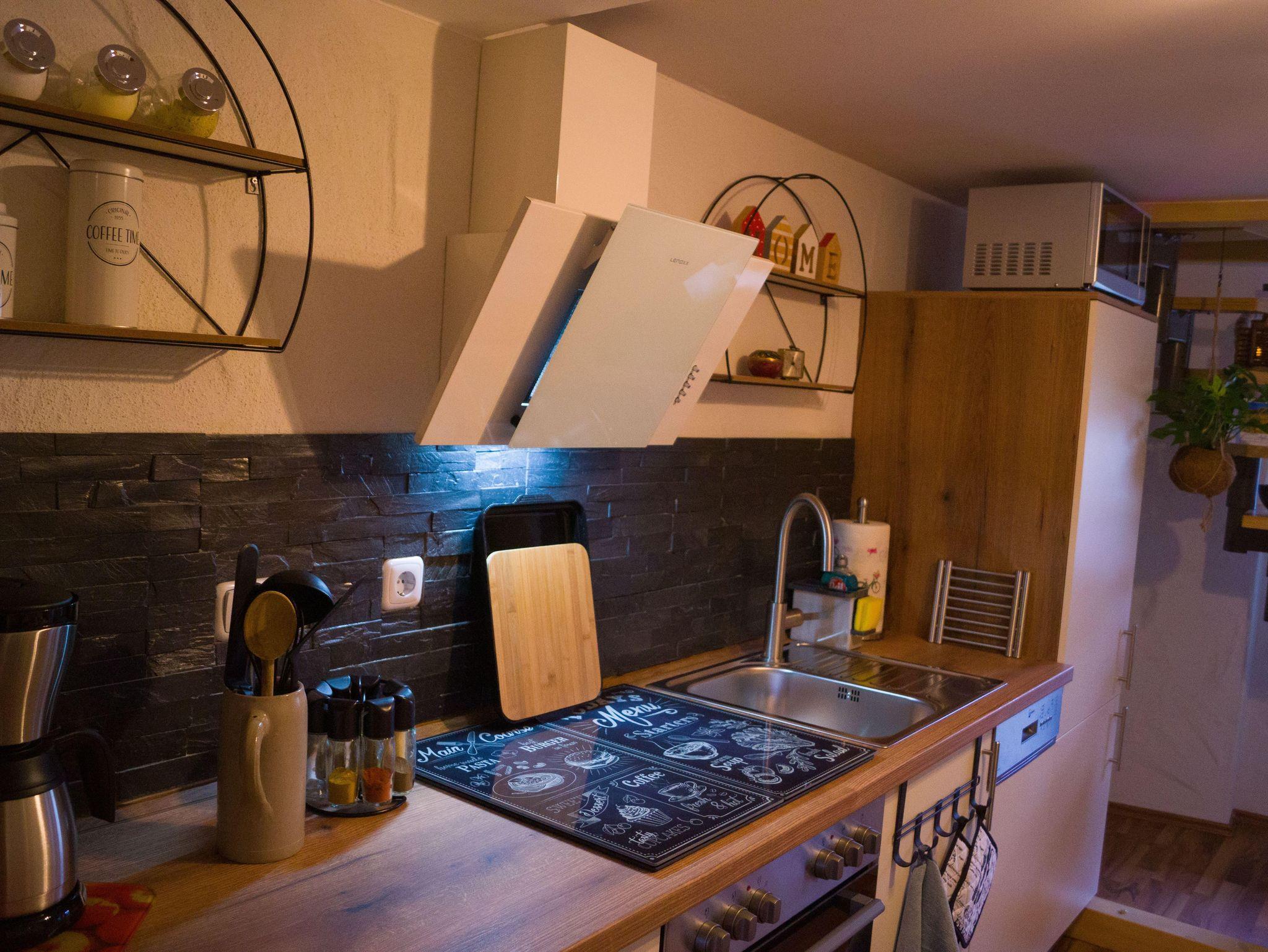 • Wohnküche mit Mikrowelle, Umluftfritteuse, Toaster, Wasserkocher, Kaffeemaschine, Geschirrspüler, Kühl-/Gefrierkombination, Elektroherd mit Ceranfeld und Umluftbackofen sowie Gewürze, Filtertüten, Servietten etc.