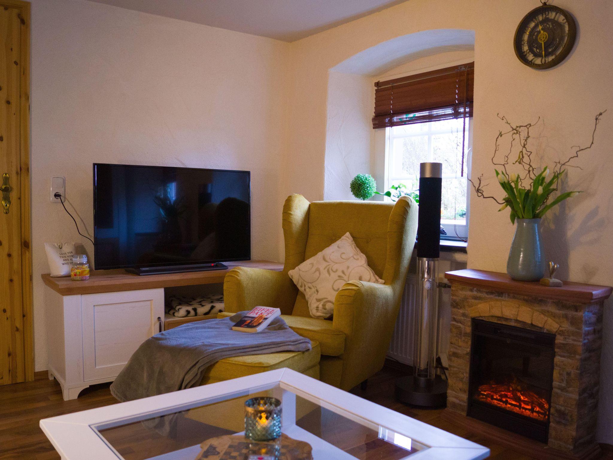 • Wohnzimmer mit Satelliten-Smart-TV, Bluetooth-Musikbox, Nostalgie-Plattenspieler mit CD und Radiofunktion, kostenloses WLAN, elektr. Kaminofen, großes gemütliches Schlafsofa mit vielen Kissen und Wolldecken, „Spiel- und Musikschrank“