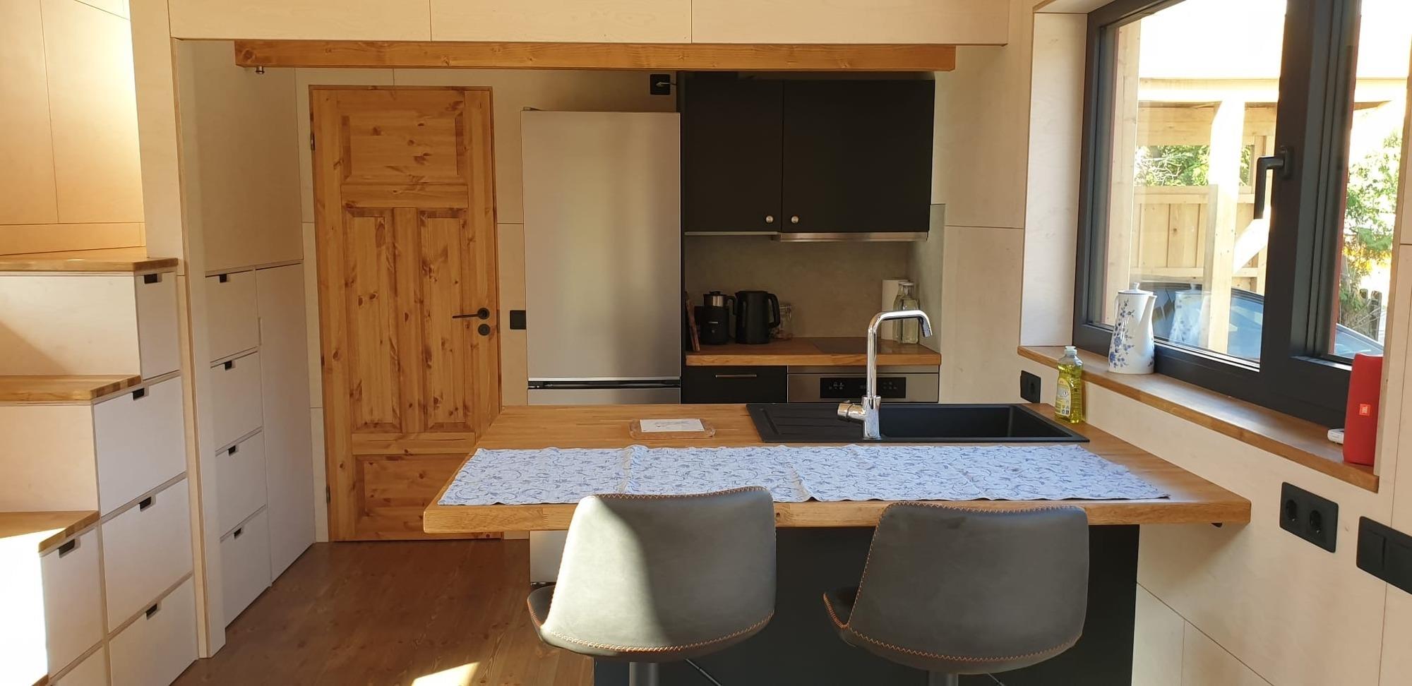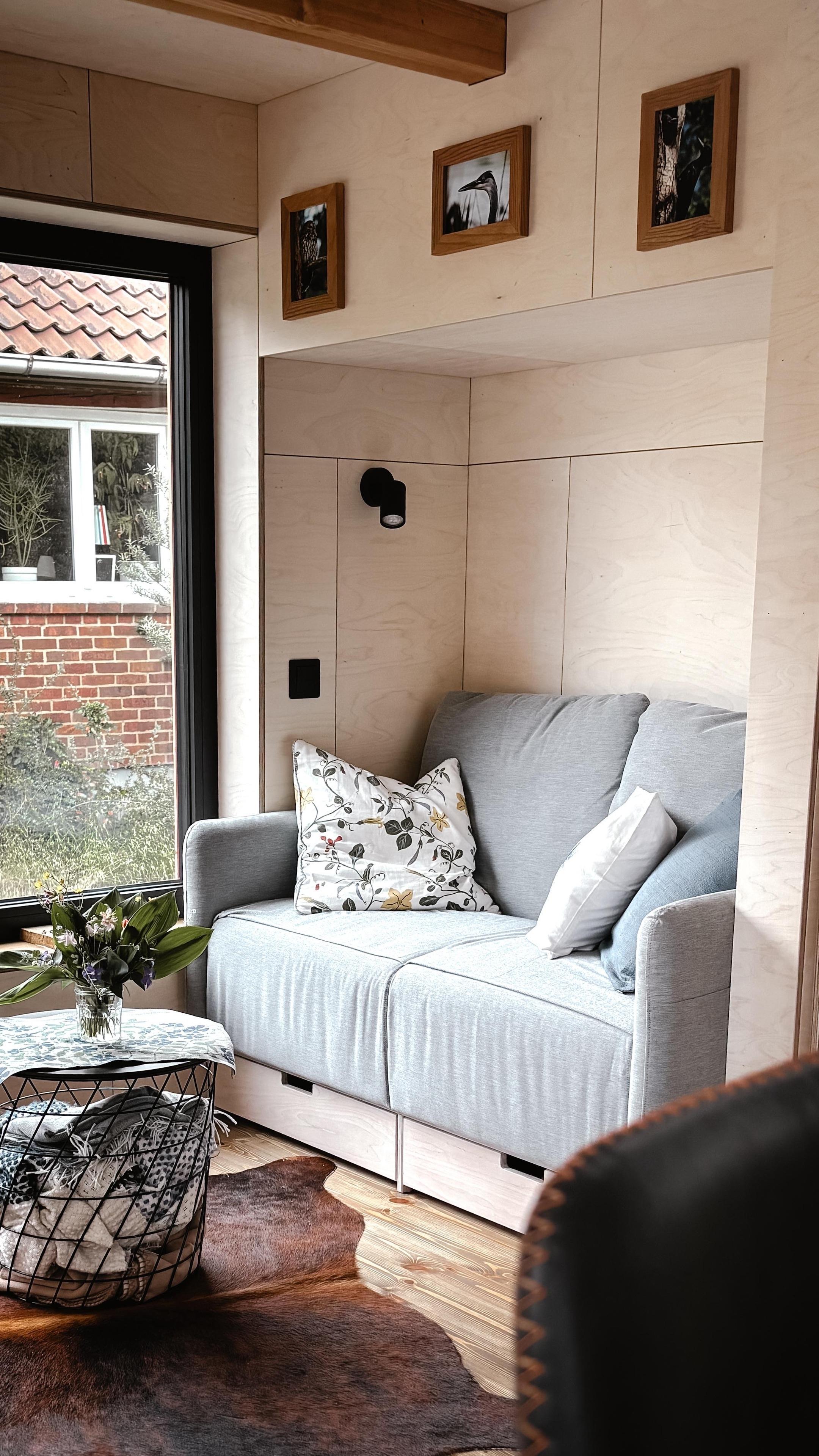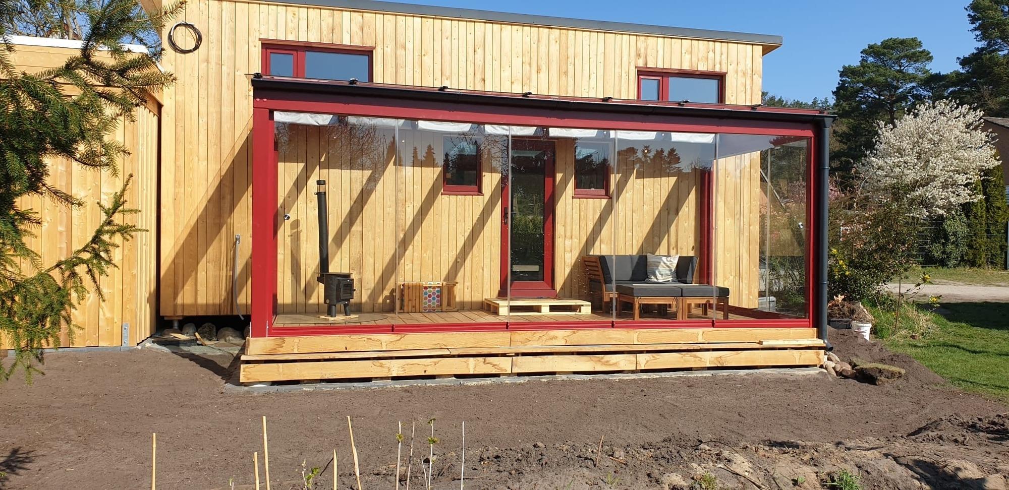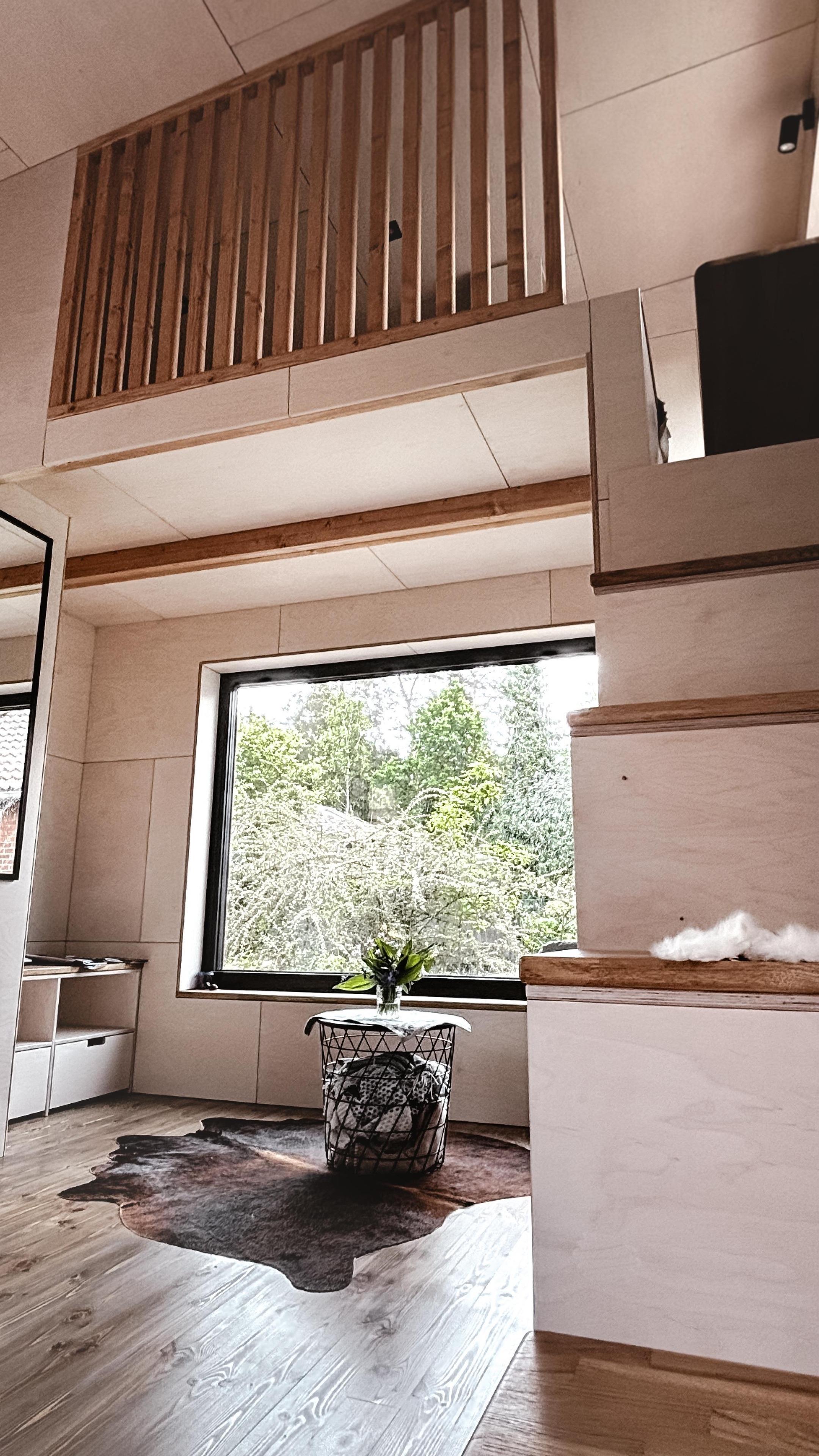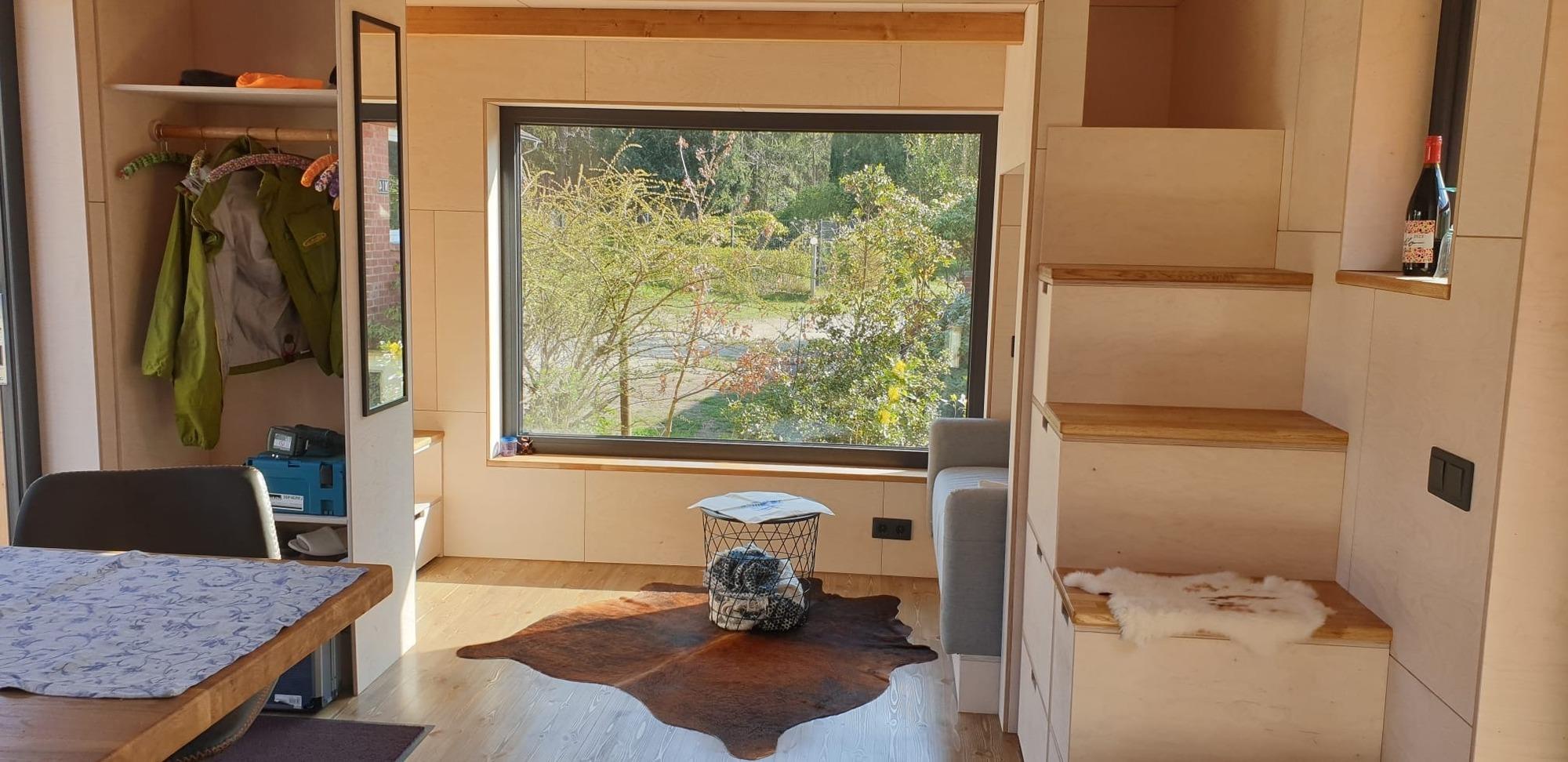 Mit viel Liebe zum Detail stilvoll eingerichtet, bietet das Tiny House auf kompakter Fläche ein durchdachtes Wohnkonzept für bis zu zwei Personen. Große Fenster und ein gemütlicher Wintergarten schaffen eine lichtdurchflutete Atmosphäre und eröffnen den Blick ins Grüne.
