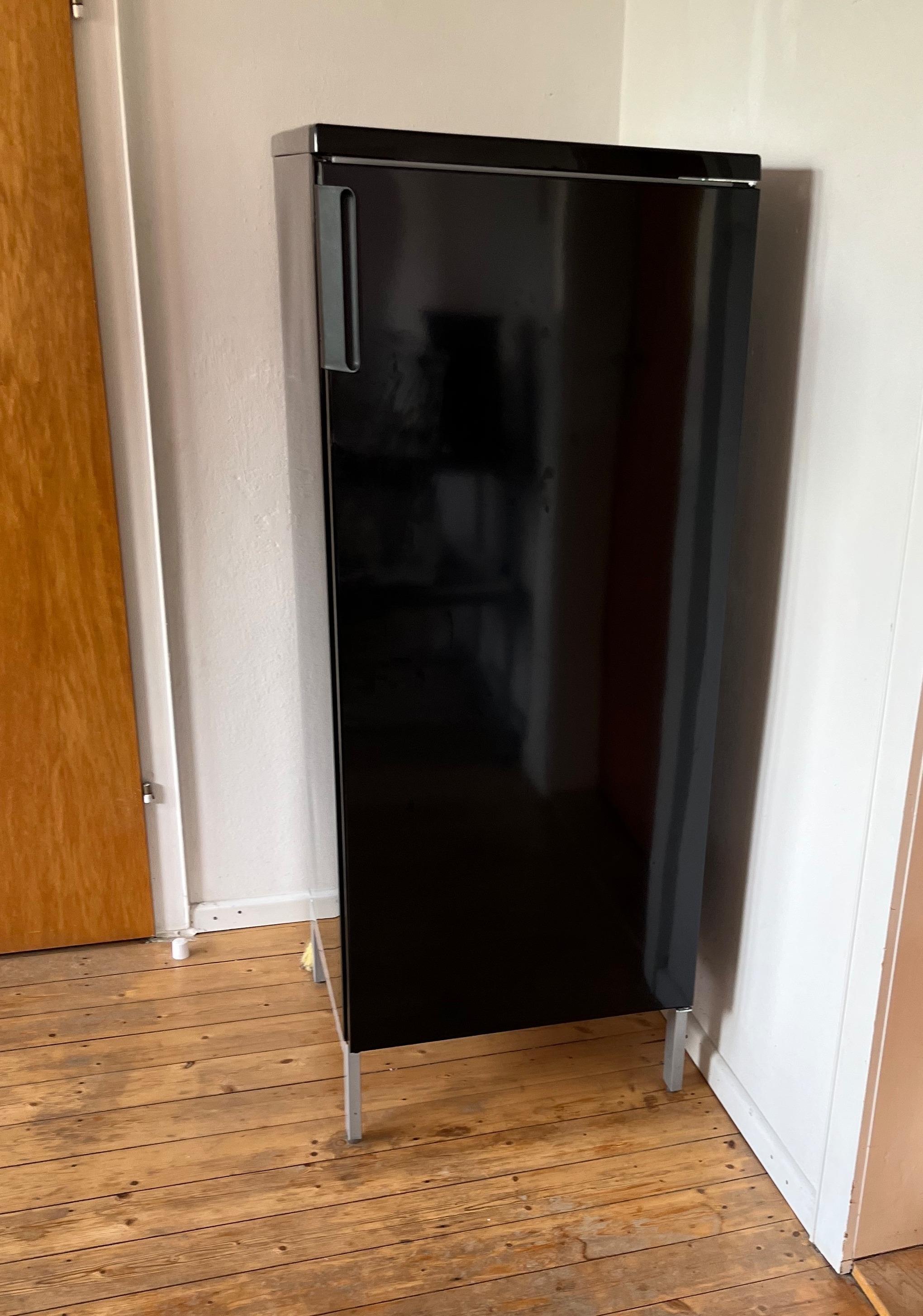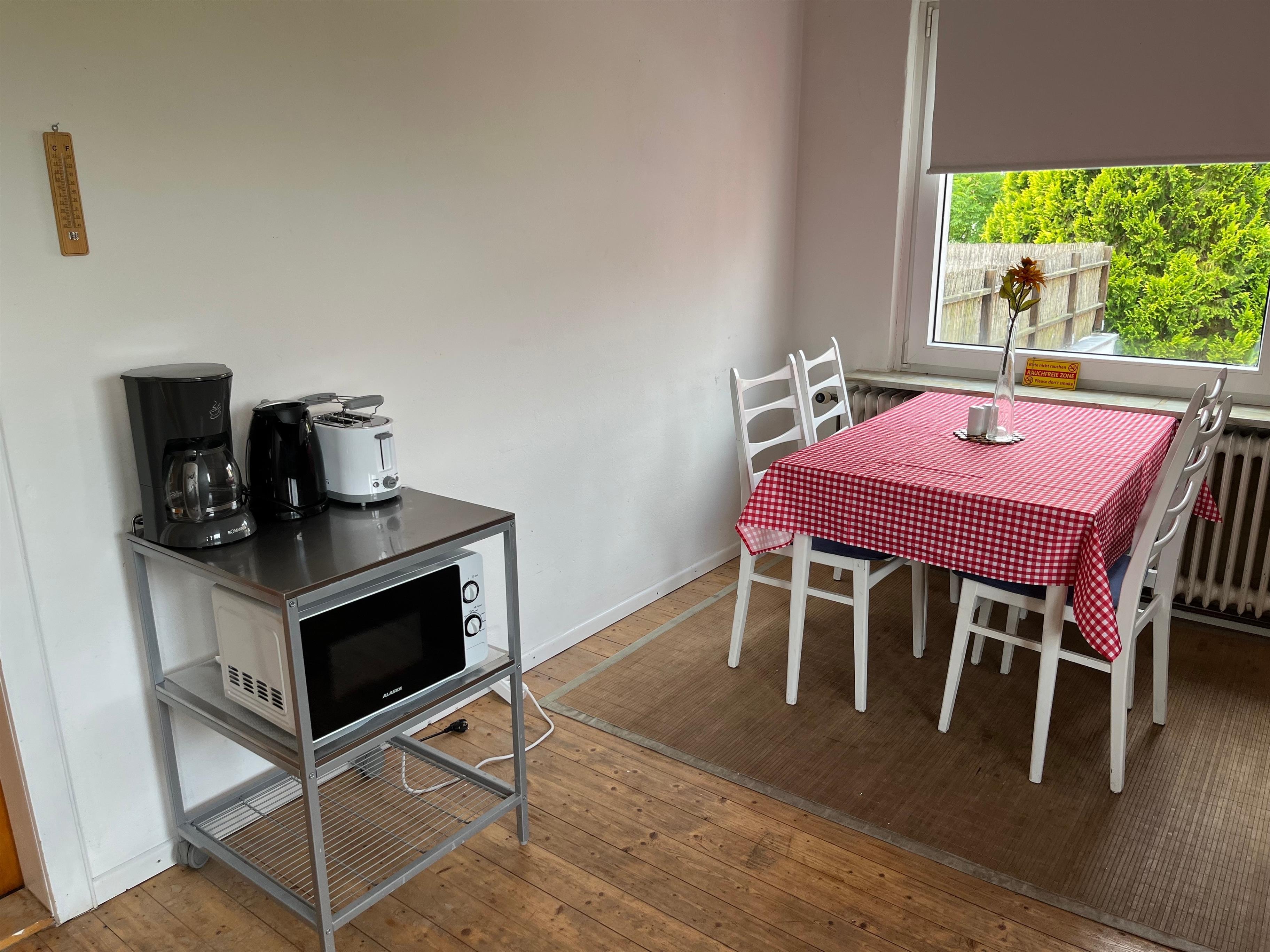 - sep. Wohnküche mit kleiner Küchenzeile (Backofen, Kühlschrank mit Eisfach, Mikrowelle, 4-Platten Herd, Wasserkocher, Kaffeemaschine), Essbereich und Sofa.