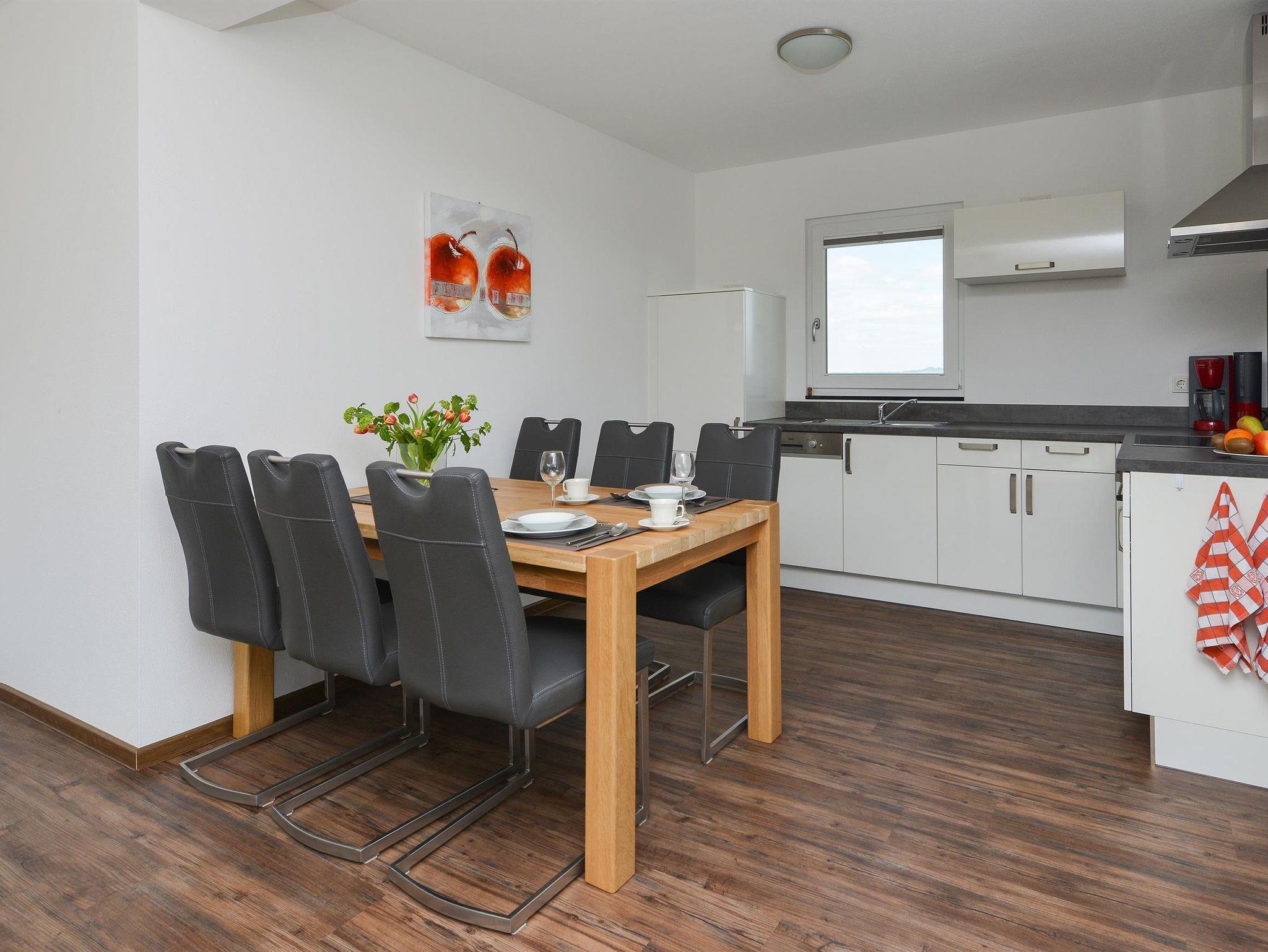 Die offene Küche verfügt über eine voll ausgestattete Küche mit ua Kaffeemaschine, Spülmaschine, Kühl-/Gefrierschrank, Kochfeld, Mikrowelle, Backofen und einer geräumigen Arbeitsplatte mit viel Arbeitsfläche. Der Ferienpark Pulvermaar hat eine Atmosphäre geschaffen, in der sich Gäste schnell wohlfühlen, In der Rezeption liegen Zeitschriften mit Informationen aus der Vulkaneifel.