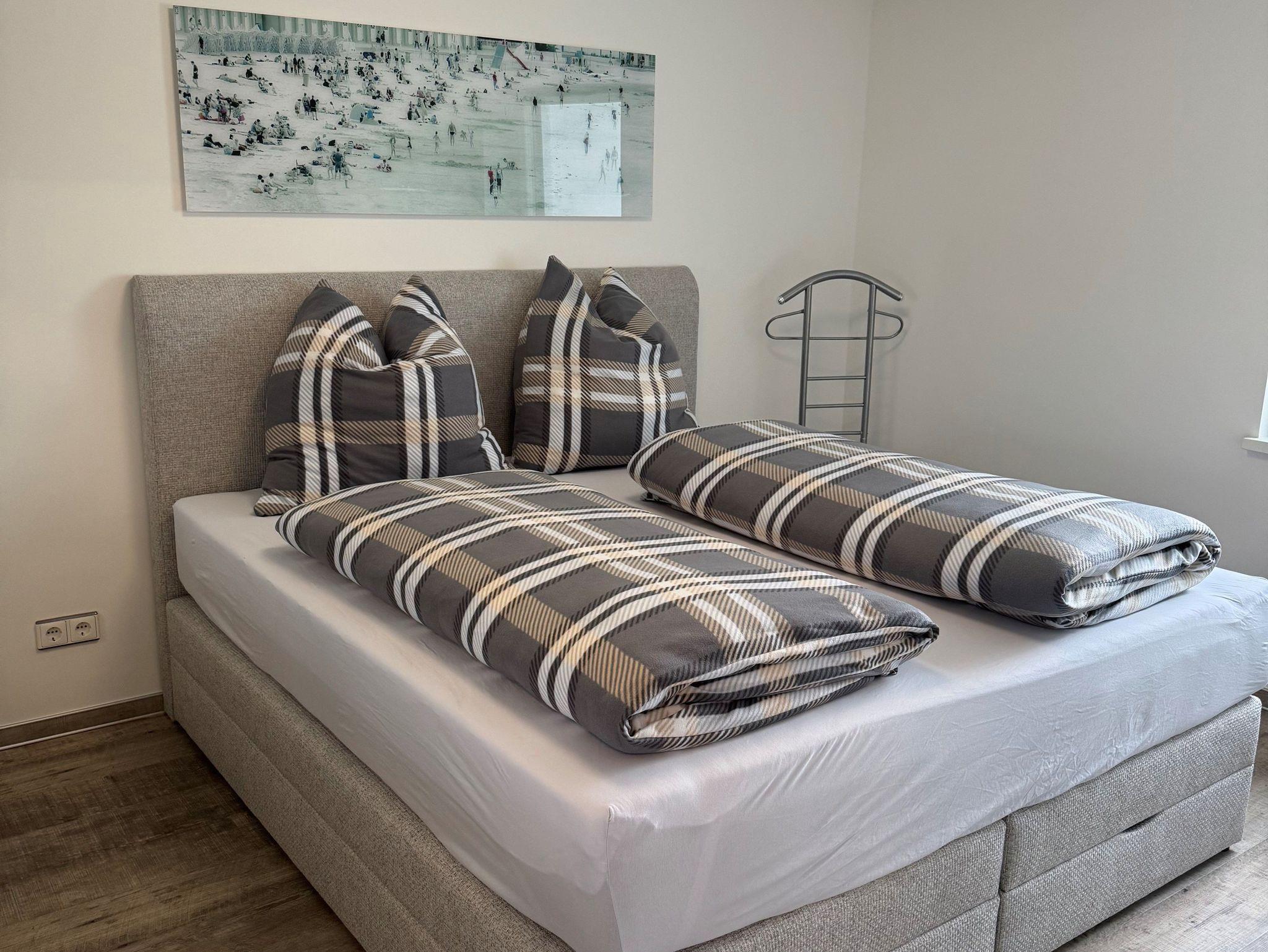 Schlafzimmer mit Boxspringbett und Kleiderschrank.