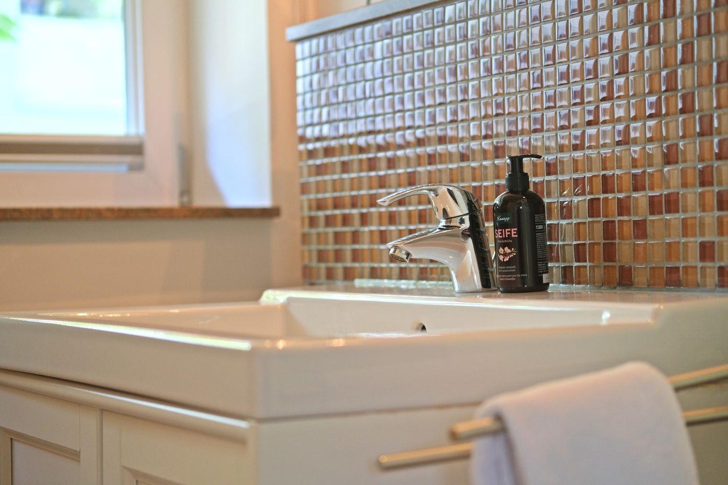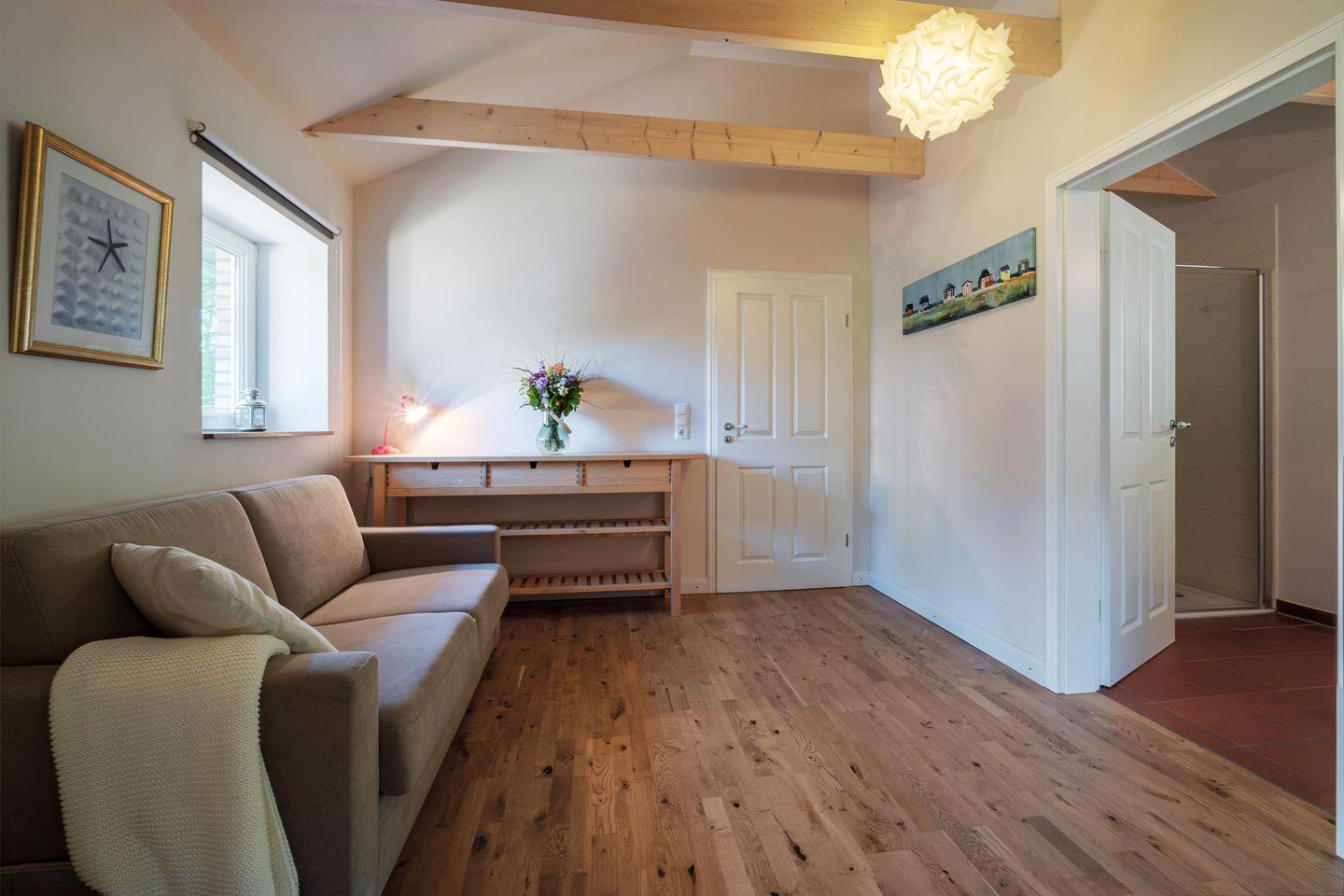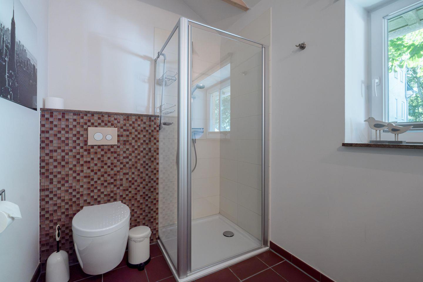 Das Tageslicht-Badezimmer verfügt über eine ebenerdige Dusche, ein WC und einen Waschtisch. Das Haus ist mit einer Fußbodenheizung ausgestattet, die auch im Herbst oder Winter für wohlige Wärme sorgt.