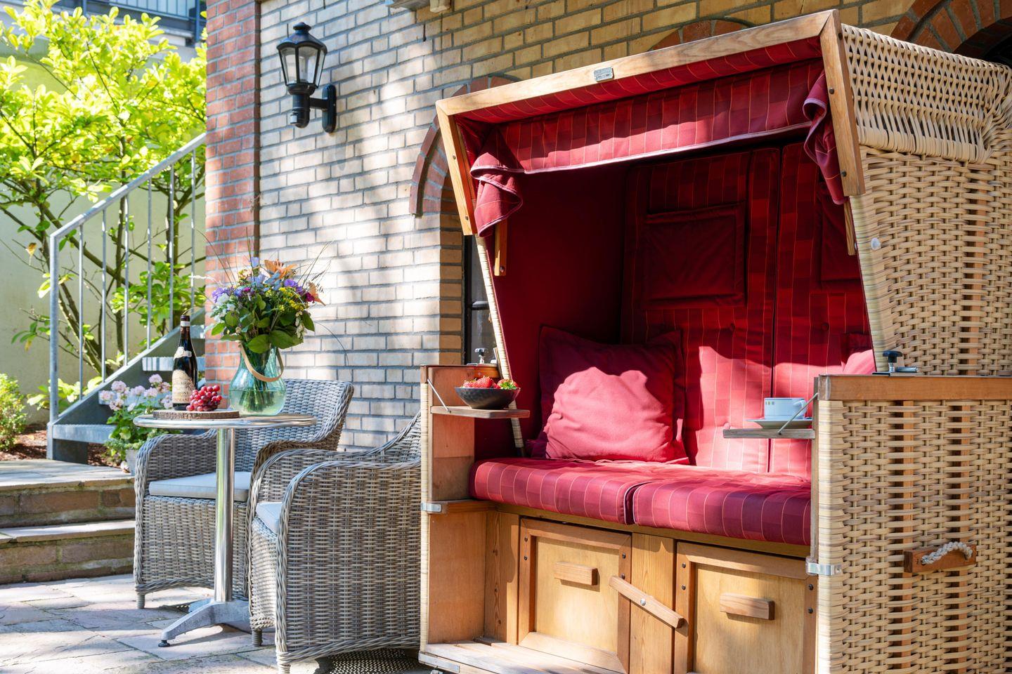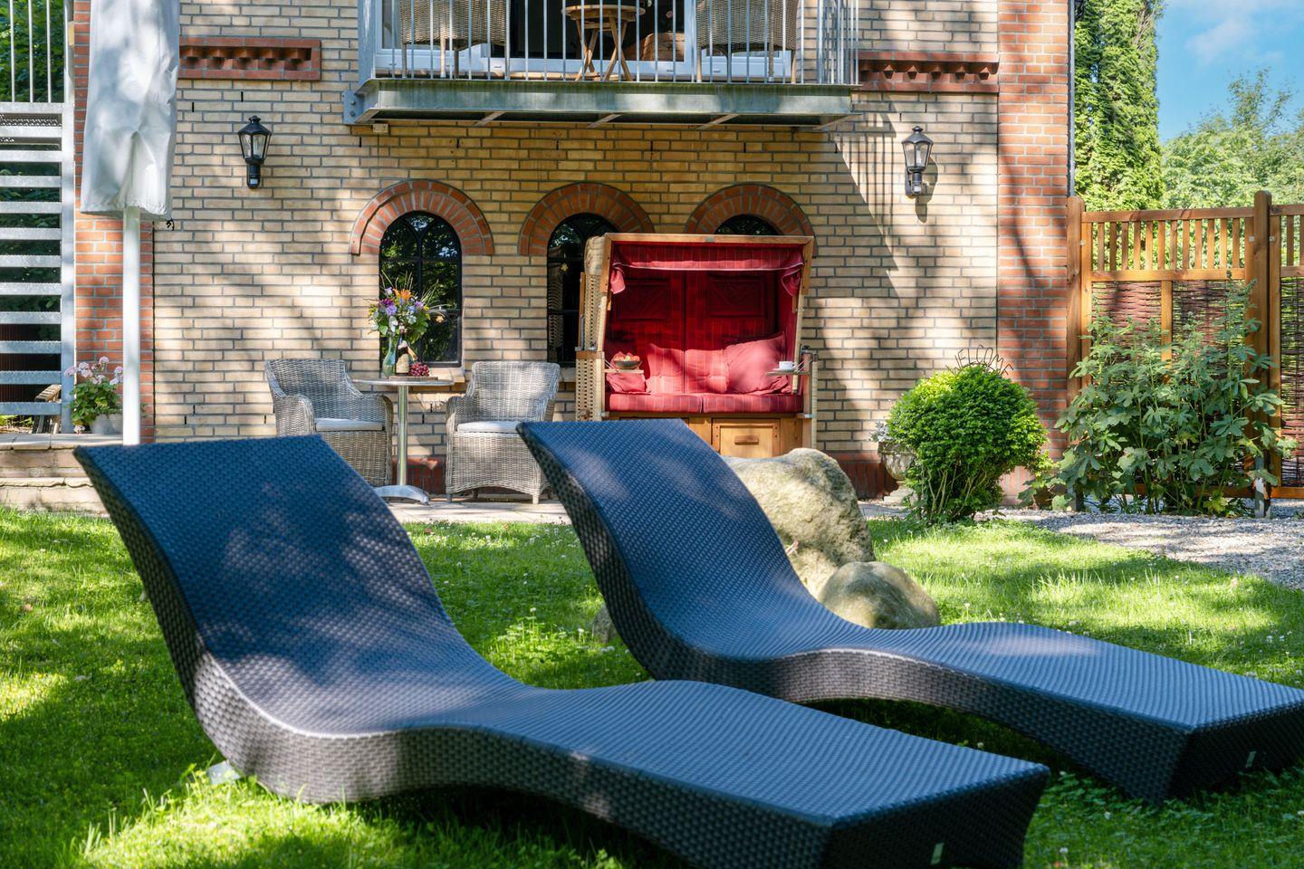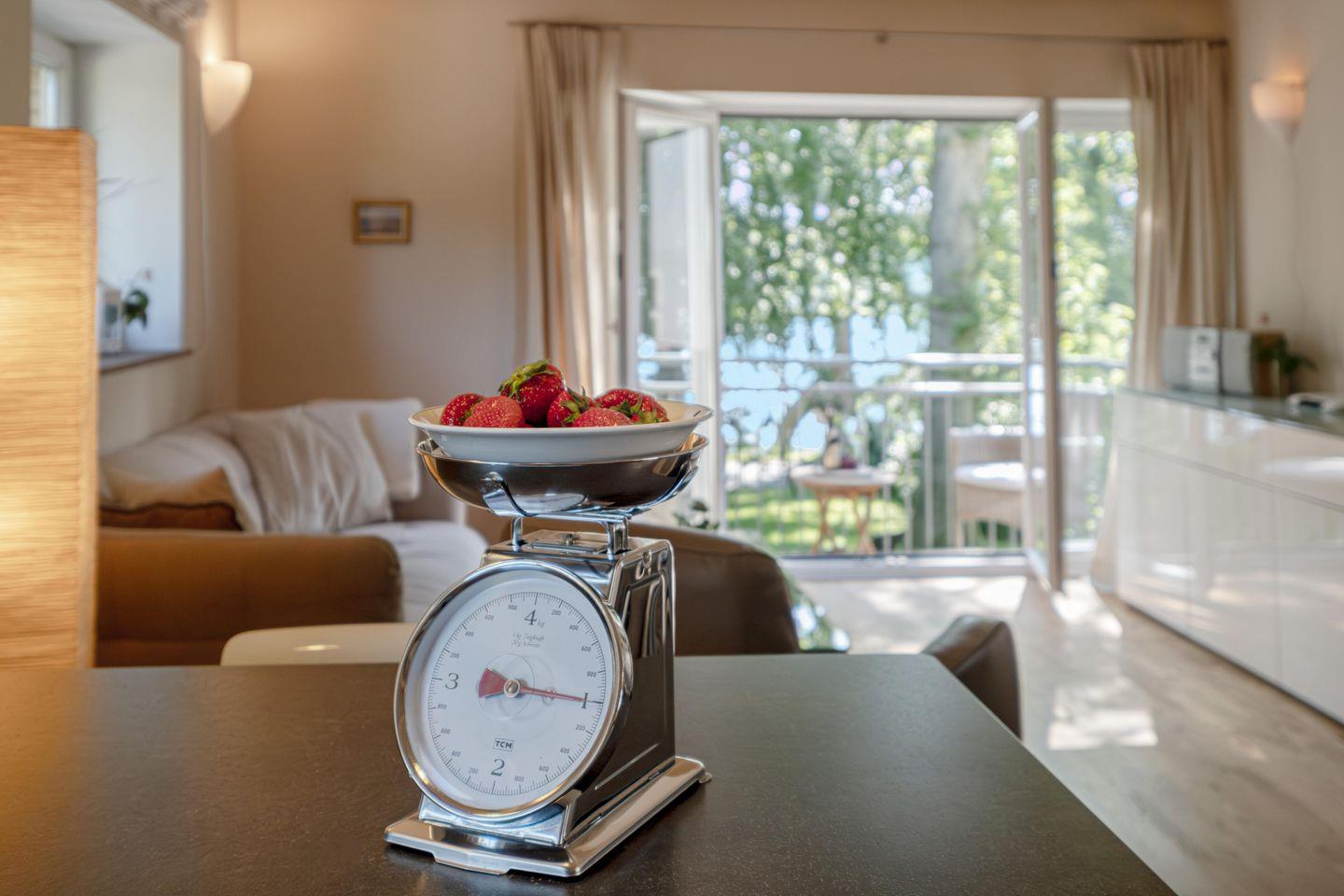 Die große, offene Küche ist vollständig ausgestattet und lässt keine Wünsche offen: Kaffeemaschine, Toaster, Mikrowelle, Geschirrspüler, Backofen, Kühlschrank und viele weitere Küchenutensilien stehen dir zur Verfügung. Der offene Essbereich lädt zu geselligen Stunden ein, und auf dem großzügigen Balkon kannst du den Abend ausklingen lassen, während du den Blick auf den schön angelegten Garten und den Teich des Glücksburger Schlosses genießt.