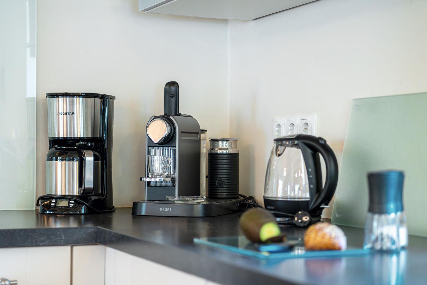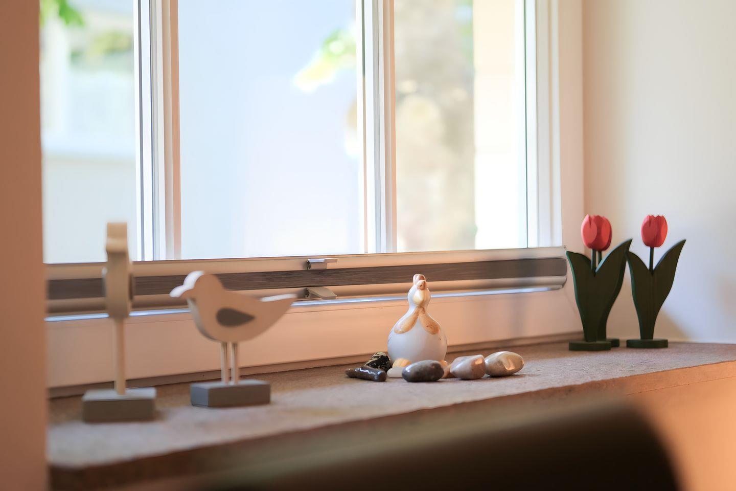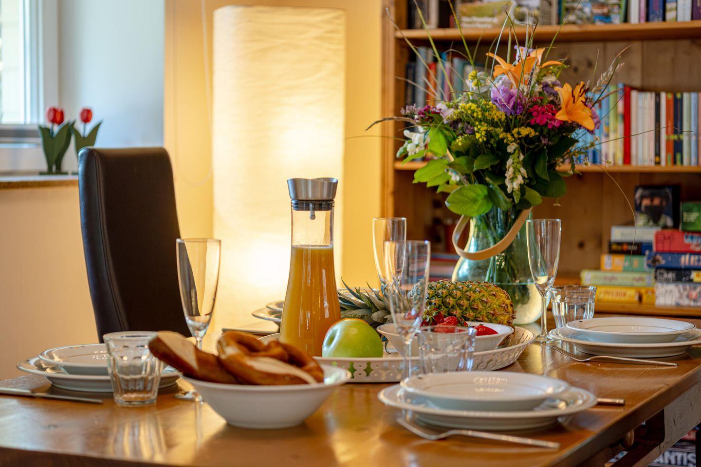 Die große, offene Küche ist vollständig ausgestattet und lässt keine Wünsche offen: Kaffeemaschine, Toaster, Mikrowelle, Geschirrspüler, Backofen, Kühlschrank und viele weitere Küchenutensilien stehen dir zur Verfügung. Der offene Essbereich lädt zu geselligen Stunden ein, und auf dem großzügigen Balkon kannst du den Abend ausklingen lassen, während du den Blick auf den schön angelegten Garten und den Teich des Glücksburger Schlosses genießt.