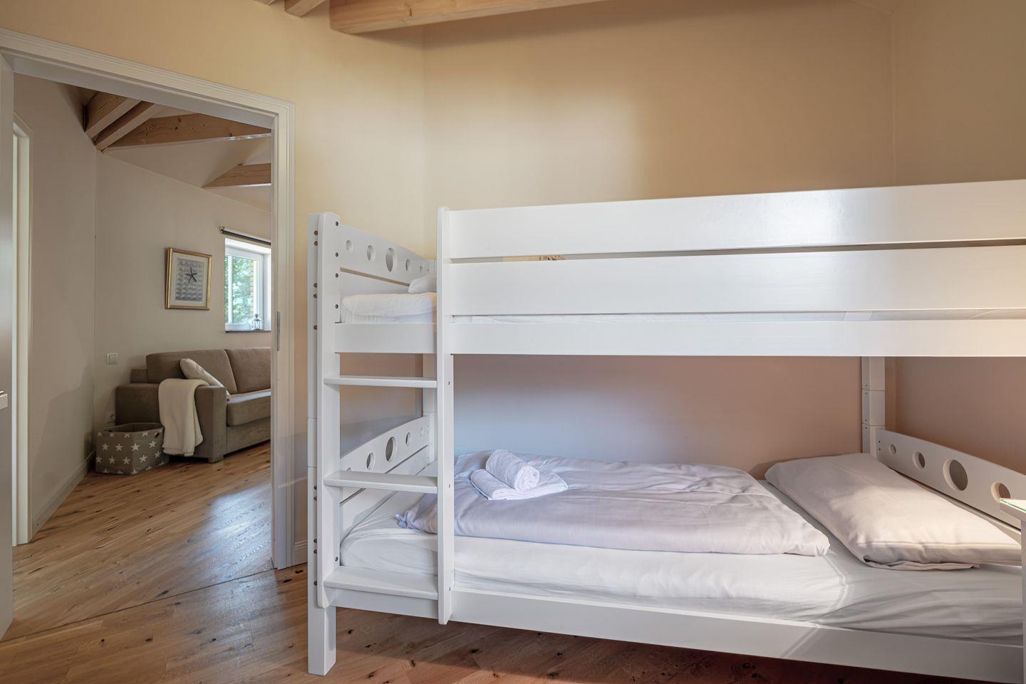 Das Haus bietet zwei separate Schlafzimmer: Das lichtdurchflutete Hauptschlafzimmer (20 qm) lädt dich ein, dich von den ersten Sonnenstrahlen wecken zu lassen und deinen Morgenkaffee im gemütlichen Doppelbett (180 x 200 cm) zu genießen. Das zweite Schlafzimmer ist mit einem Stockbett (je 90 x 200 cm) ausgestattet und bietet somit Platz für eine Familie mit Kindern oder eine Reisegruppe mit bis zu 4 Personen. Beide Schlafzimmer haben jeweils ein angrenzendes Spielzimmer – perfekt für die kleinen Gäste.