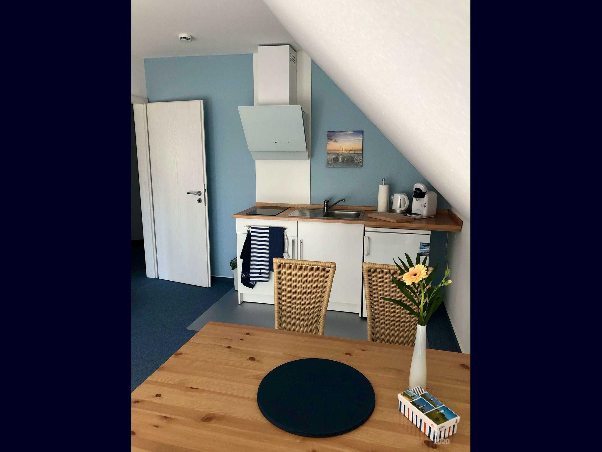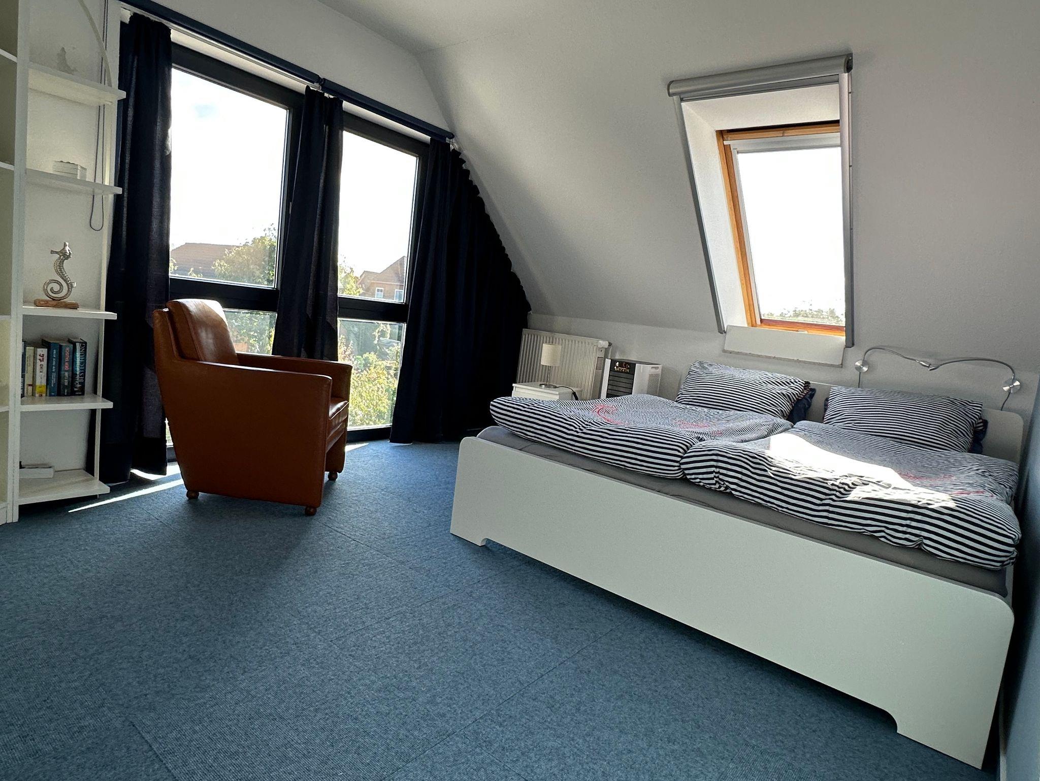 Sie wohnen in einer maritim eingerichteten Wohnung mit Gartenblick in einem ruhigen Wohngebiet im Dachgeschoss eines Einfamilienhauses.