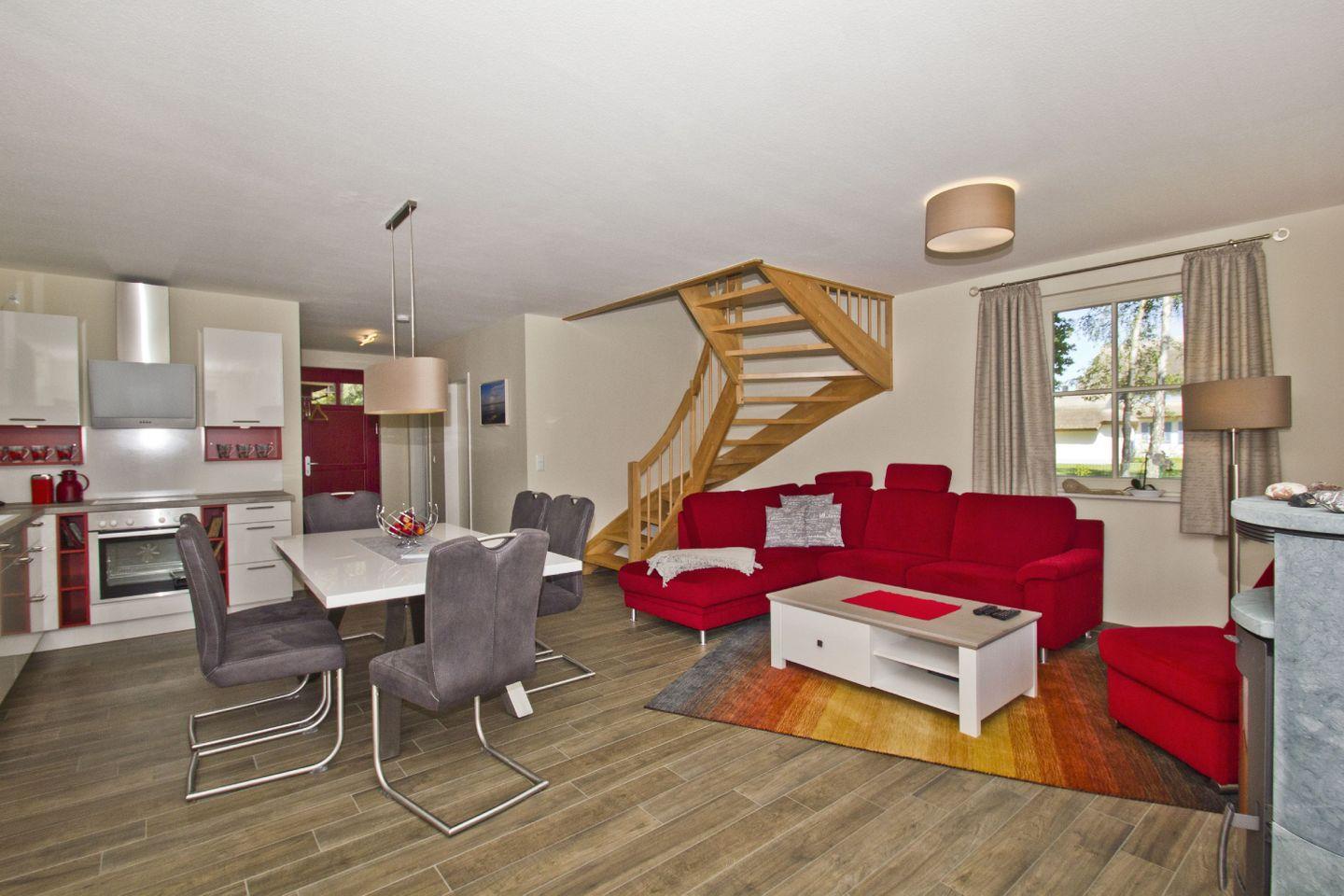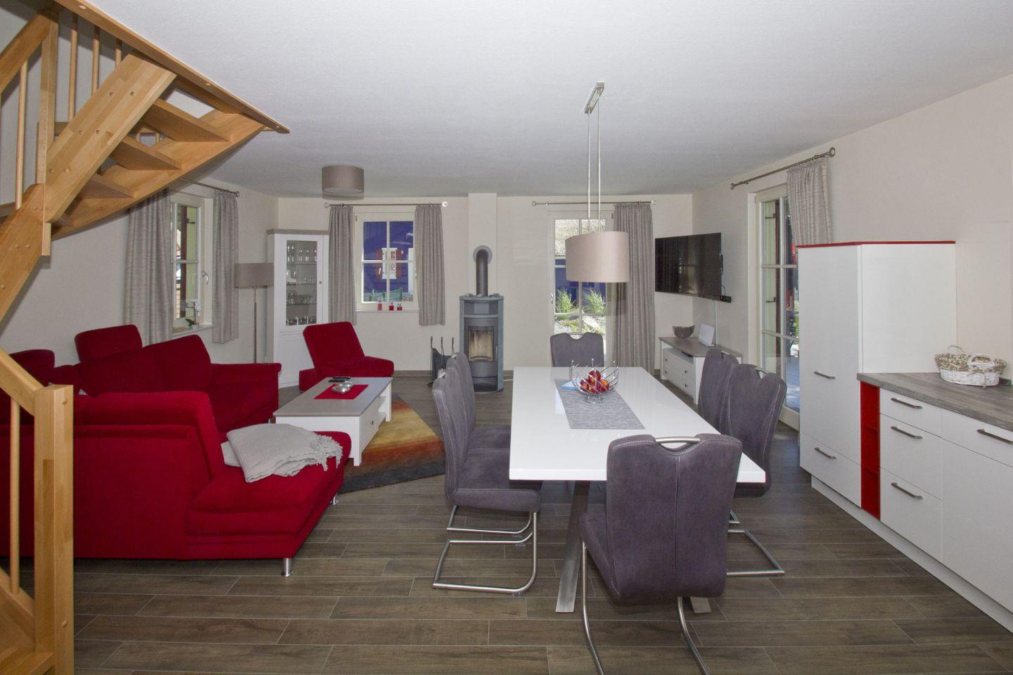 Das Ferienhaus bietet neben einem großzügigen Wohn- und Essraum mit offener, voll ausgestatteter Küche, Kaminofen und großem Flachbild-TV im Erdgeschoss eine separate Sauna mit Dusche. Im OG befinden sich zwei Schlafzimmer, die jeweils mit einem Doppelbett und Flachbild-TV ausgestattet sind. In einem Schlafzimmer befindet sich ein zusätzliches Einzelbett.