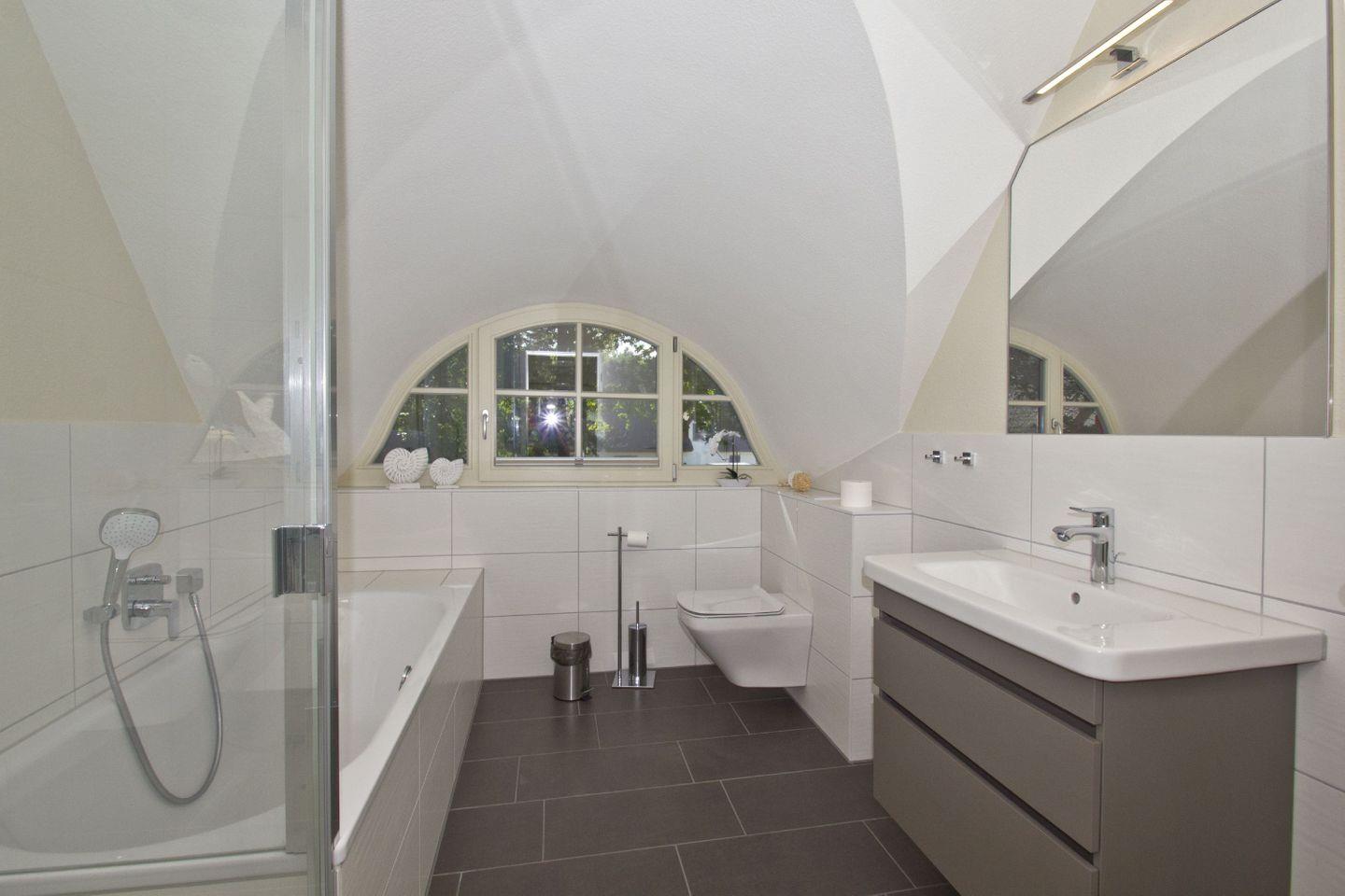 Ebenfalls im OG liegt das großzügige Tageslichtbad mit Badewanne, bodengleicher Dusche und WC.