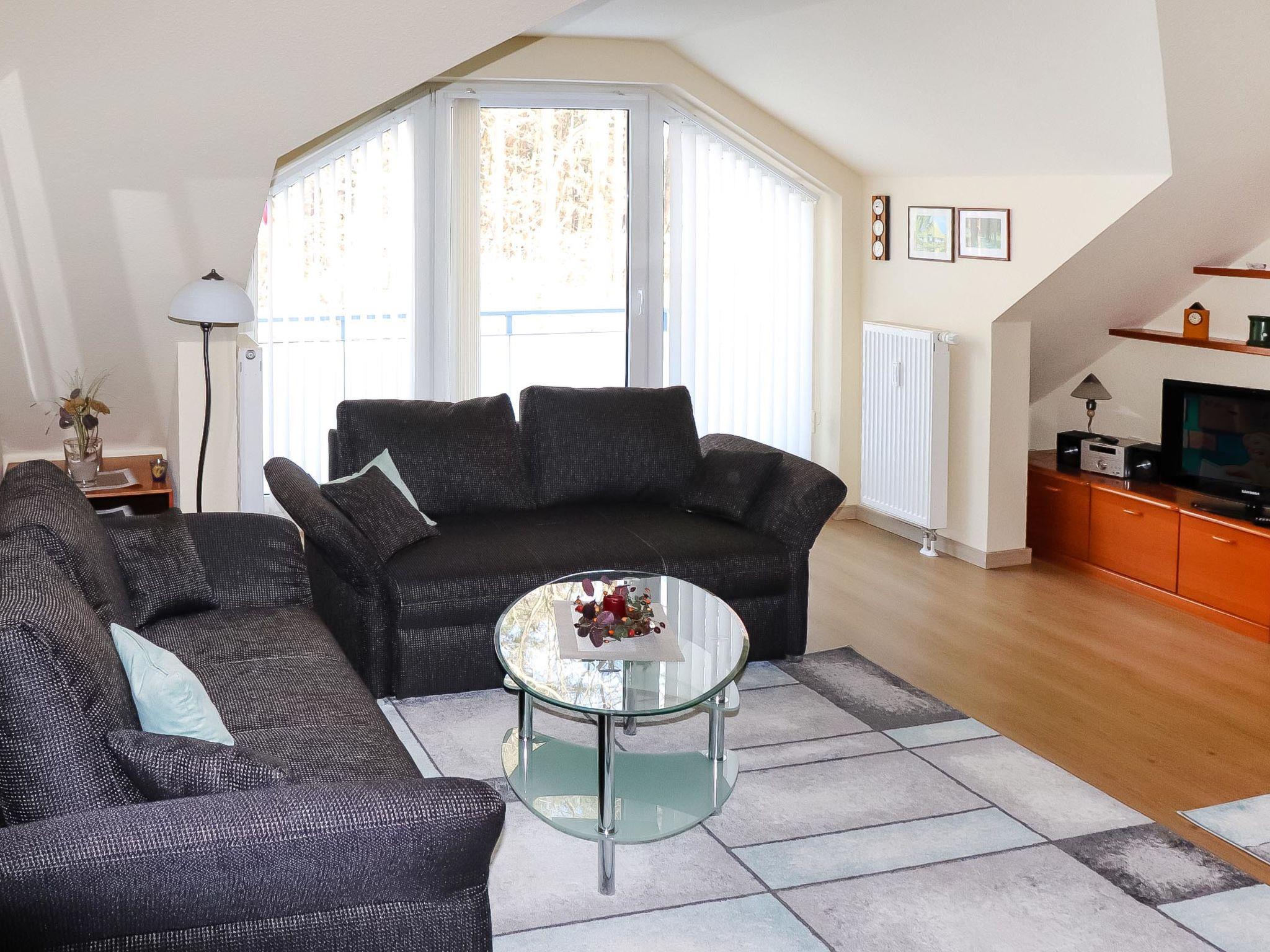 "Glowe (GLW651)", 1-room apartment 47 m2 on 1st floor. Comfortable and cosy furnishings: living/sleeping room with 1 sofabed, 1 double fold-away bed, dining table and satellite TV (flat screen), radio and CD-player. Exit to the balcony. Small kitchenette in the entrance (2 ceramic glass hob hotplates, toaster, kettle, electric coffee machine). Shower/WC. Gas heating. Balcony. Balcony furniture. Facilities: children's high chair, baby cot. Internet (WiFi, free). Please note: non-smokers only.