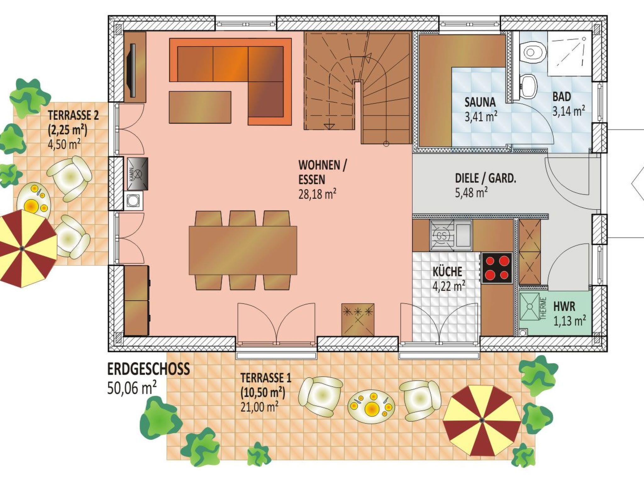 On the ground floor, you will find a cosy living and dining area with an open-plan kitchen, an inviting fireplace and adjoining terraces facing south and west. On the upper floor, the Fischer-Hus offers four bedrooms that can accommodate up to 8 people. Two first-class bathrooms are available on the ground floor and top floor, one with a shower/WC and the other with a walk-in shower, WC and integrated sauna.