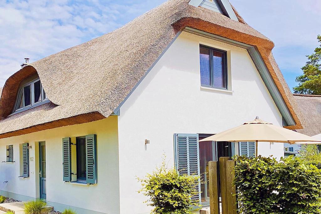 Erholungsort Glowe, Doppelhaus (Haushälfte rechte Seite) über 2 Etagen, ruhige Lage, ca. 600m zum Sandstrand (Ostsee), ca. 800 m zum Bodden Erdgeschoss: Wohn- Essbereich mit Fußbodenheizung, gemütliche Couchlandschaft, TV/ Sat (Flatscreen), Blu-ray Player, offene komplett ausgestattete Einbauküche mit 4- Plattenherd (Ceranfeld), Backofen, Kühlschrank mit kleinem Gefrierfach, Mikrowelle, Geschirrspüler und diversen Elektrogeräten (Kaffeemaschine mit Funktion Pad und Filter), der Esstisch ist individuell ausziehbar, Saunabereich mit Dusche, separates Gäste WC, Wirtschaftsraum mit Waschmaschine und zusätzlichem Kühlschrank(ohne Gefrierfach) Obergeschoss: 1. Schlafzimmer mit einem Doppelbett (2 Matratzen 90 x 200), Kleiderschrank und TV, 2. Schlafzimmer mit 3 Betten (1 Einzelbett und ein 2er Stapelbett, kann auch als Doppelbett gestellt werden) und Kleiderschrank, Bad mit Dusche , Föhn und WC, Terrasse mit Gartenmöbeln (inkl. Deckchairs), Sonnenschirm, Grill vorhanden Erstvermietung Februar 2017 - “ein perfekter Urlaubstraum im Reethaus-Dünenwald” Reetdachgedeckte Doppelhaushälfte, Nichtraucher, Internet (WLAN) kostenfrei vorhanden, gebührenpflichtige Wallbox (Ladestation für E-Auto) vorhanden (einmalige Pauschale in Höhe von 25 Euro), diverse Bücher und Gesellschaftsspiele sowie Strandspielzeug und Strandmuschel vorhanden, Fußbodenheizung im ganzen Haus, Saunanutzung (2 Euro / 3 Stunden), Waschmaschine ohne Gebühr, Liegewiese, Fahrradabstellmöglichkeiten vorhanden (Gartenhaus), 1 PKW- Stellplatz am Haus, Einkaufsmarkt, Bäcker und Restaurant in unmittelbarer Nähe, optimale Rad- und Wandermöglichkeiten