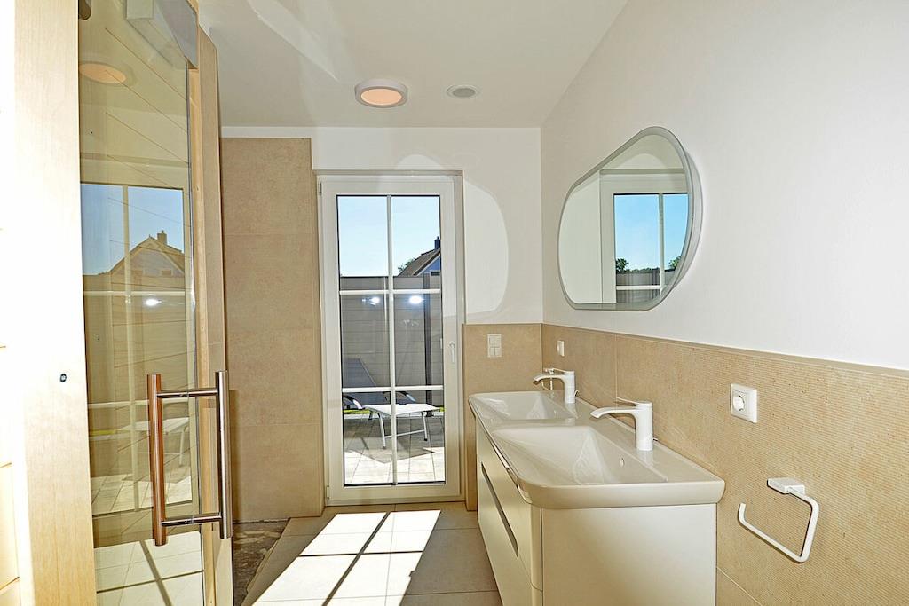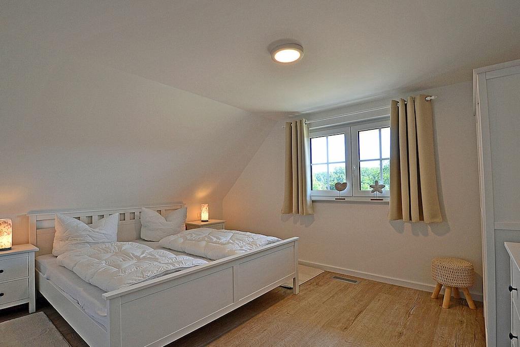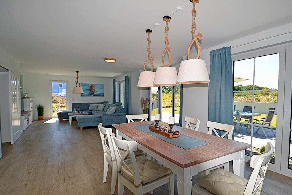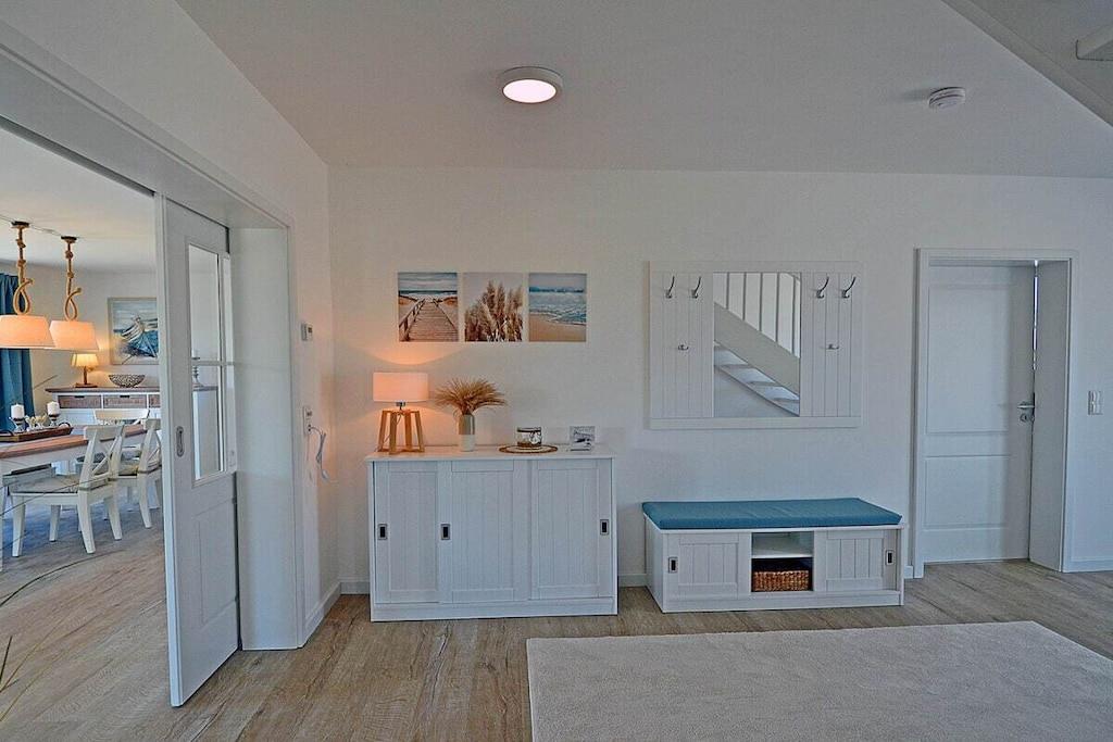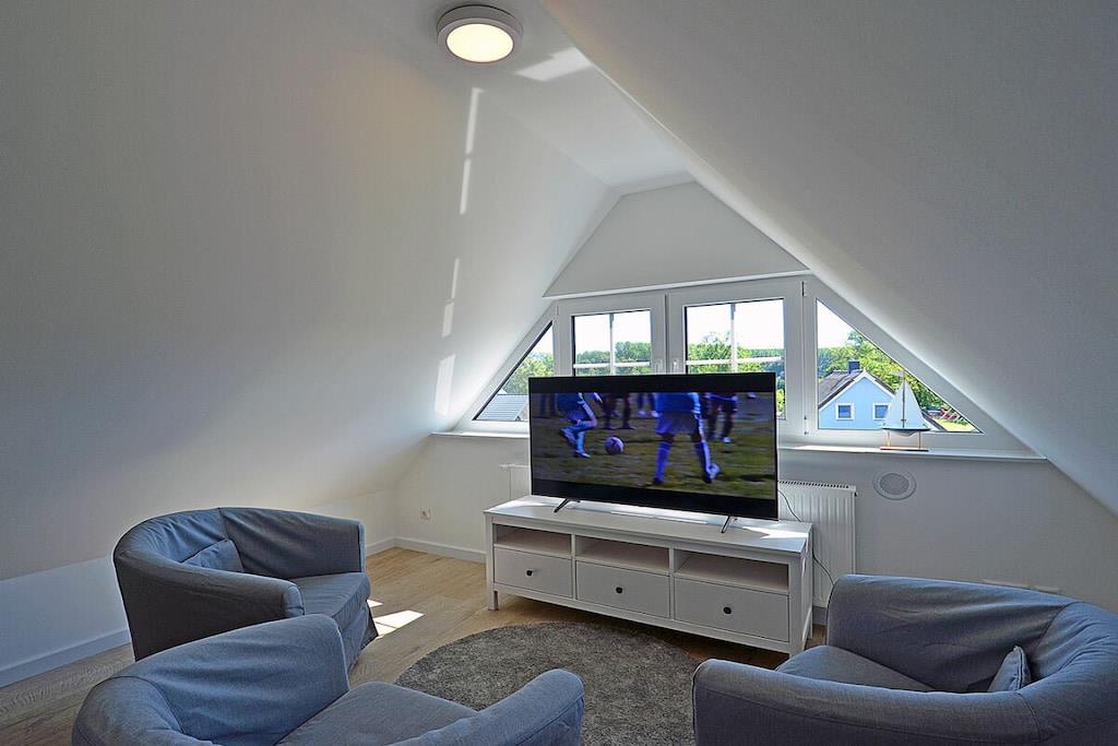 Erdgeschoss: großzügiger Wohn-, Essbereich mit Fußbodenheizung, elektrische Außenjalousien an allen Fenstern, gemütliche Couchlandschaft, Smart-TV (Home-Entertainment), Hifi-Anlage, Internet (WLAN), Gesellschaftsspiele und Bücher für gemütliche Abende, komplett ausgestattete hochwertige Einbauküche mit 4-Plattenherd (Ceran), Backofen, Kühlschrank mit großem Gefrierfach, Geschirrspüler und diversen Elektrogeräten 1. Badezimmer mit Dusche/WC, Sauna mit direktem Terrassenzugang, separates Gäste-WC Hauswirtschaftsraum mit Waschmaschine und Wäschetrockner, Wäscheständer, Bügelbrett, Bügeleisen, Staubsauger, für die Kleinen gibt es einen Kinderhochstuhl und Kinderbett mit Inlett Obergeschoss: 1. und 2. Schlafzimmer mit je einem Doppelbett (getrennte Matratzen jeweils 90 x 200 cm) Kleiderschrank und Sideboard, 3 und 4. Schlafzimmer mit je zwei Einzelbetten (90 x 200) Kleiderschrank und Sideboard, großes Badezimmer mit Badewanne, Dusche, großer Waschtisch und WC Dachgeschoss: Spaß für Groß und Klein bietet der Gaming Room mit TV, WC mit Waschbecken Außenbereich: großes umzäuntes Grundstück mit ca. 630 m², Terrasse mit gemütlichen Gartenmöbeln (6 Gartenstühle und 3 Liegestühle) und großem Sonnenschirm, Grillmöglichkeit besteht (Grill vorhanden), 3 PKW Stellplätze direkt am Objekt, überdachte verschließbare Fahrradabstellmöglichkeit (Gartenhaus) vorhanden