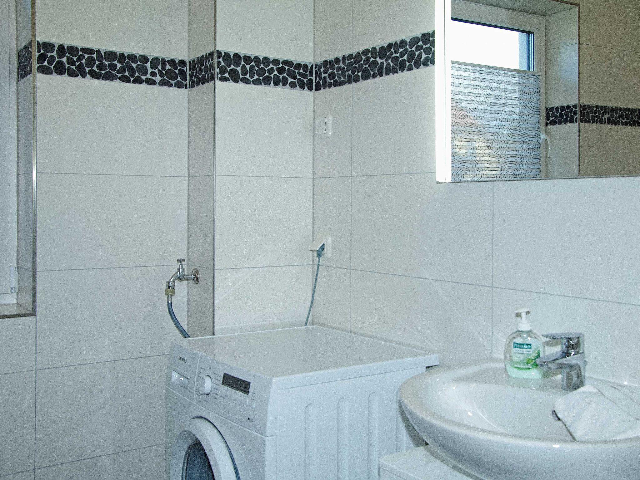 Im Hausanschlussraum steht die Waschmaschine, der Staubsauger und Reinigungsmittel. Dort ist auch ein Regal, in dem Getränke und sonstige Kleinigkeiten gelagert werden können.