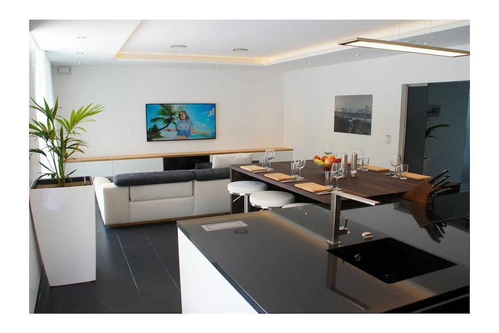 Parterre: stilvoller großzügiger Wohn- Essbereich mit Fußbodenheizung, gemütliche hochwertige Couchlandschaft mit Schlaffunktion, TV/Sat (Flatscreen), Blu-Ray-Player, offene komplett ausgestattete gläserne Luxusküche, Kochinsel mit Induktionskochfeld und integrierter Tisch-Dunstabzugshaube, Backofen, Kühlschrank mit kleinem Gefrierfach, Mikrowelle, Geschirrspüler und modernsten Markenküchengeräten wie z.B. ein Kaffeevollautomat und vieles mehr, 1. Bad mit WC, Waschtisch und ebenerdiger Dusche, 1. Schlafzimmer mit gemütlicher vollwertiger Ausziehschlafcouch (195cm × 150cm / durchgehende Liegefläche) und TV/Sat (Flatscreen) mit Blu-Ray Player, Abstellraum mit Waschmaschine und Fahrradabstellmöglichkeit (von außen zugänglich) 1. Etage: 2. Bad und exklusiver Wellnessbereich mit finnischer Dampfsauna, ebenerdiger Dusche, freistehender Badewanne, zwei Waschtische und WC, 2. Schlafzimmer mit Kingsize Bett (200cm x 180cm / durchgehende Matratze), Ankleideraum mit großem Kleiderschrank und hochwertiger Couchlandschaft mit TV/Sat (Flatscreen), Blu-Ray Home Entertainment mit Radio & CD-Player und Zugang zum großen Balkon Terrasse mit komfortablen Gartenmöbeln für bis zu 6 Personen, 2 Liegestühle und hochwertigem Gasgrill mit Zubehör (bei Bedarf kann die Gasflasche im Baumarkt Glowe aufgefüllt werden) Dieses Objekt ist videoüberwacht.