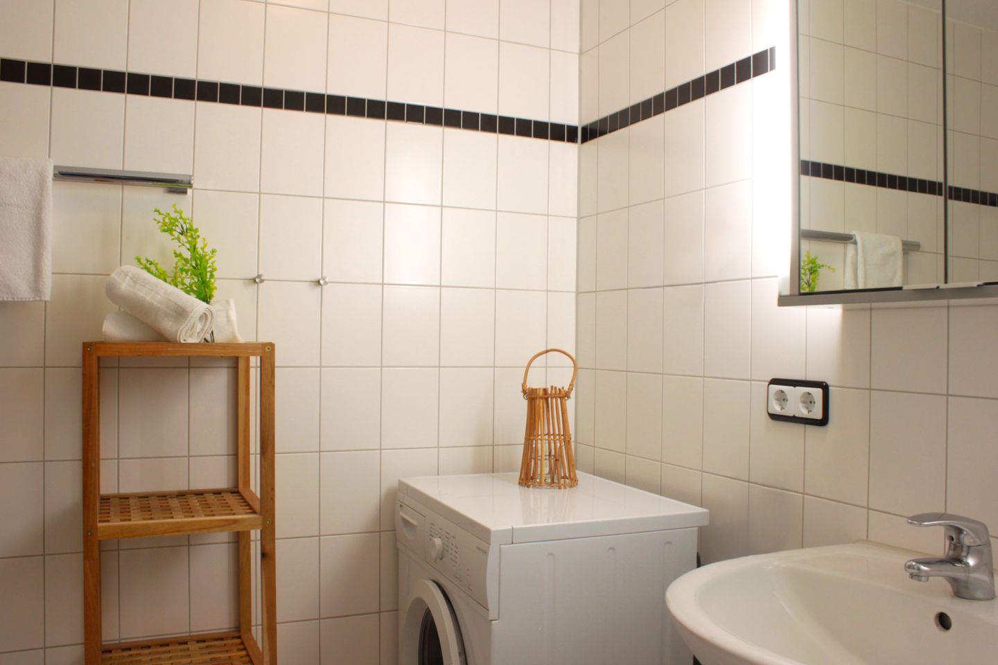 Das Badezimmer verfügt über eine Dusche, eine Waschtisch, Waschmaschine und WC.