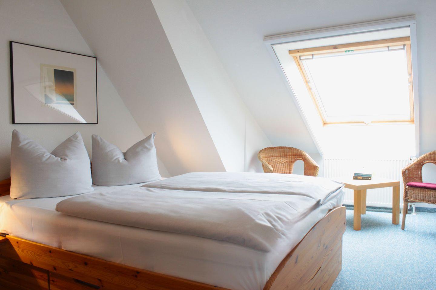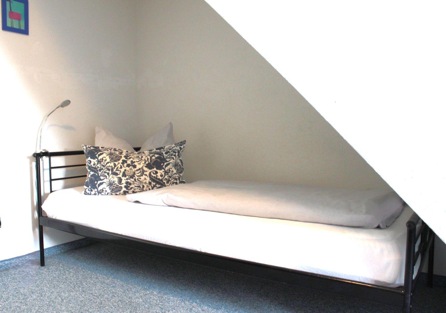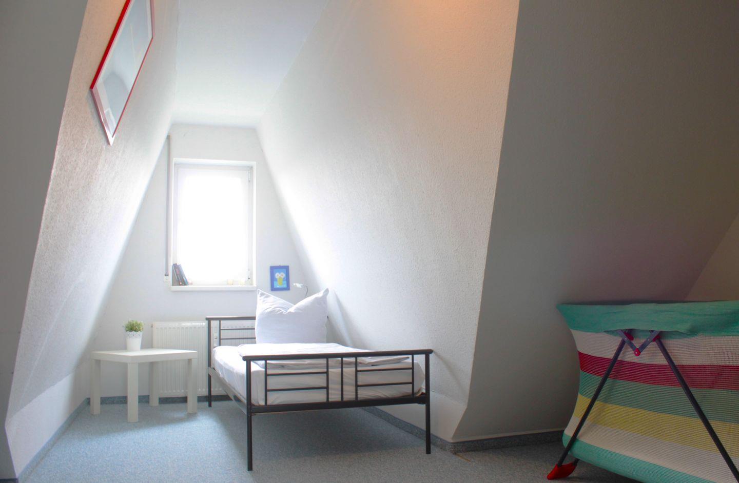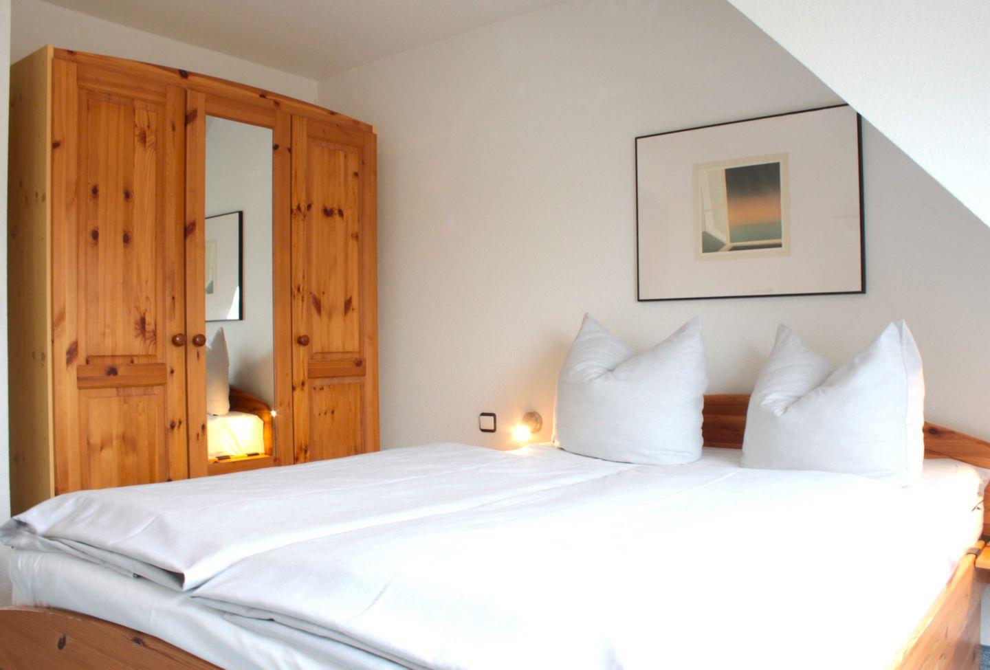 Die zwei separaten Schlafzimmer befinden sich in der oberen Etage der Maisonettewohnung und sind entweder mit einem Doppelbett (durchgängige Matratze) oder zwei Einzelbetten und jeweils genügend Stauraum für Ihre Garderobe ausgestattet.