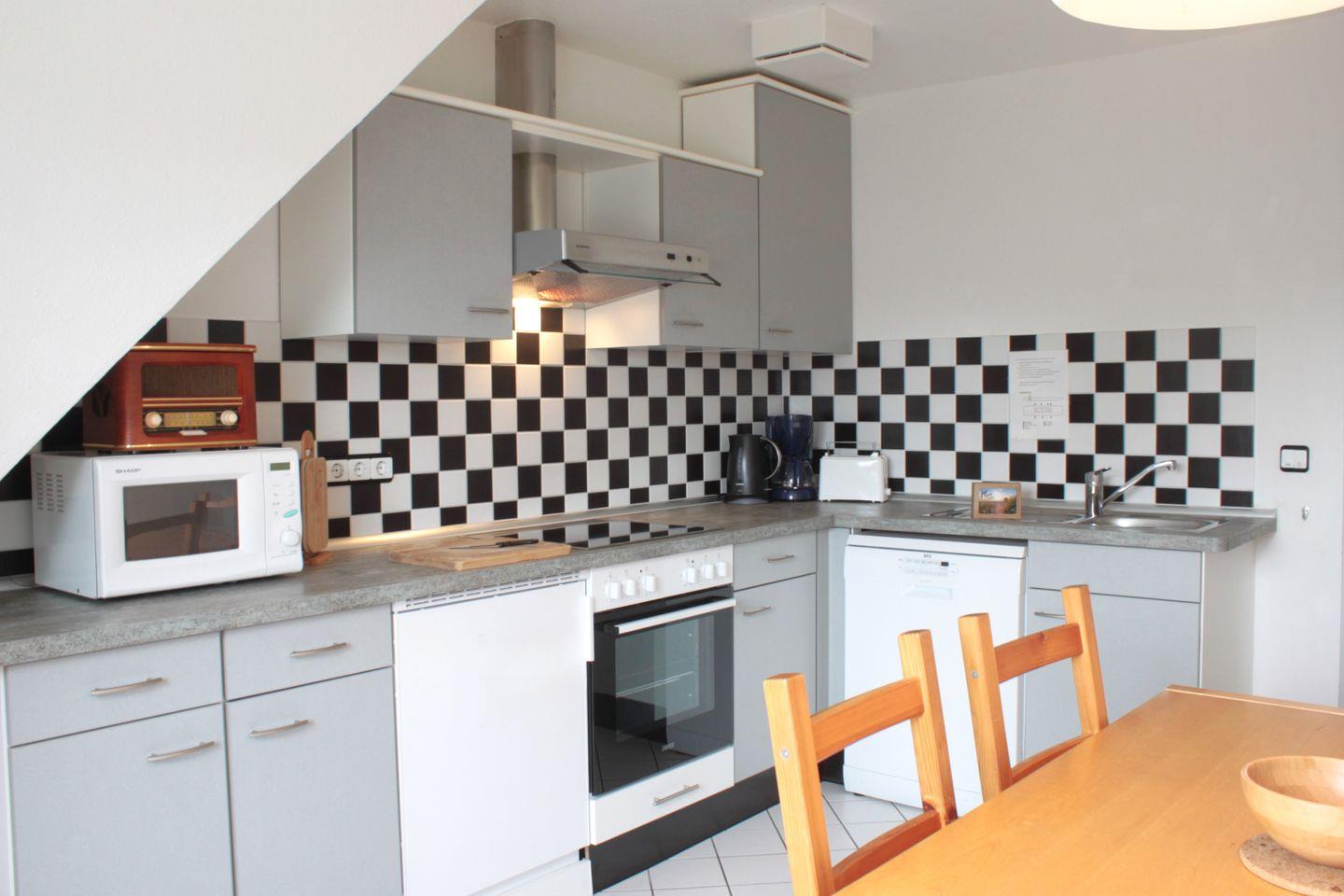 Das helle und modern möblierte Wohnzimmer ist mit einer gemütlichen Couch, einem TV-Gerät und Zugang zum möblierten Balkon ausgestattet. Die separate Küche verfügt über alle technischen Geräte, die Sie bei Bedarf für eine Selbstversorgung benötigen. Dazu gehören z.B. ein Kühlschrank mit Gefrierfach, ein Herd mit Backofen, Geschirrspüler, Kaffeemaschine, Toaster und vieles mehr.