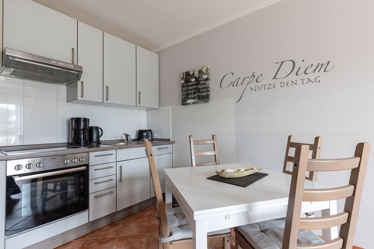 In dieser modern eingerichteten Ferienwohnung finden bis zu 4 Personen viel Komfort, um einen erholsamen Urlaub zu erleben. Der kombinierte Wohn- und Essbereich ist hell und freundlich möbliert und bietet Ihnen neben einer gemütlichen Sofaecke mit TV-Gerät auch einen Esstisch und die integrierte Küche. Diese verfügt über viele technische Geräte, wie Kühlschrank mit Gefrierfach, Herd mit Backofen, Geschirrspülmaschine, Kaffeemaschine, Wasserkocher und vieles mehr.