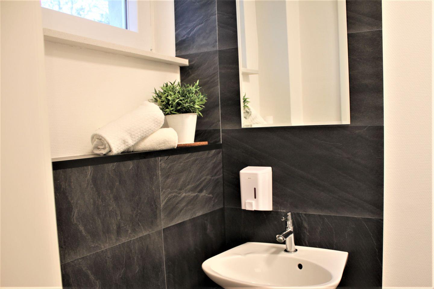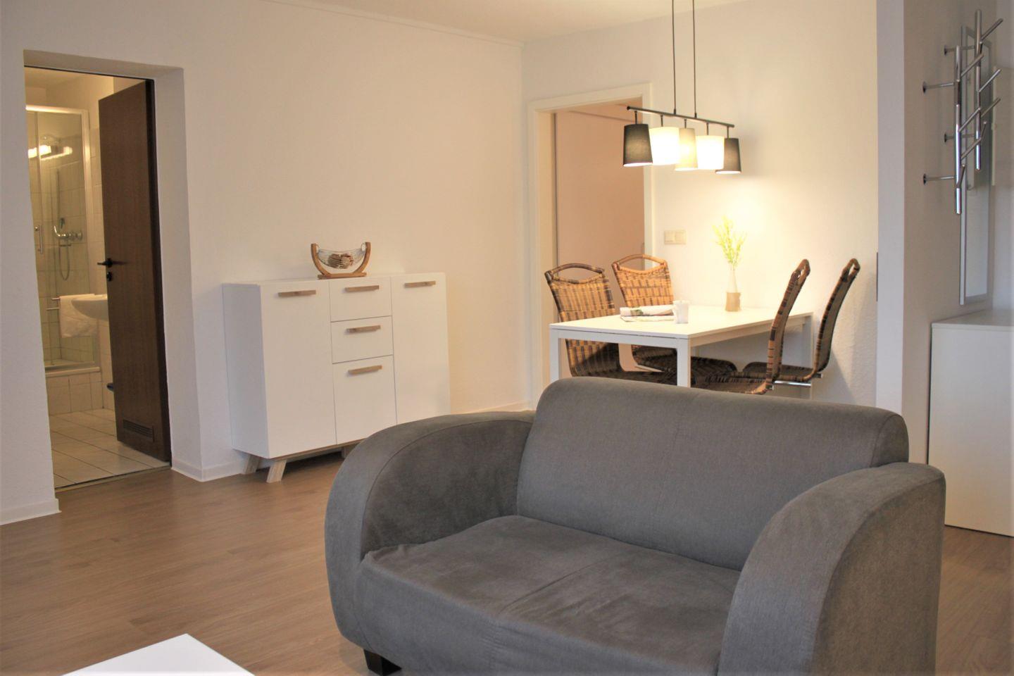 Das Wohnzimmer bietet eine gemütliche Sofaecke mit TV-Gerät, WLAN und Esstisch und lädt zum Entspannen ein. Die zwei separaten Schlafzimmer sind entweder mit einem Doppelbett oder Etagenbett und jeweils Stauraum für die Garderobe möbliert und ermöglichen erholsame Nächte. Die kleine Küche mit Fenster ist separat und verfügt über eine gute Ausstattung, die eine Selbstverpflegung ermöglicht. Das innenliegende Badezimmer ist mit einer Dusche, Waschtisch und WC ausgestattet. Ein zusätzliches Gäste-WC verfügt über ein WC, Waschbecken und Fenster.