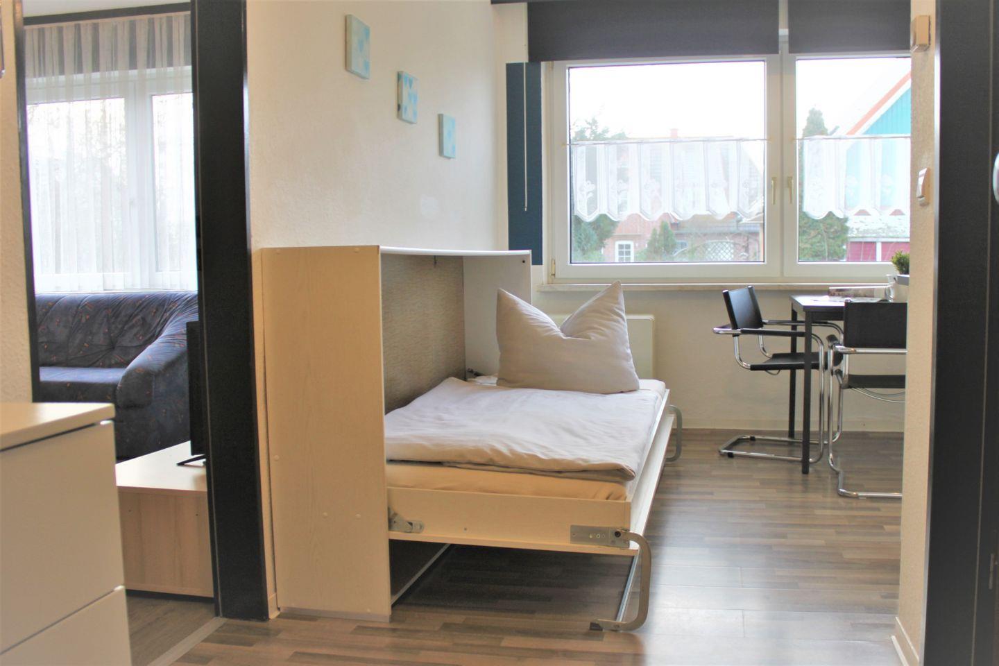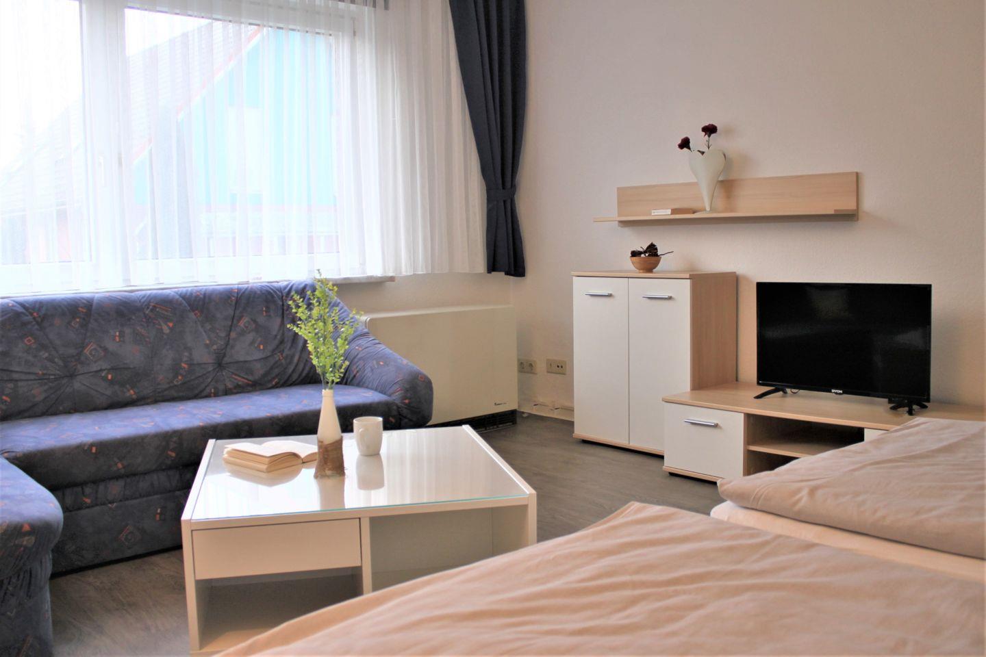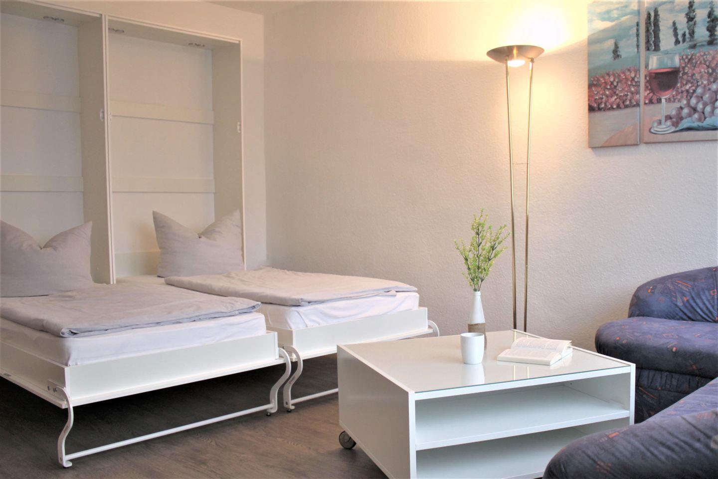 Im separaten Wohn- und Schlafzimmer stehen Ihnen eine Sofaecke mit TV-Gerät, WLAN und zwei Einzelbetten (Schrankbett) zur Verfügung. Die Küche ist offen gestaltet und bietet einen Esstisch, eine moderne Küchenzeile mit guter Ausstattung und bei Bedarf einen weiteren Schlafplatz (Einzelbett als Schrankbett) für ein Kind.