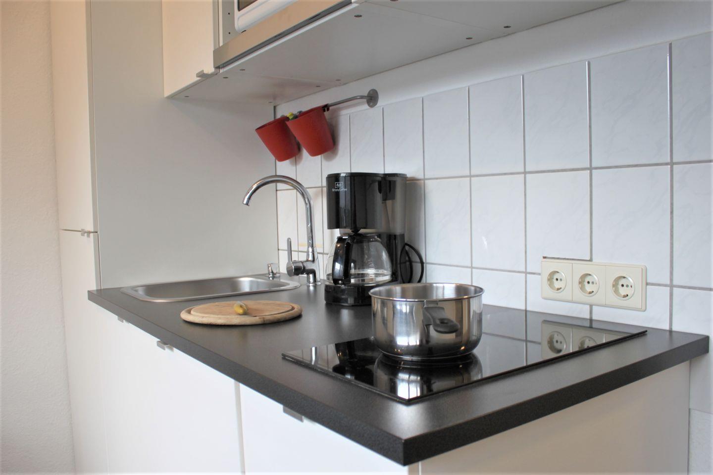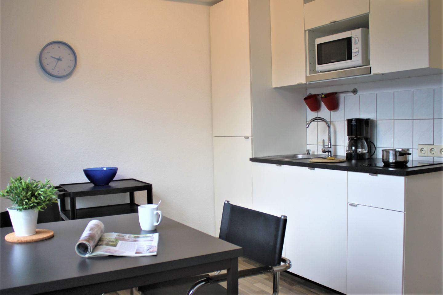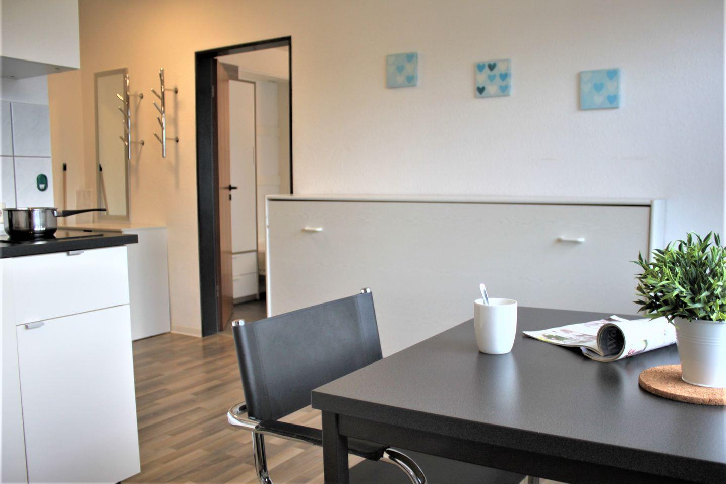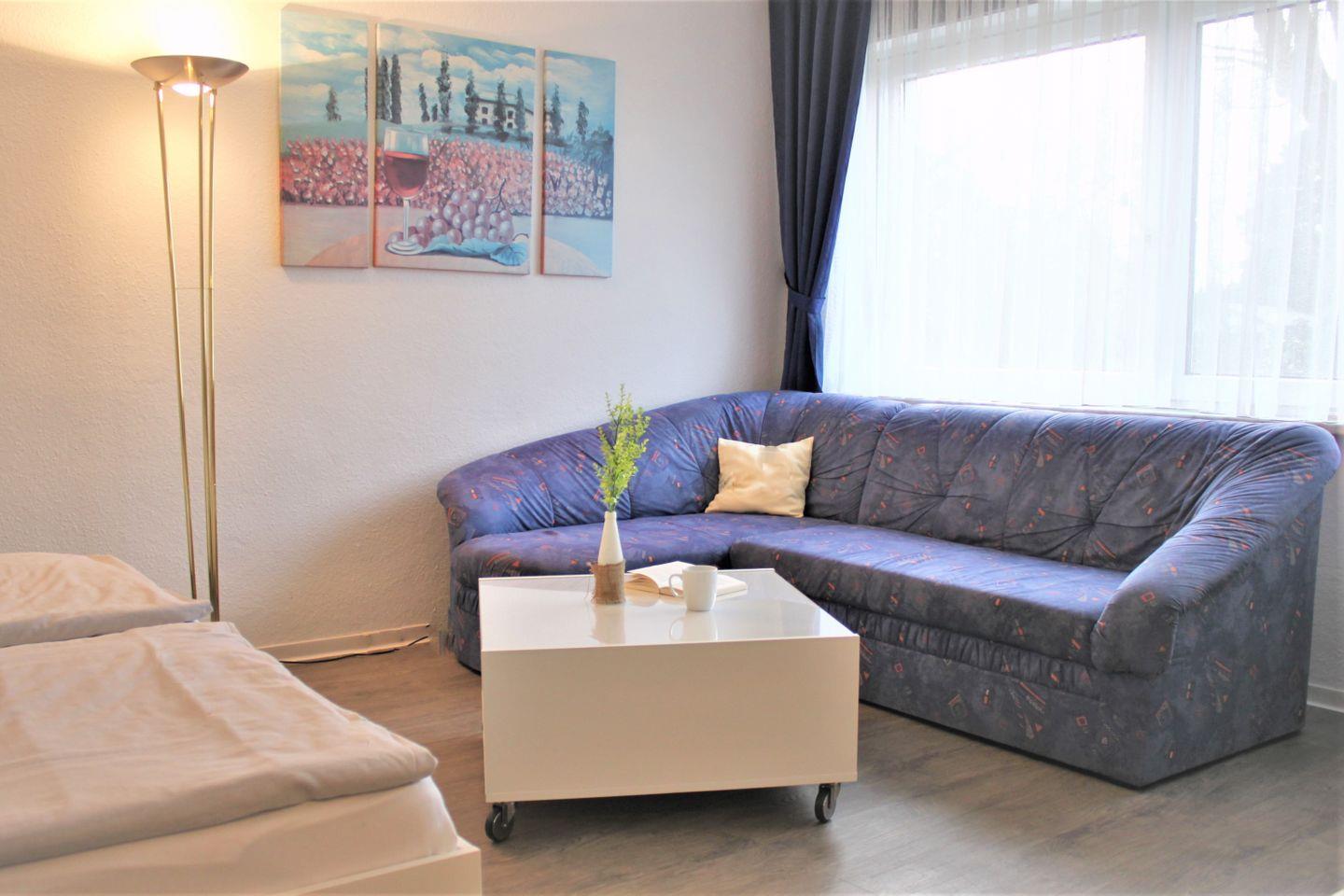 Im separaten Wohn- und Schlafzimmer stehen Ihnen eine Sofaecke mit TV-Gerät, WLAN und zwei Einzelbetten (Schrankbett) zur Verfügung. Die Küche ist offen gestaltet und bietet einen Esstisch, eine moderne Küchenzeile mit guter Ausstattung und bei Bedarf einen weiteren Schlafplatz (Einzelbett als Schrankbett) für ein Kind.