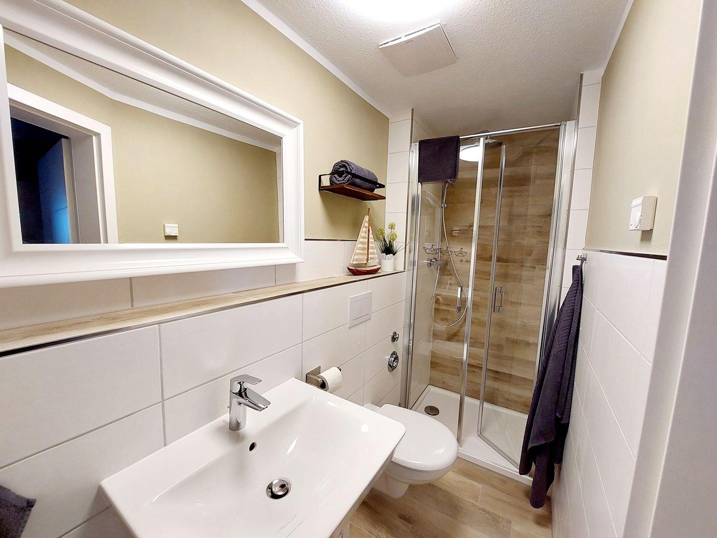 Im modernen Badezimmer befindet sich eine Dusche, ein WC und ein Waschtisch.