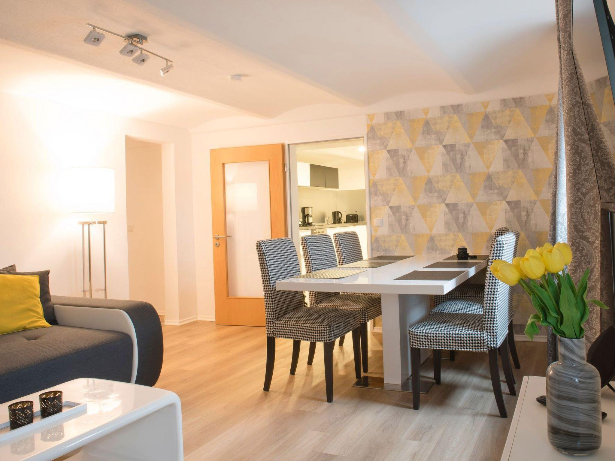 Inside, the non-smoking flat offers comfort and cosiness in every room. Relax in the spacious living area, which provides entertainment with a spacious seating area, an electric fireplace and a flat-screen TV with Wii console. A dining table for six allows you to enjoy meals together in a cosy atmosphere. The fully equipped kitchen with dishwasher, filter coffee machine, toaster, kettle and a small bar table fulfils every wish. Two bedrooms with high-quality beds and lovingly selected details guarantee a restful night's sleep, while the bathroom with a shower and bathtub invites you to relax.