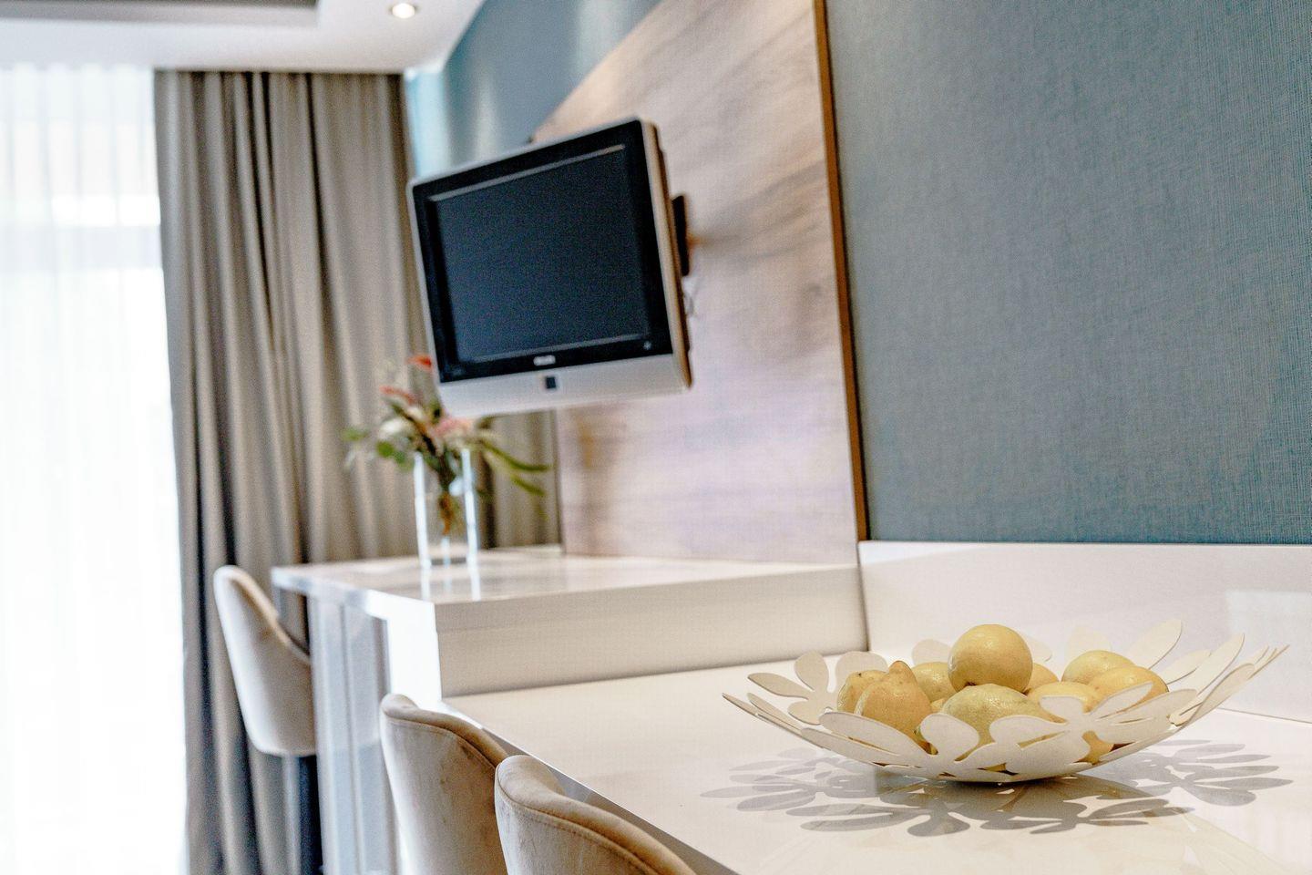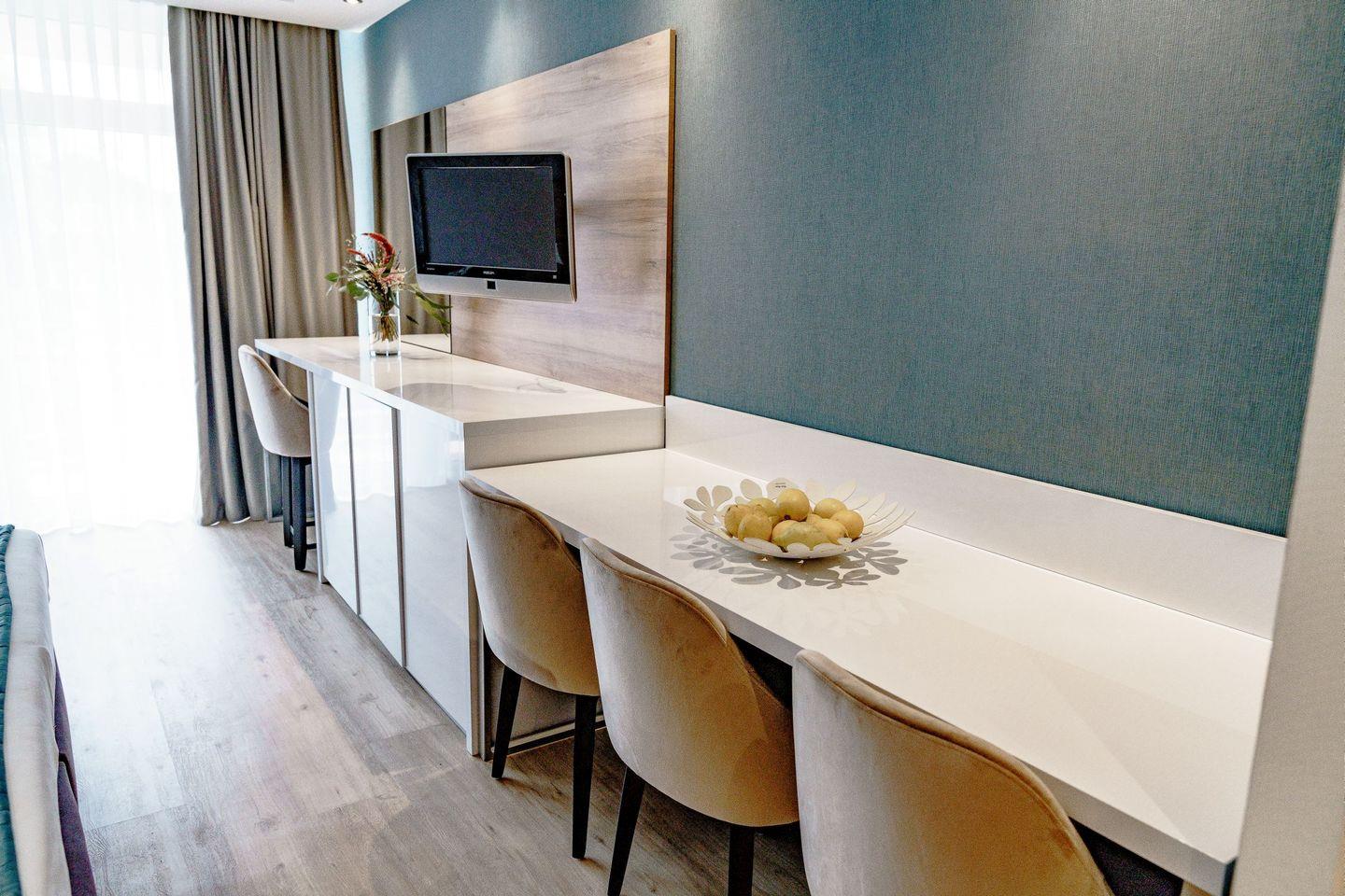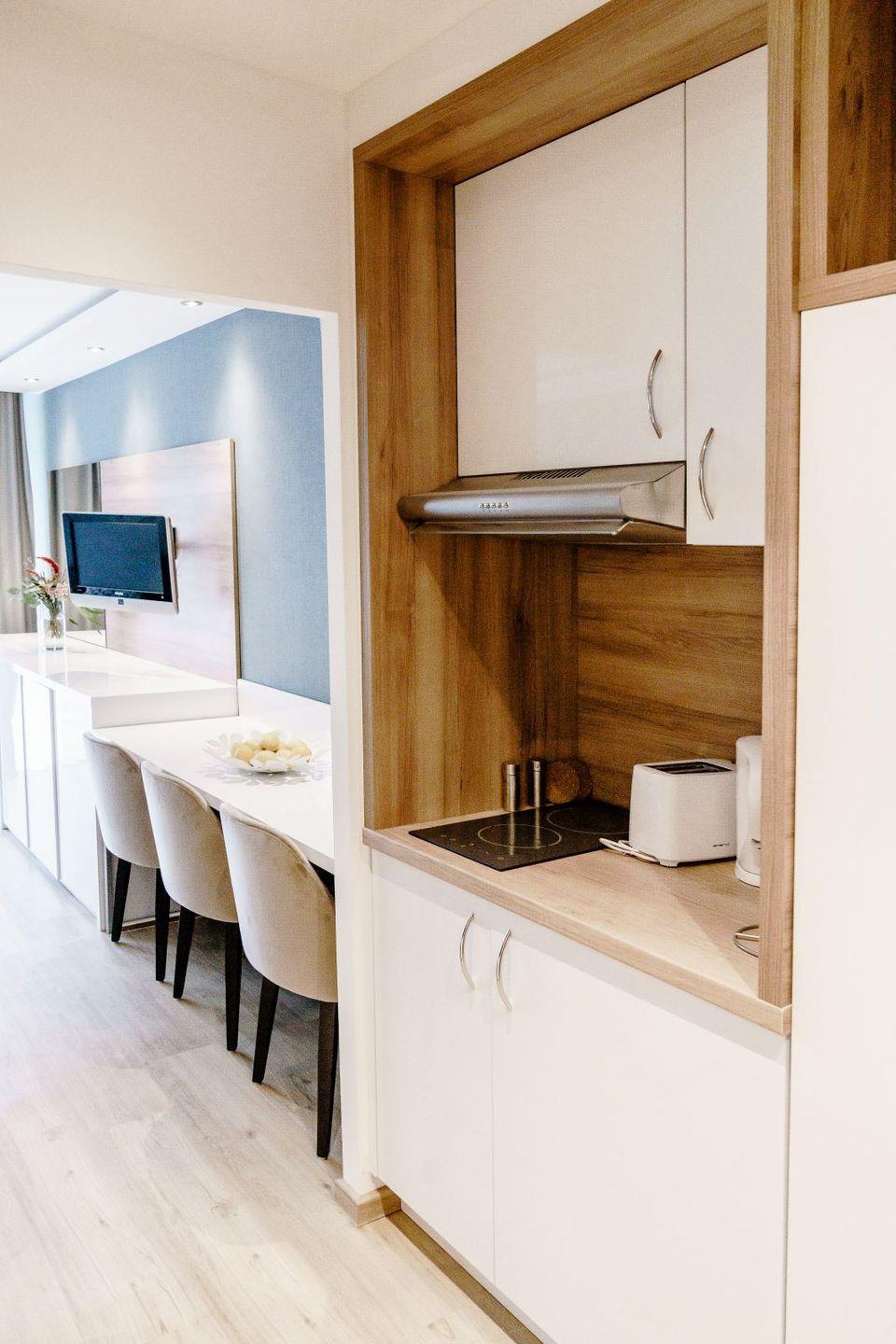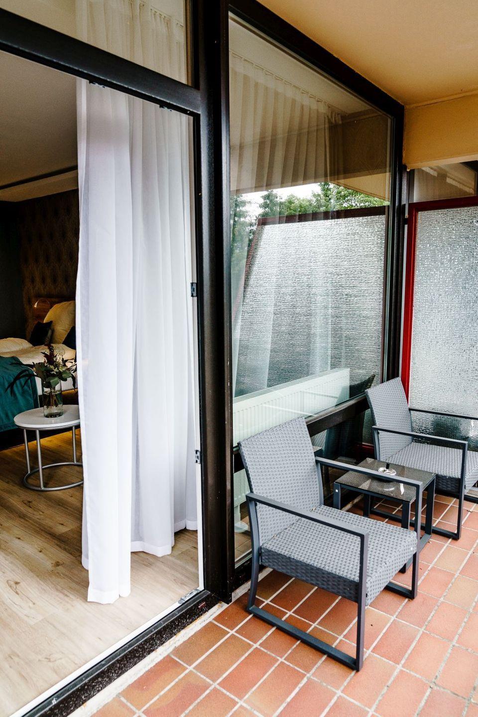Die voll ausgestatteten Ferienwohnungen sind geprägt von einer harmonischen Farbkombination in der Sie sich garantiert wohlfühlen werden und es Ihnen an nichts fehlen wird. Vom Balkon aus genießen Sie eine Panoramaaussicht, wahlweise auf den See oder den berühmten Bocksberg. Die bequemen Balkonmöbel laden zum Verweilen mit ihren Liebsten ein.