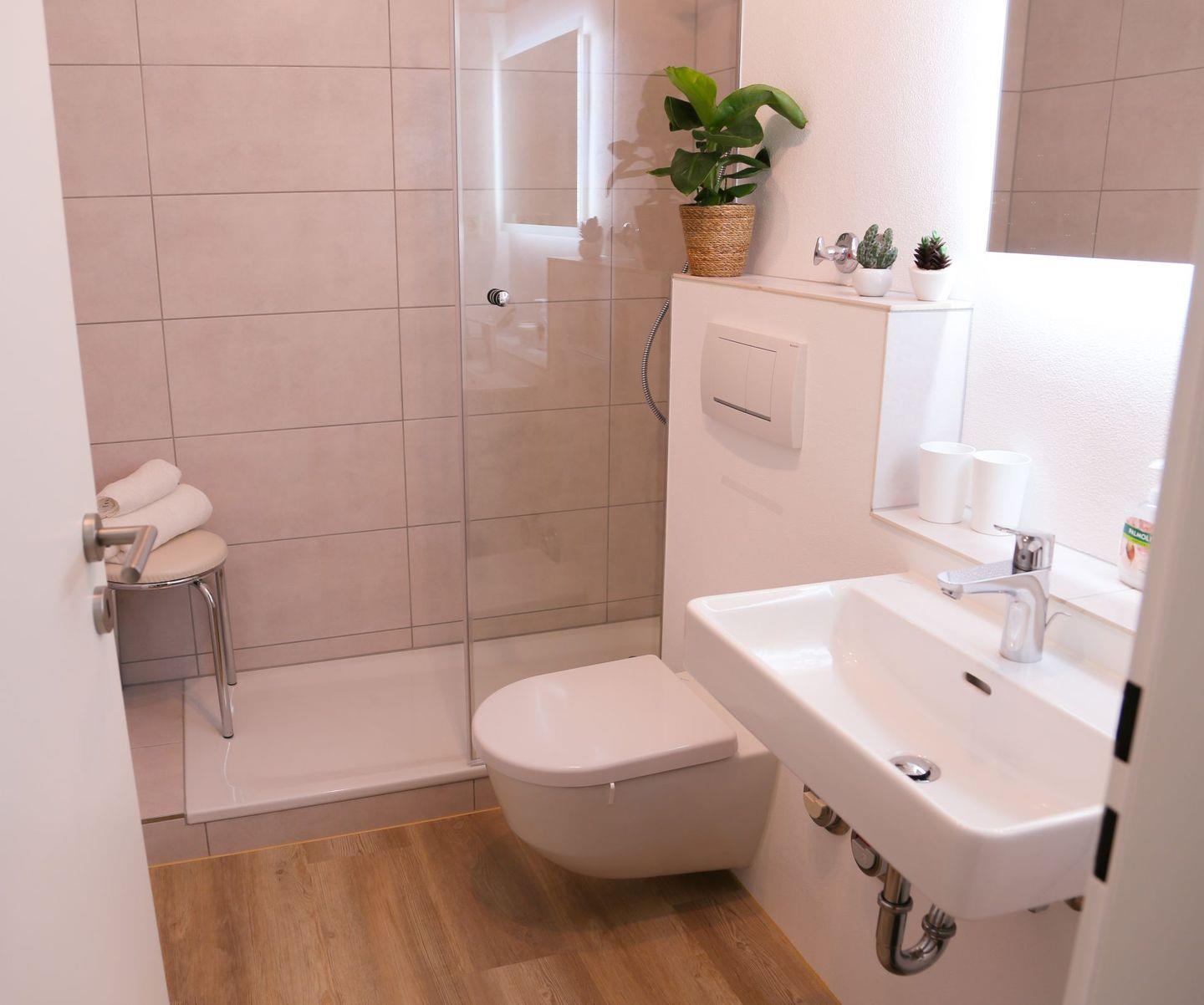 Das Bad ist ebenfalls komplett saniert und bietet einen flachen Duscheinstieg und einen modernen LED-Spiegel. Ein Fön ist vorhanden.