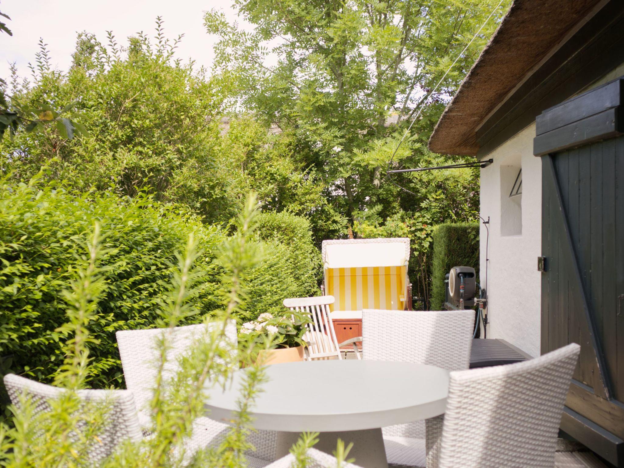 You have a manageable, small garden on the south-west side, not visible from the neighbours, bordered by hedges and bushes. There you will find the seating you need for a cosy sunny day: a deckchair, wicker chairs and a dining table, a parasol and a beach chair when the wind is blowing. In the evening, the garden is illuminated with discreetly shining globe lamps.