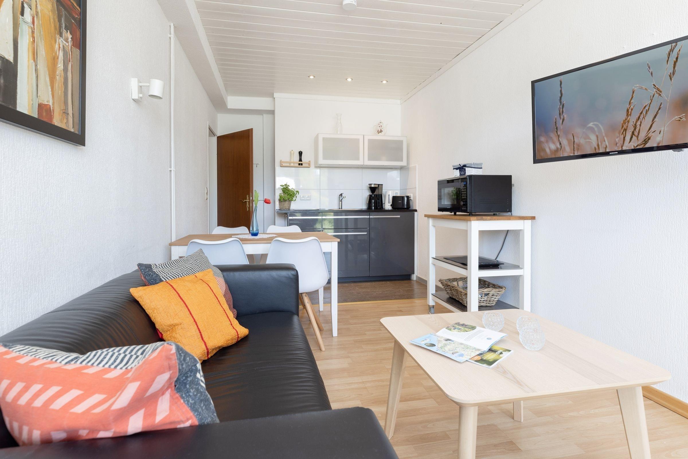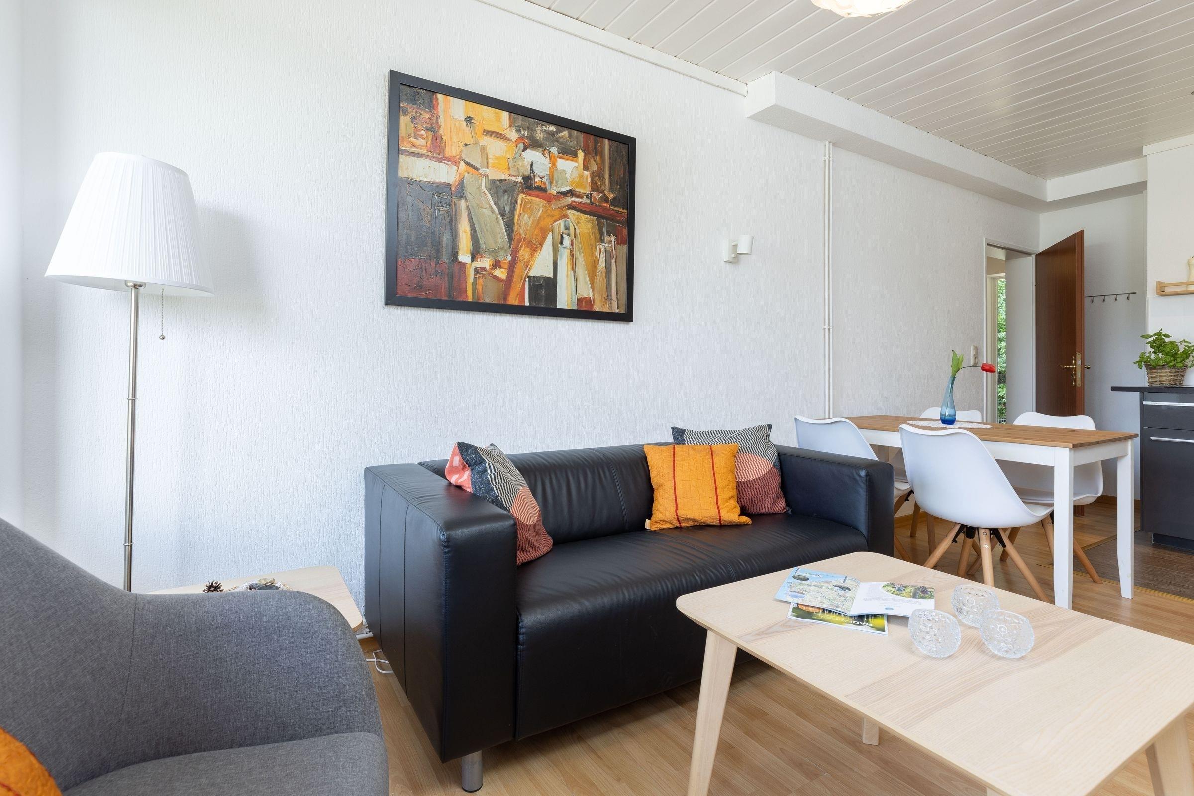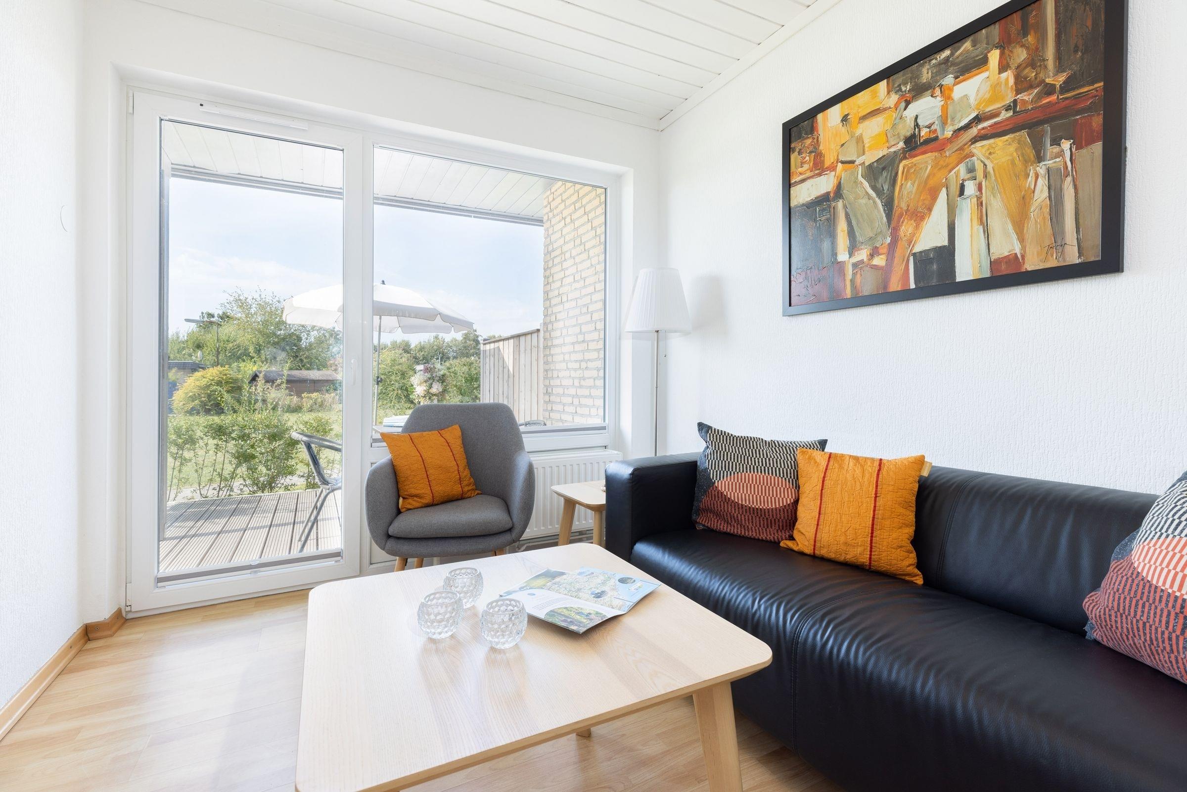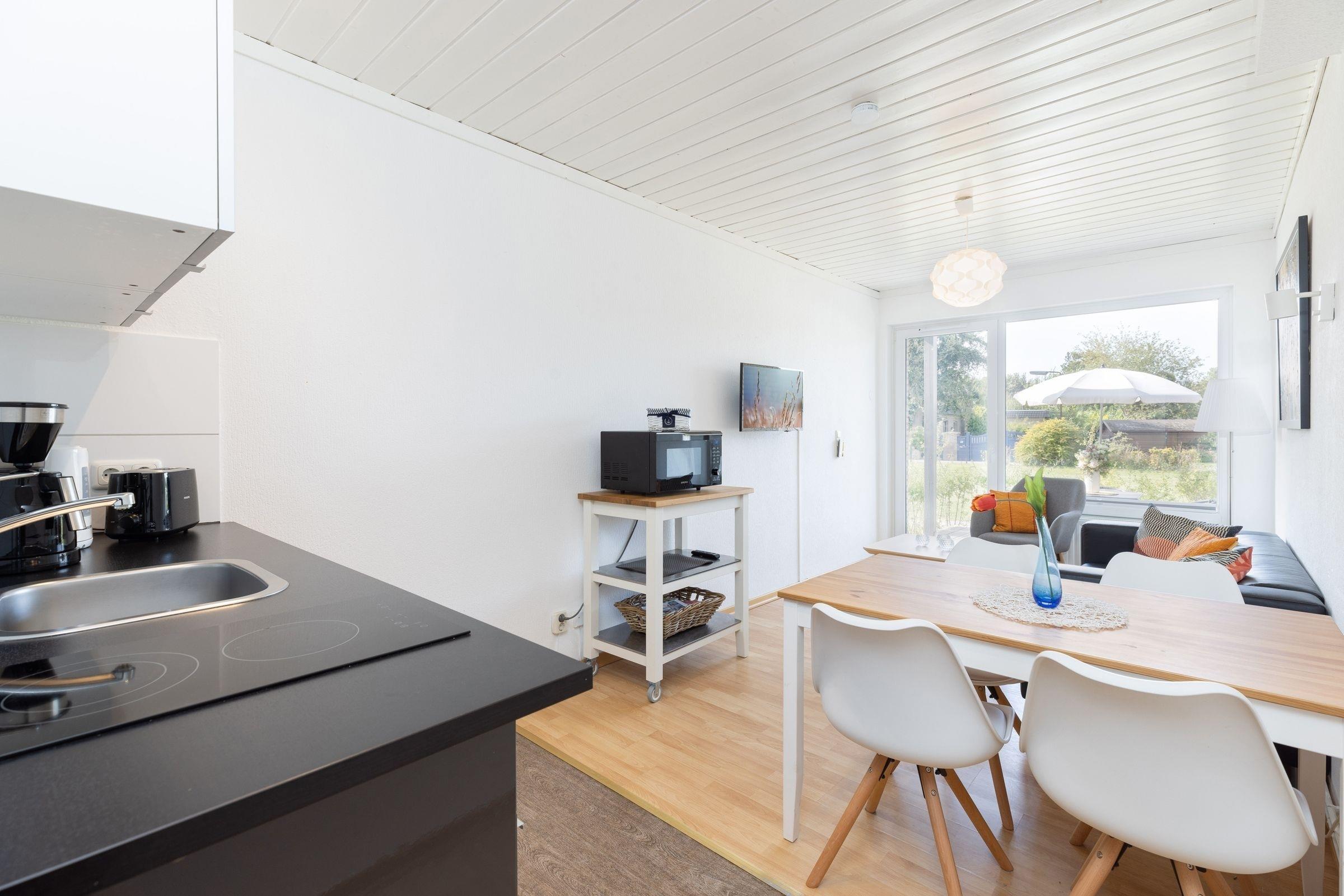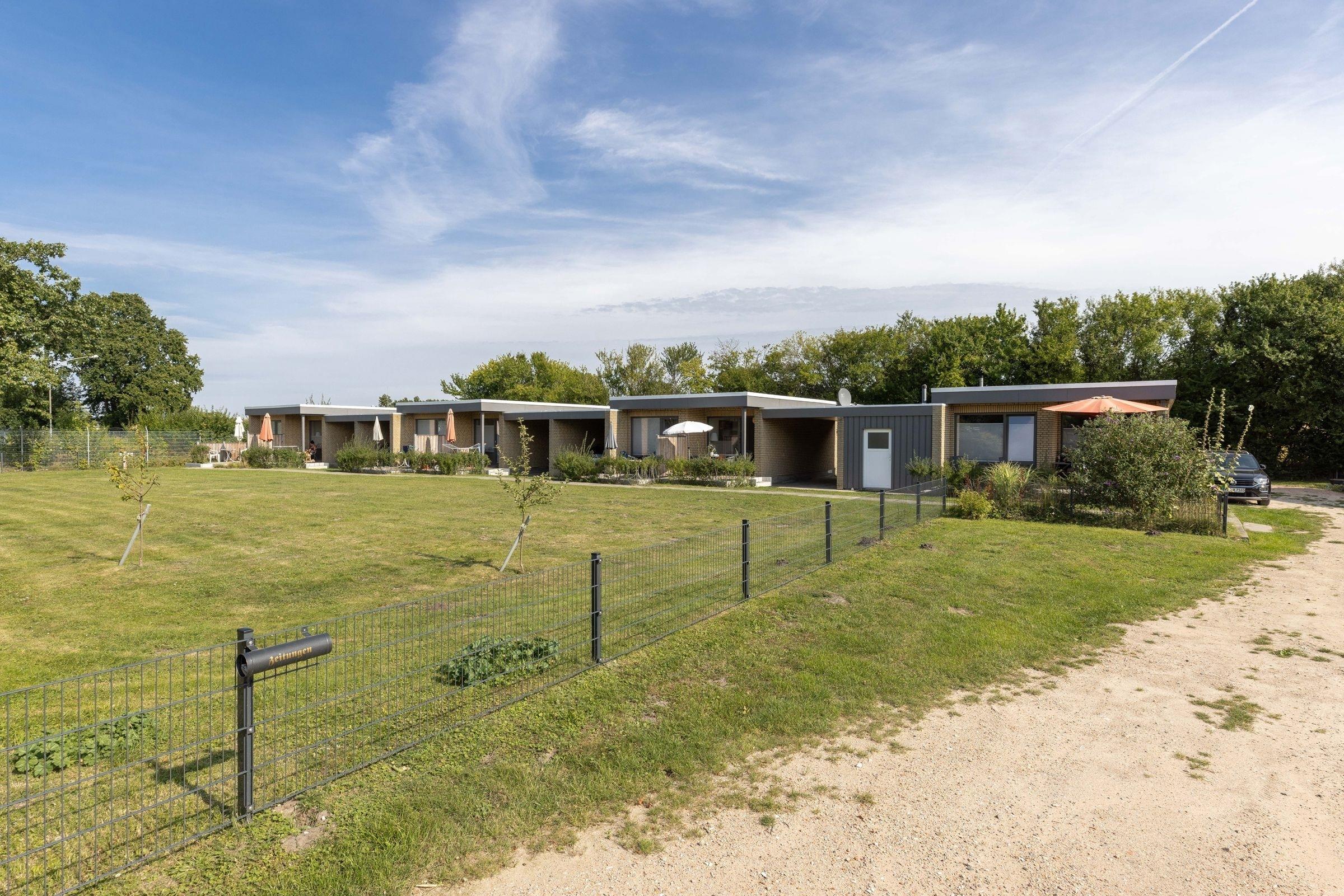 Dieser 2-Zimmer-Bungalow auf ca. 44 m² verfügt über ein separates Schlafzimmer mit Doppelbett (160x200 cm, durchgehende Matratze), ein Wohnzimmer mit offener Küche (ausgestattet mit Herd, Mikrowelle mit Backfunktion, Kühlschrank mit Gefrierfach etc.) und Zugang zur Terrasse mit anliegendem Garten zur Gemeinschaftsnutzung. Gartenmöbel und ein Sonnschirm stehen schon bereit. Außerdem gibt es eine gemütliche Schlafnische mit Etagenbett (je 90x190 cm). WLAN steht zur Verfügung.