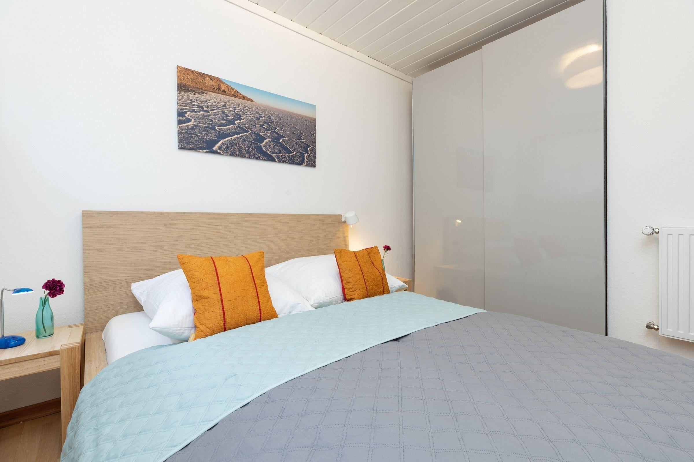 Schlafzimmer: 1 Doppelbett (160x200 cm, durchgehende Matratze), Kleiderschrank, Verdunkelung (Plissees)