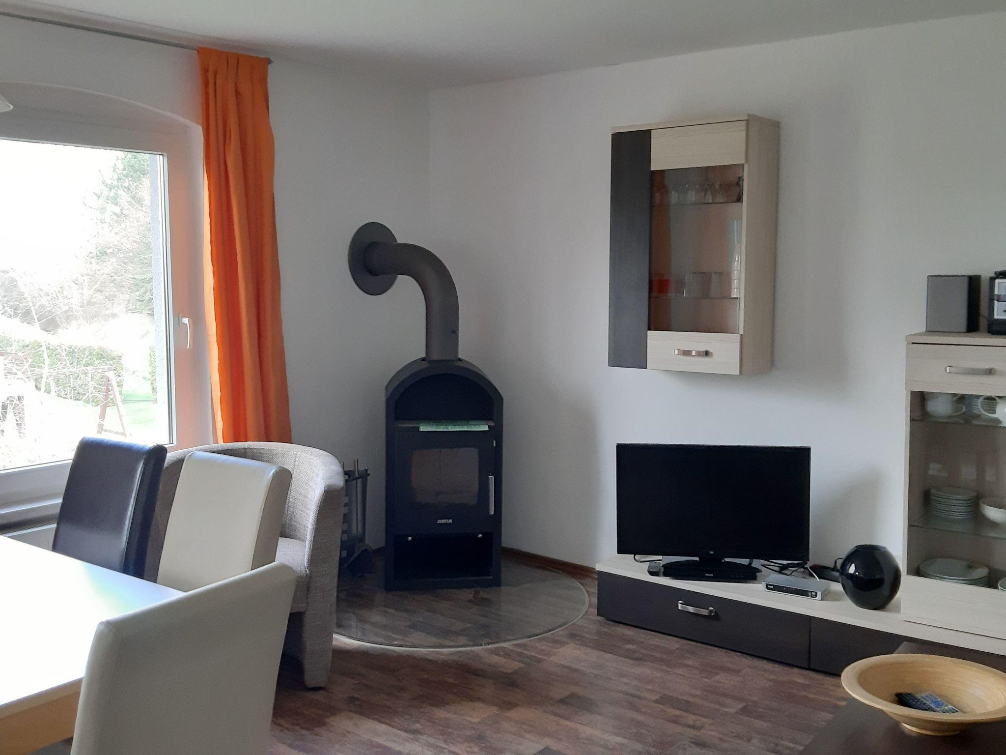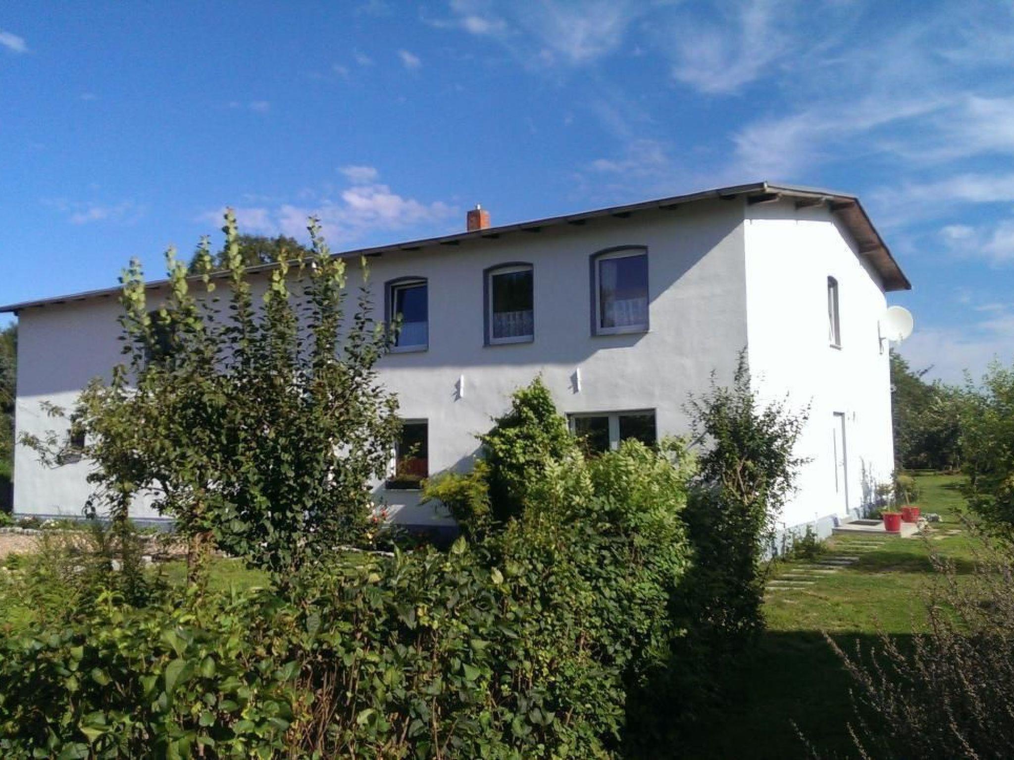 Ferienhaus Michel in the district of Vorpommern-Rügen in the tranquil village of Vorland, offers its guests a 75 square metre flat on the first floor with four rooms for a total of four adults and two children (up to 14 years). The flat has three bedrooms accessible via the second corridor, two of which have a double bed (1.40 x 2.00 metres) and one with two single beds (0.90 x 2.00 metres). The eat-in kitchen with a view of the orchard is fully equipped. There is a ceramic hob with extractor bonnet, dishwasher, microwave, large fridge, plenty of crockery and pots, toaster, kettle, coffee machine, blender. In the living area there is a 32" LCD TV, DVD player and a stereo system as well as a wood-burning stove, which provides cosiness and pleasant warmth on cold days. The washing machine is also located in the large shower room with double washbasin and a 1.20 x 0.80 metre shower tray and toilet. There is also a separate toilet room. Garden furniture and a parasol await you in the large orchard. The house is located in the triangle between Stralsund and Greifswald (35 km each) and 40 km from the Darß.