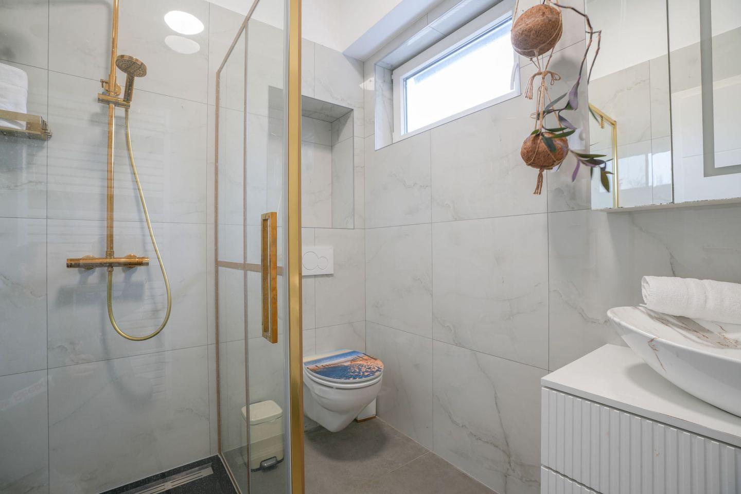 Das Badezimmer ist modern gestaltet und mit einer bodengleichen Dusche ausgestattet. Ein Haustier ist willkommen. Für Gäste stehen zwei kostenlose Privatparkplätze direkt am Hof zur Verfügung.