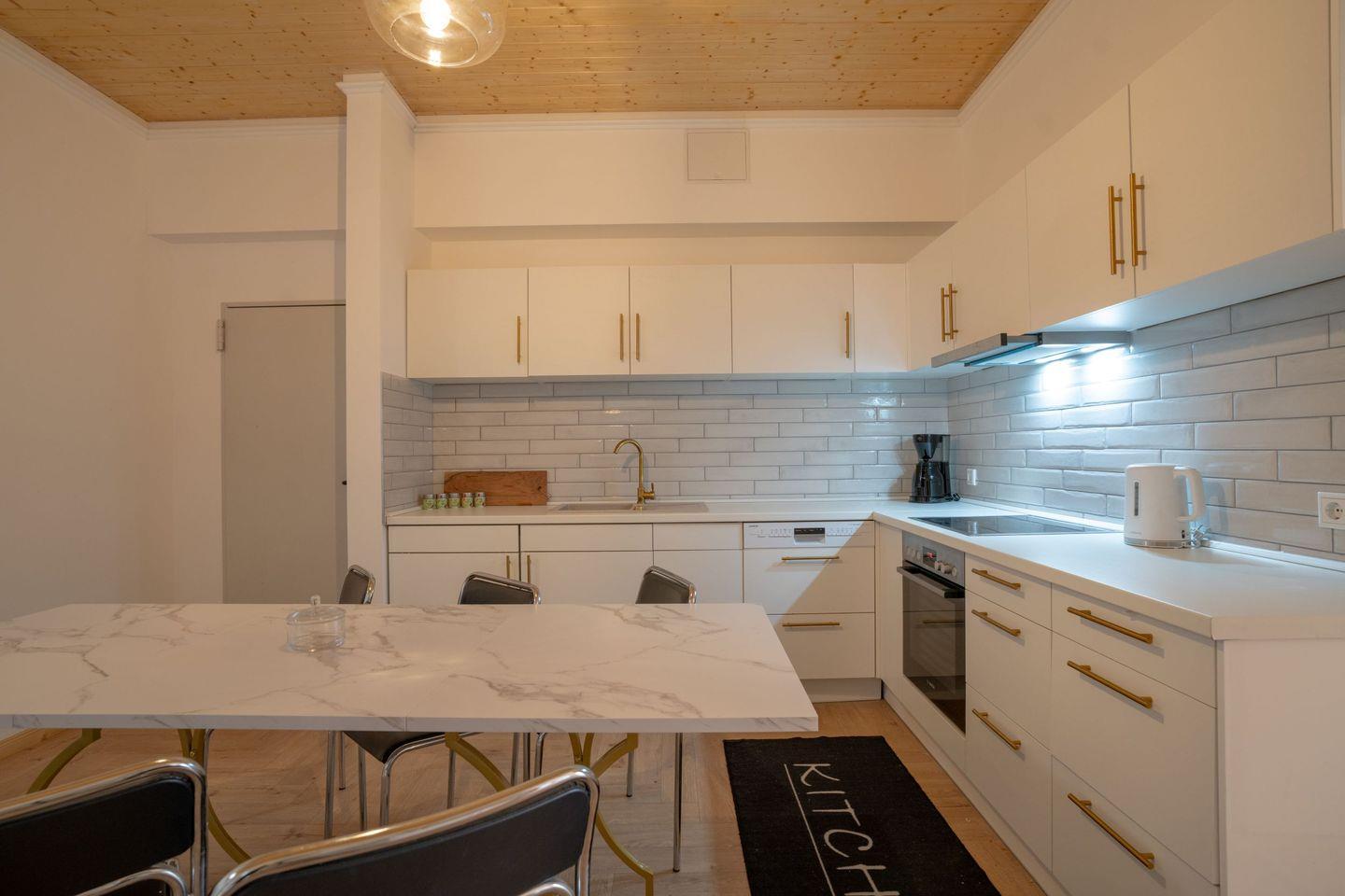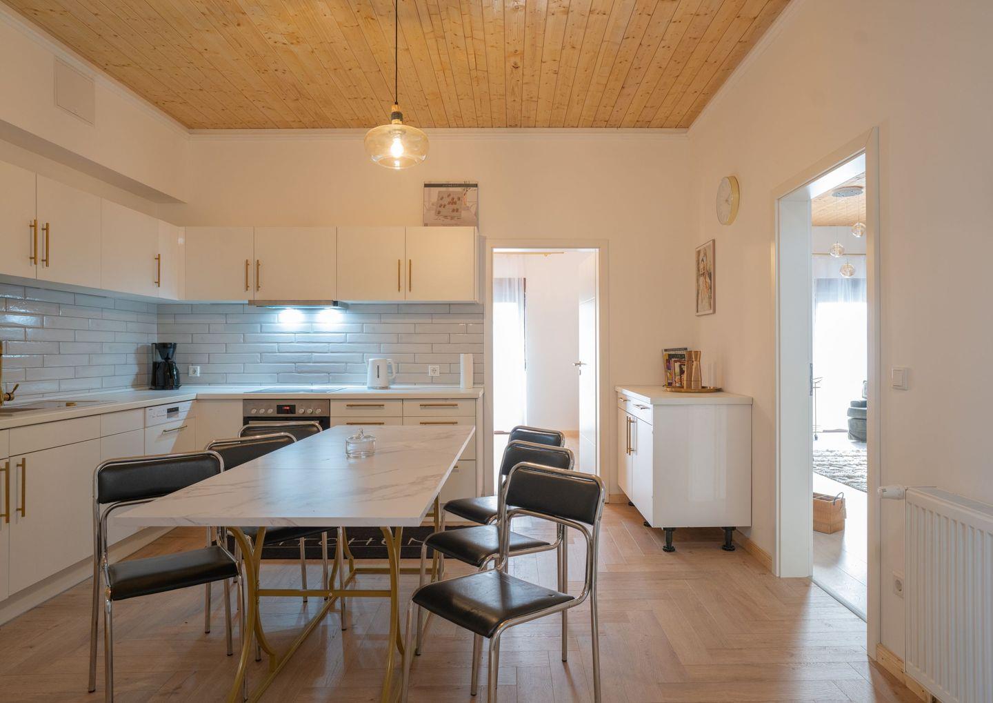 Die geschlossene Küche verfügt über einen Esstisch und ist mit Induktionsherd, Backofen, Spülmaschine sowie allen wichtigen Küchenutensilien ausgestattet. Hier können Sie bequem gemeinsam kochen und essen.