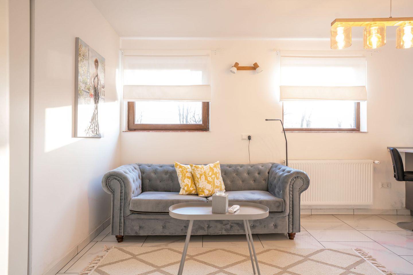 Der Wohnbereich ist mit Sofa, Esstisch und TV ausgestattet und wird durch eine offene Küche ergänzt, die zum Wohnzimmer hin gestaltet ist. So entsteht ein praktischer und kommunikativer Aufenthaltsbereich. Die Küche verfügt über einen Induktionsherd, Backofen, Kühlschrank mit integriertem Gefrierfach, Spülmaschine, Wasserkocher, Toaster, Mixer sowie Küchenutensilien, Geschirr und Besteck. Auch Geschirrhandtücher und eine Erstausstattung sind vorhanden, sodass Sie Ihren Aufenthalt unkompliziert beginnen können.