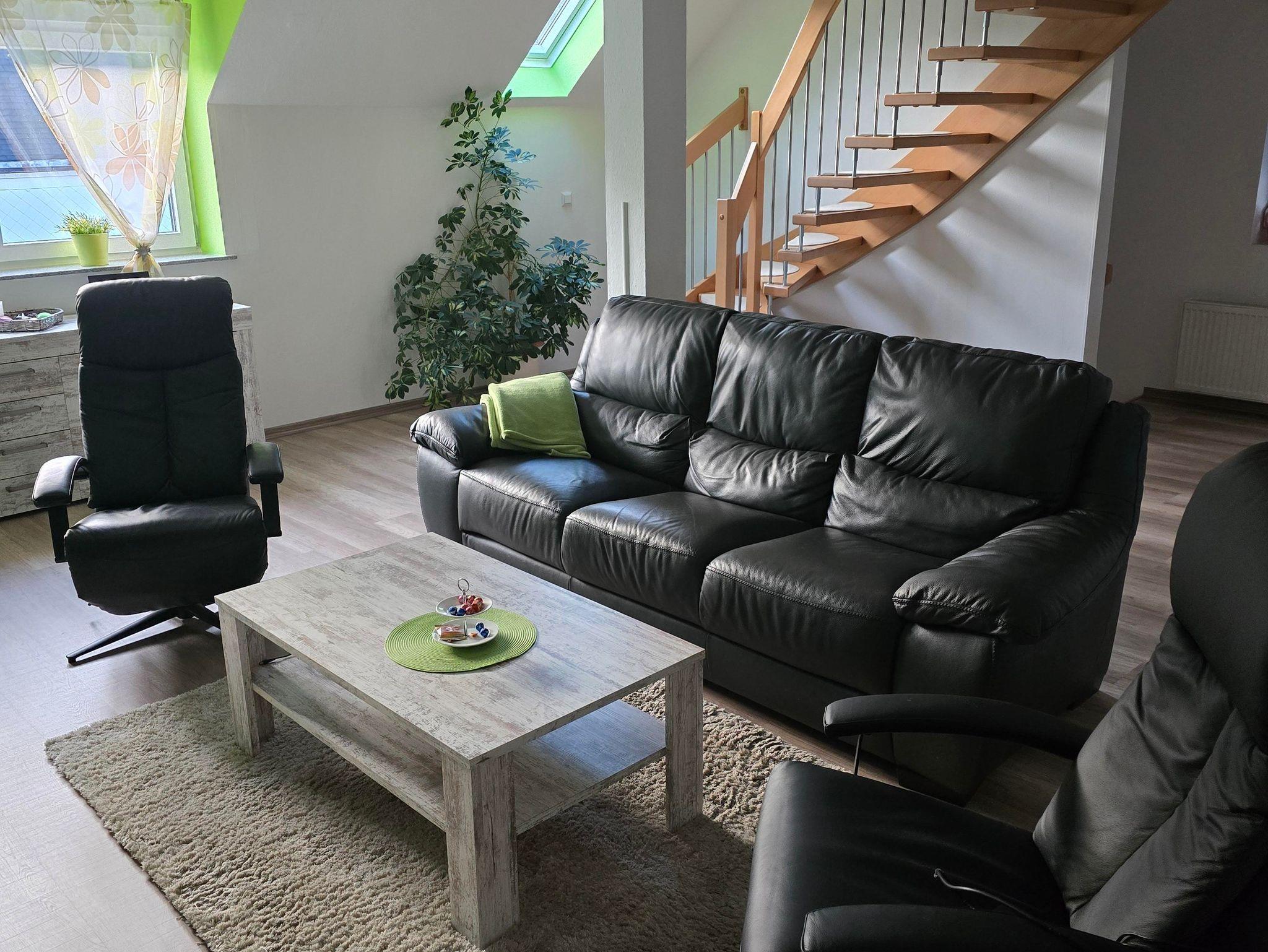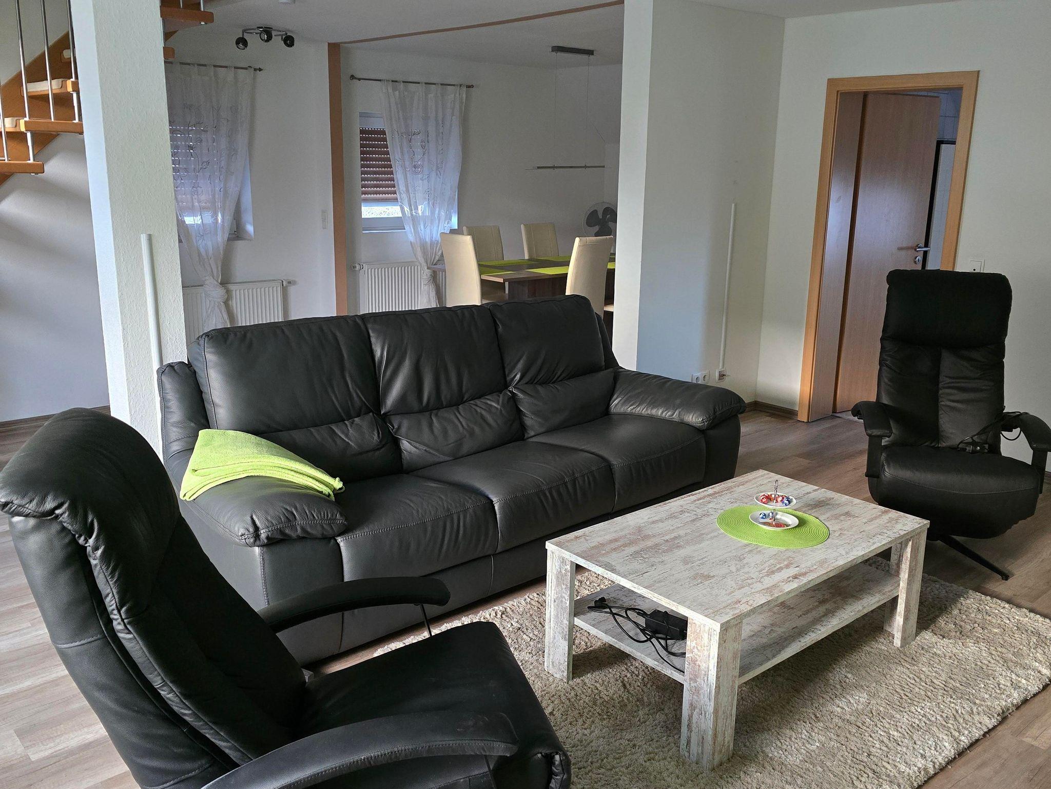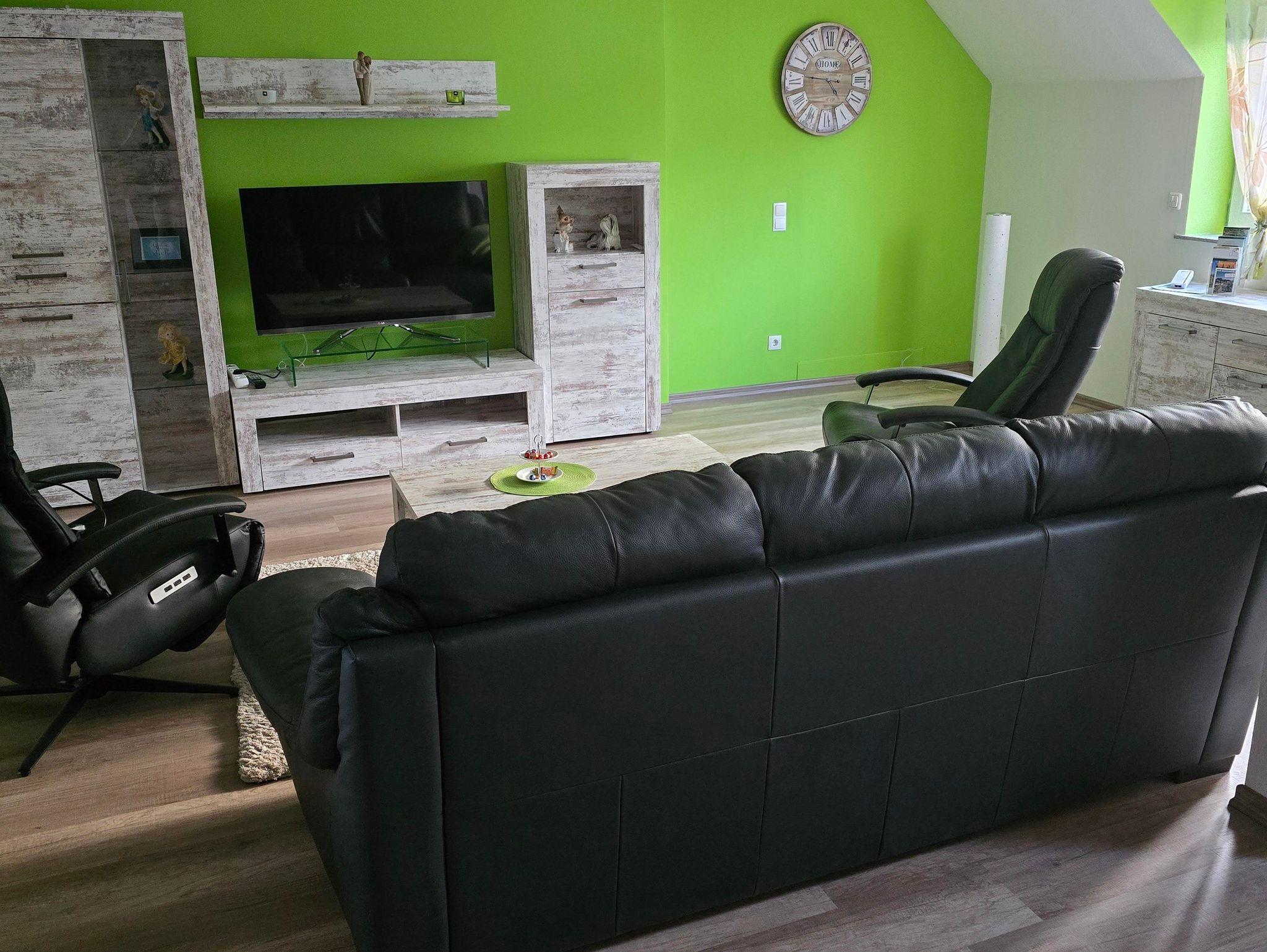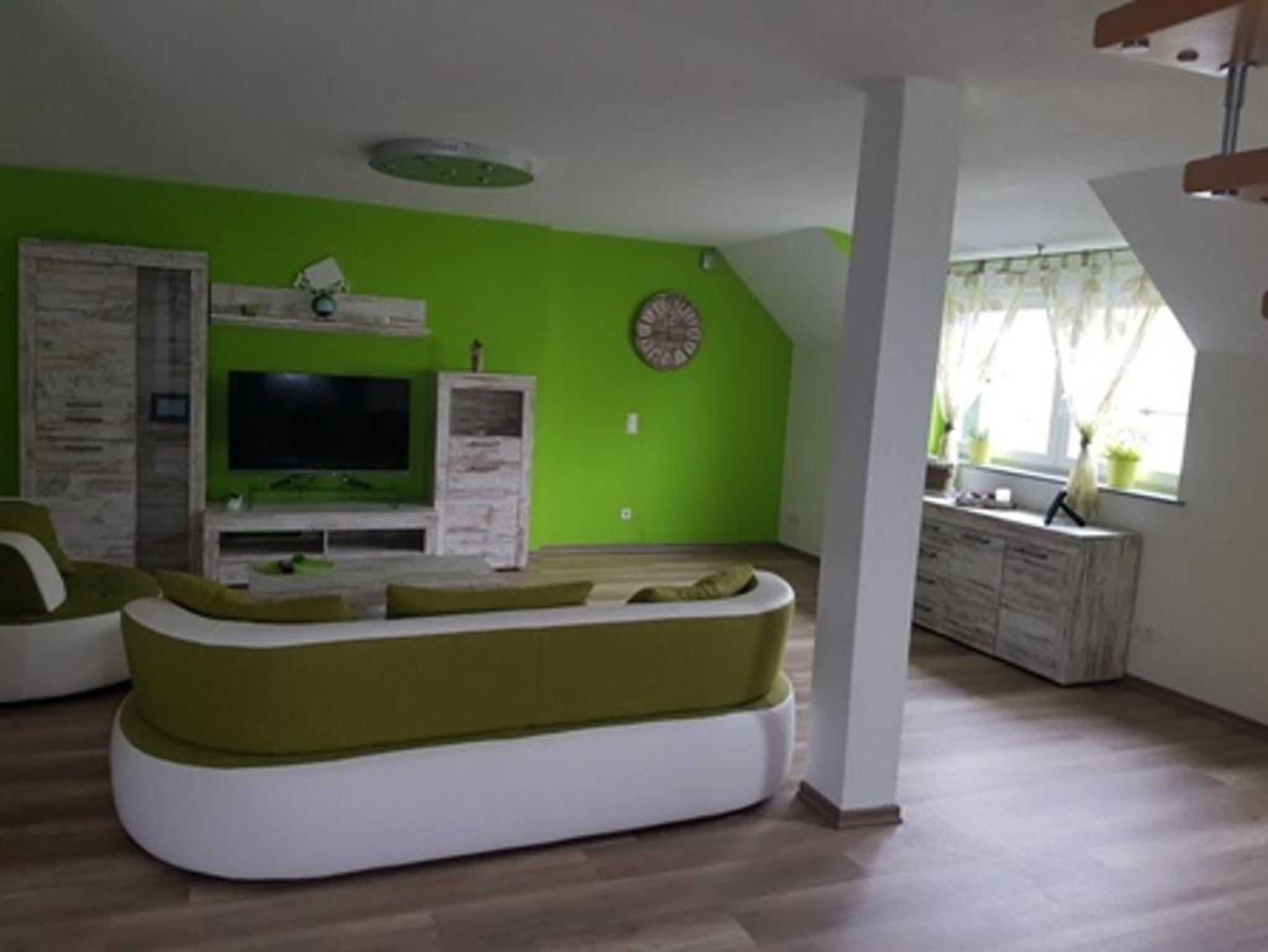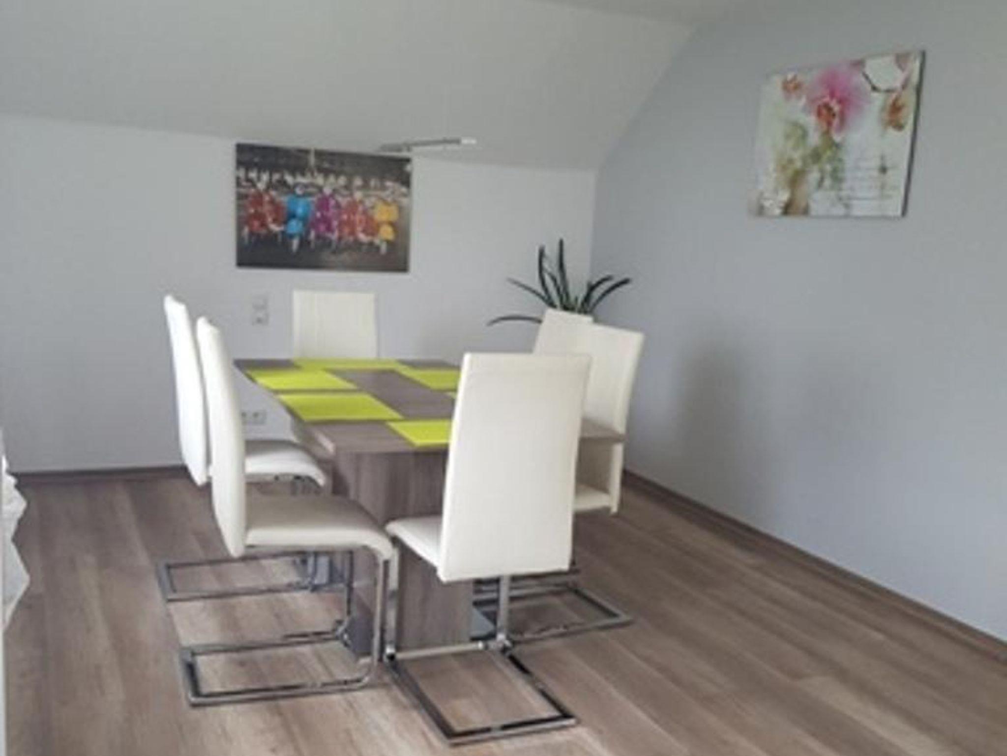 In der 2. Etage sind das Wohn-, Esszimmer mit Fernseher sowie ein Wannenbad.