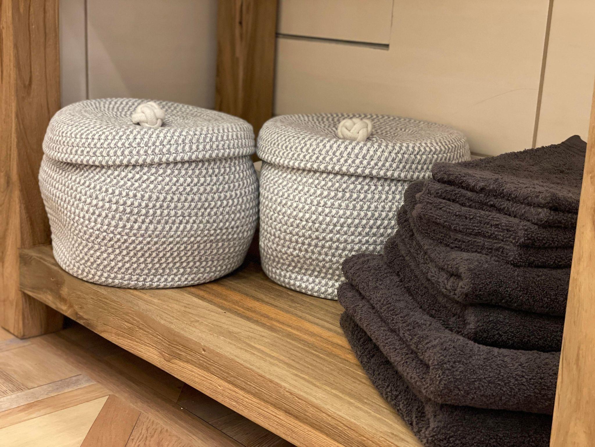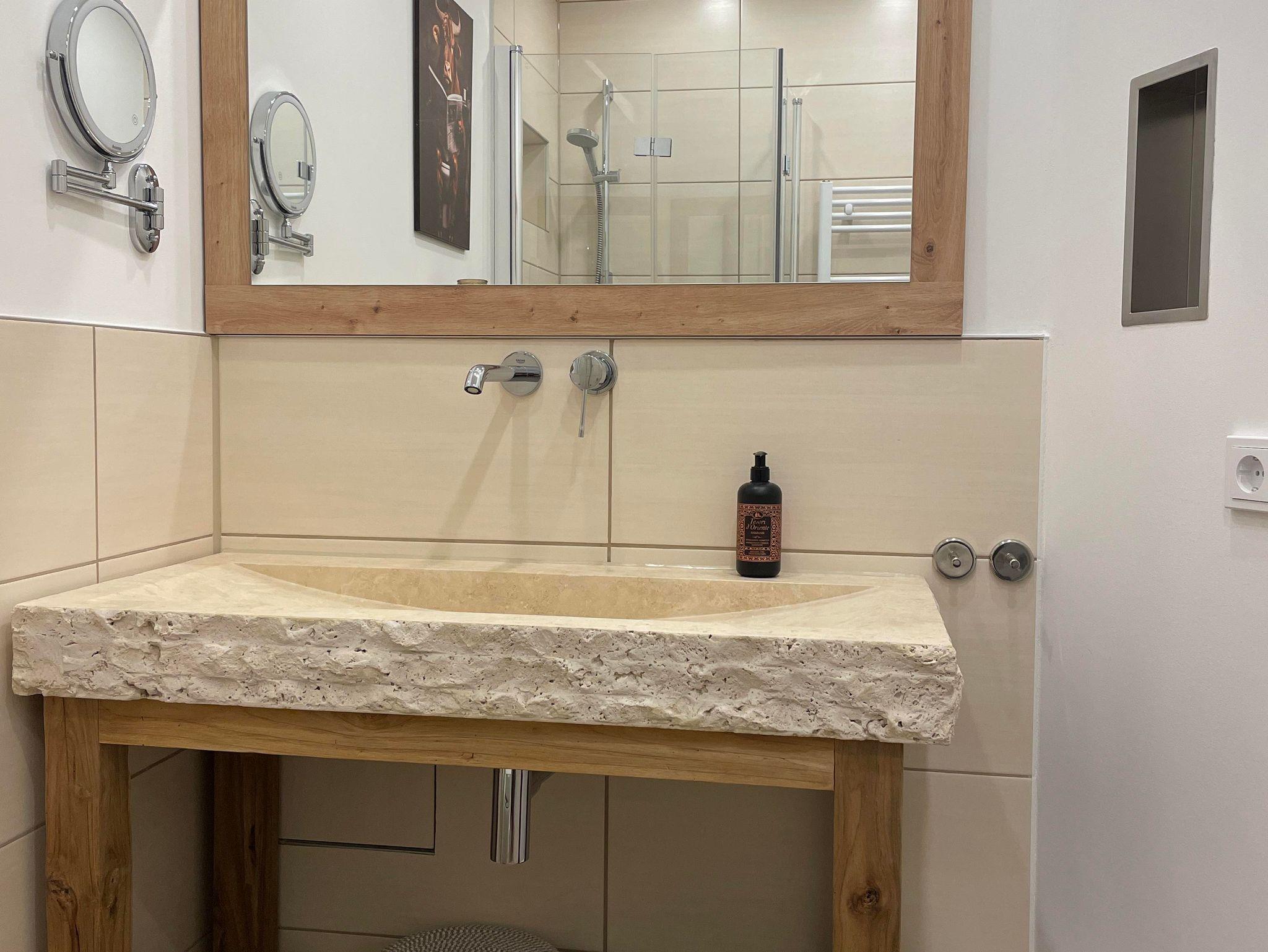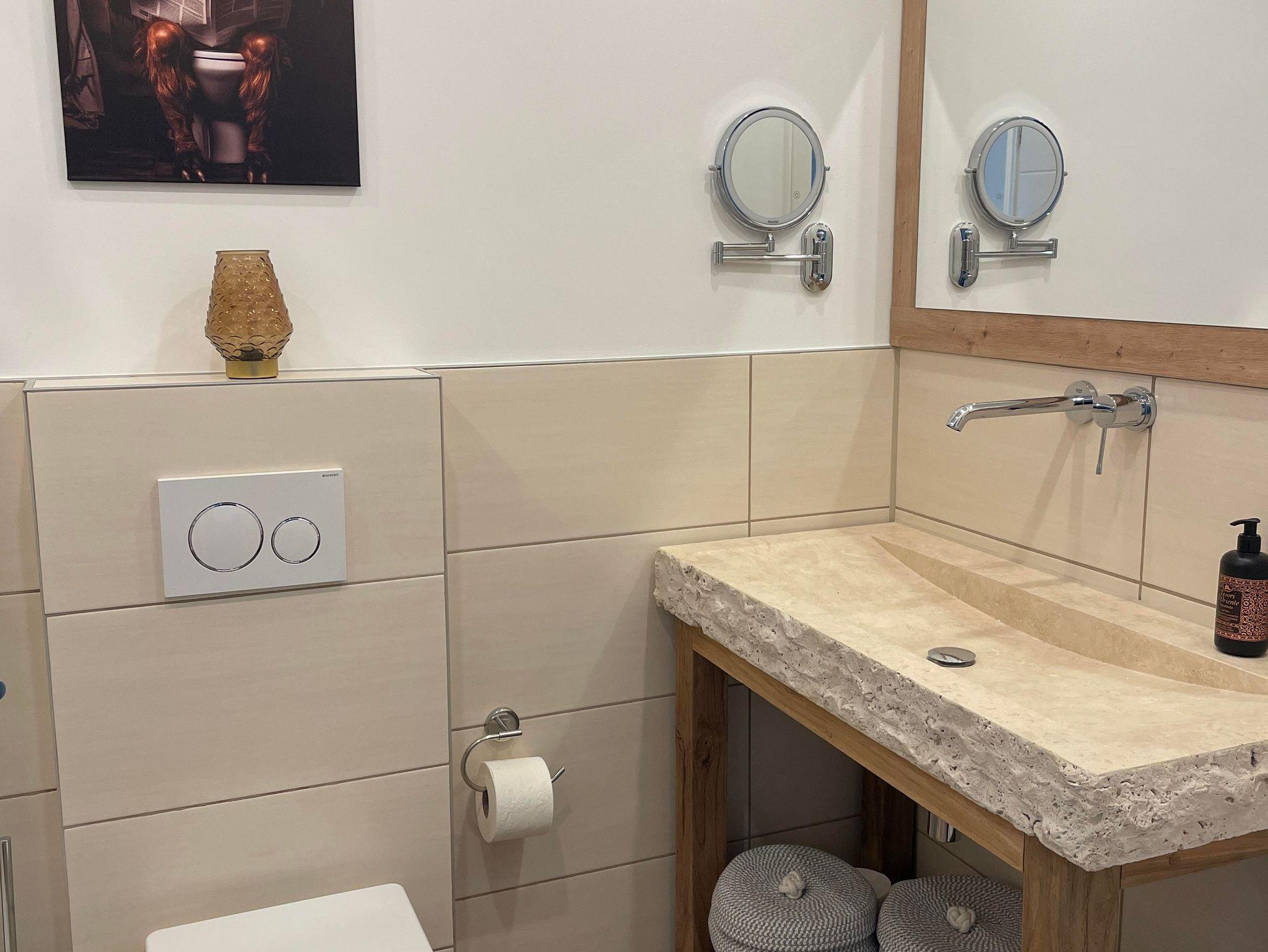 Badezimmer WC, Dusche, Hand- und Duschtücher, Kosmetikspiegel, Fön