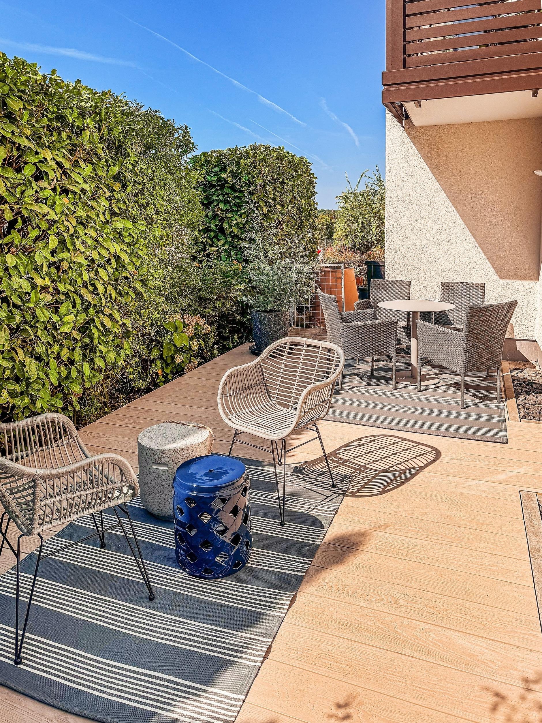 Ab Frühjahr 2024 sehr großzügige Terrasse im Außenbereich auf zwei Seiten der Ferienwohnung.
