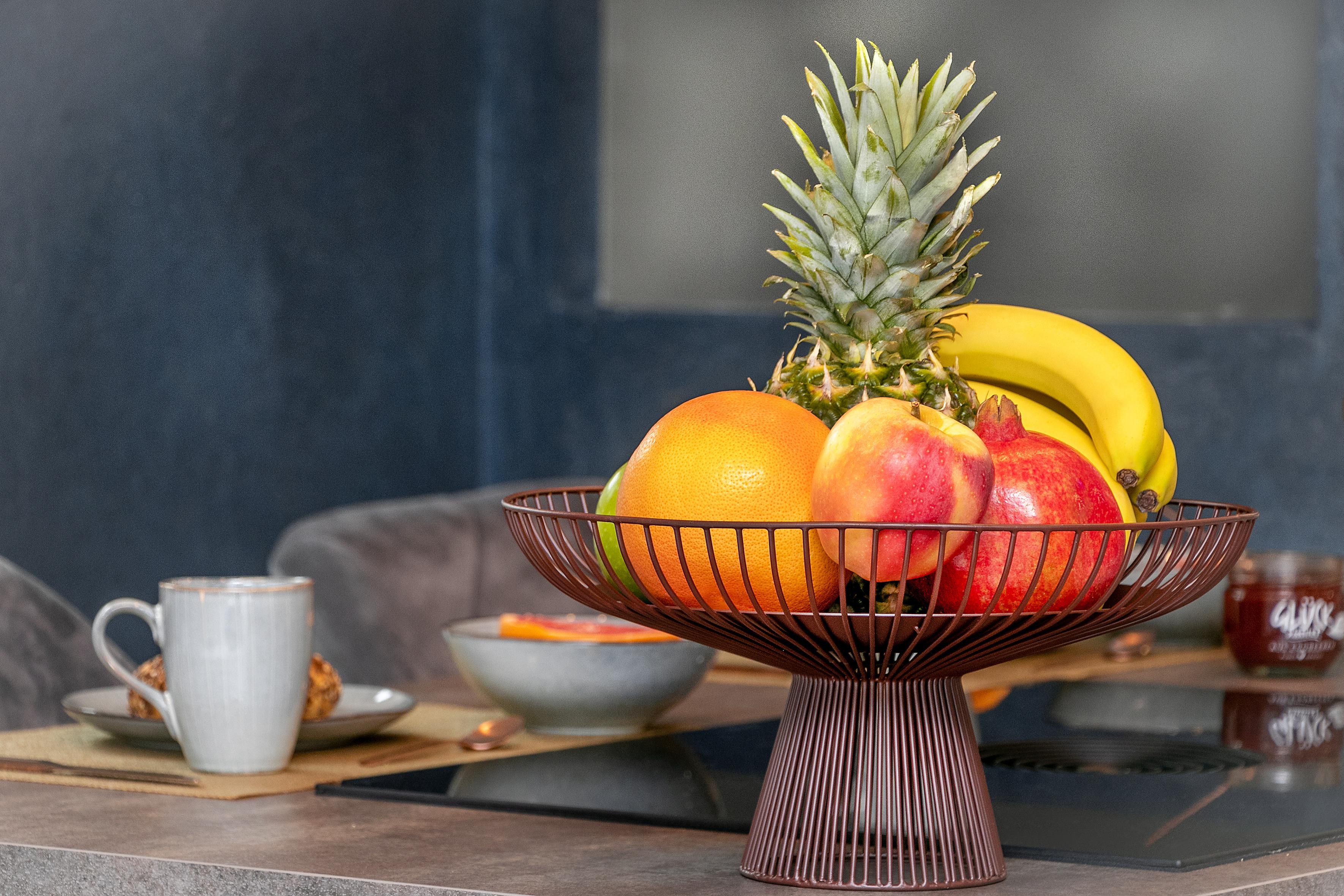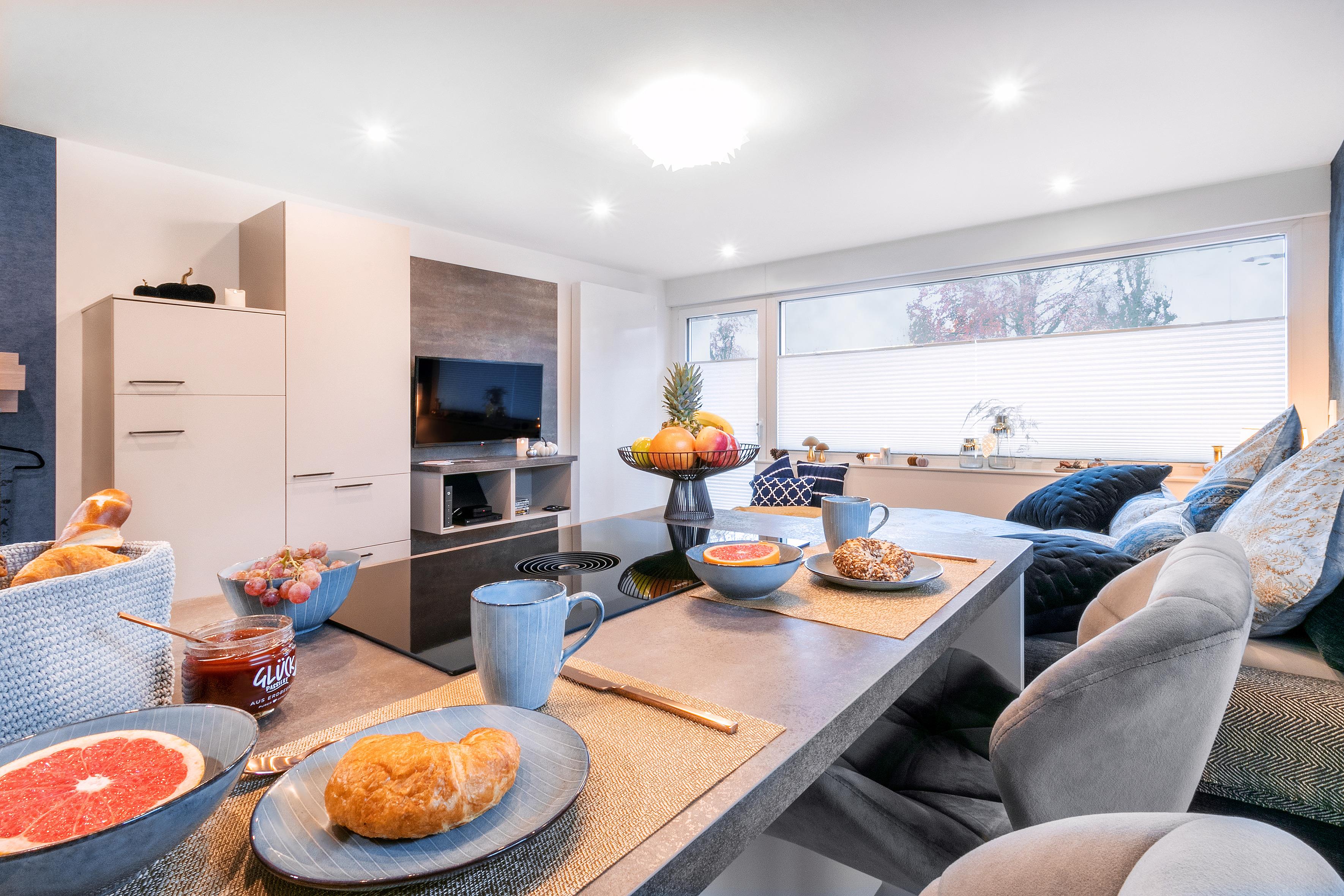 Die moderne Küche bietet neben Spüle, Kühlschrank, Backofen, Geschirrspüler und 4-Platten-Induktionsherd eine gemütliche Essecke und ausreichend Stauraum für Küchenutensilien sowie für Kleidung.