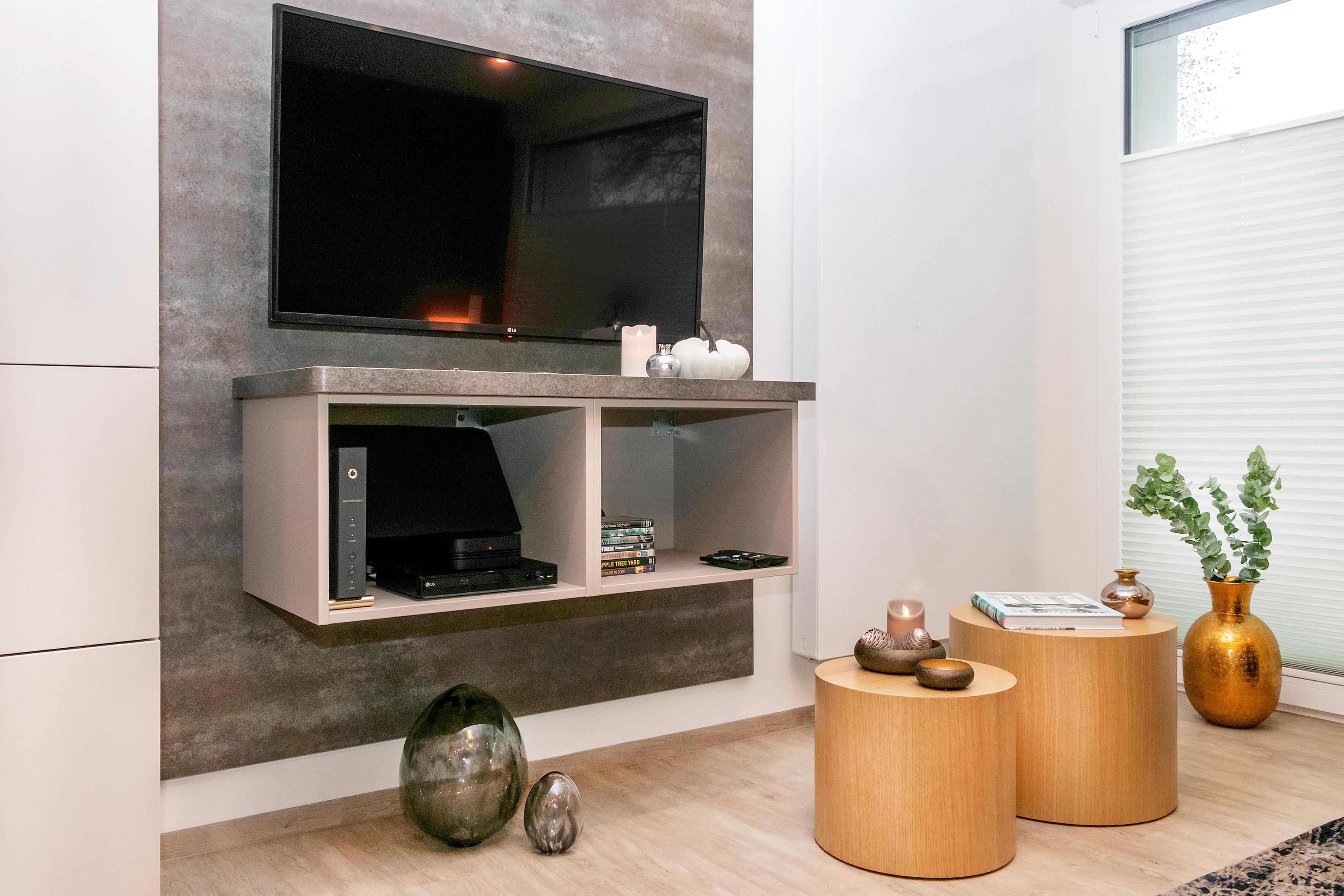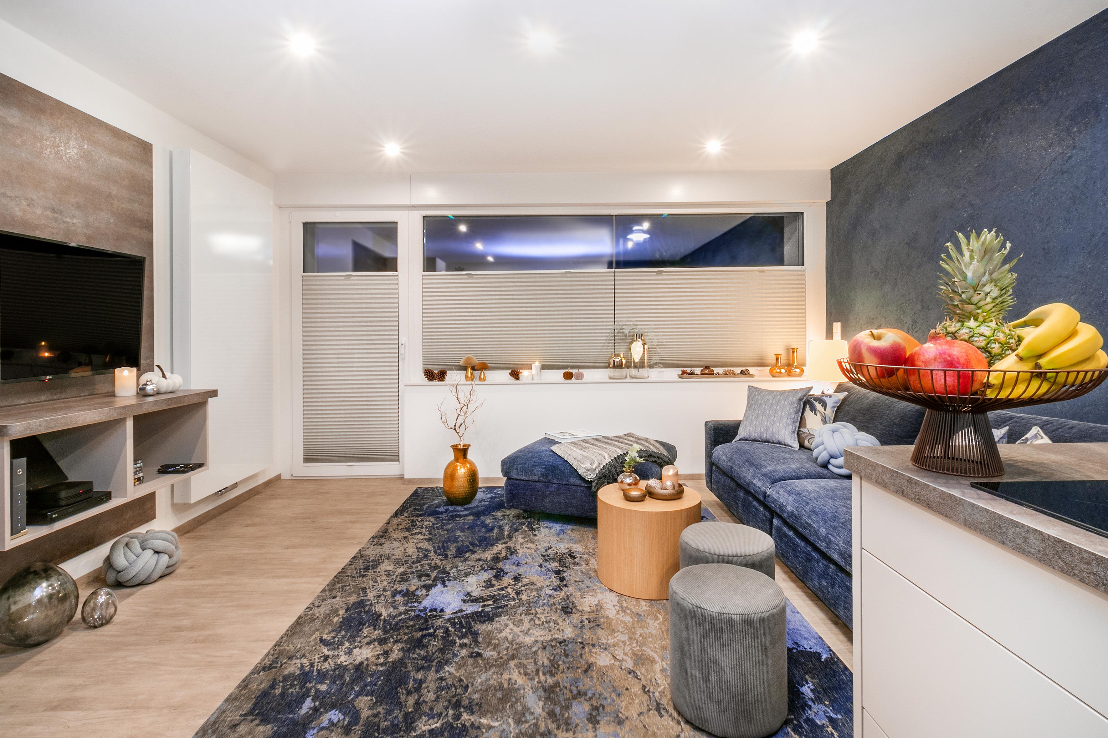 Gegenüber des kuscheligen, großzügigen und sehr hochwertigen Schlafsofas von Bo Concept befindet sich die Cine-Wall mit Flachbild-TV.